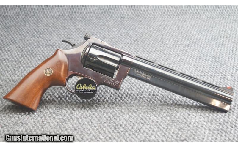 Description: Manufactured in 1982, this Dan Wesson Supermag is an absolute beast, with an 8" heavy barrel, full-length of 14", weight of 4 lbs, and a robust 6-round cylinder rated to withstand the pressure of the unique .357 Maximum caliber. It has remained in perfect condition with no blemishes to the metal, fully-intact bluing, and has strong defined rifling. The original wood grips are also in great shape with only a few small scratch marks on the bottom. No extras are included. .357 Remington Maximum Metal Condition: "Pristine condition, original bluing Wood Condition: "Original wood grips, slight blemish on bottom of grip Barrels: Rifled Weight: 4 lbs Sights: Iron Sights Item Location: Gainesville, VA Price: $1,299.99 Contact Seller |