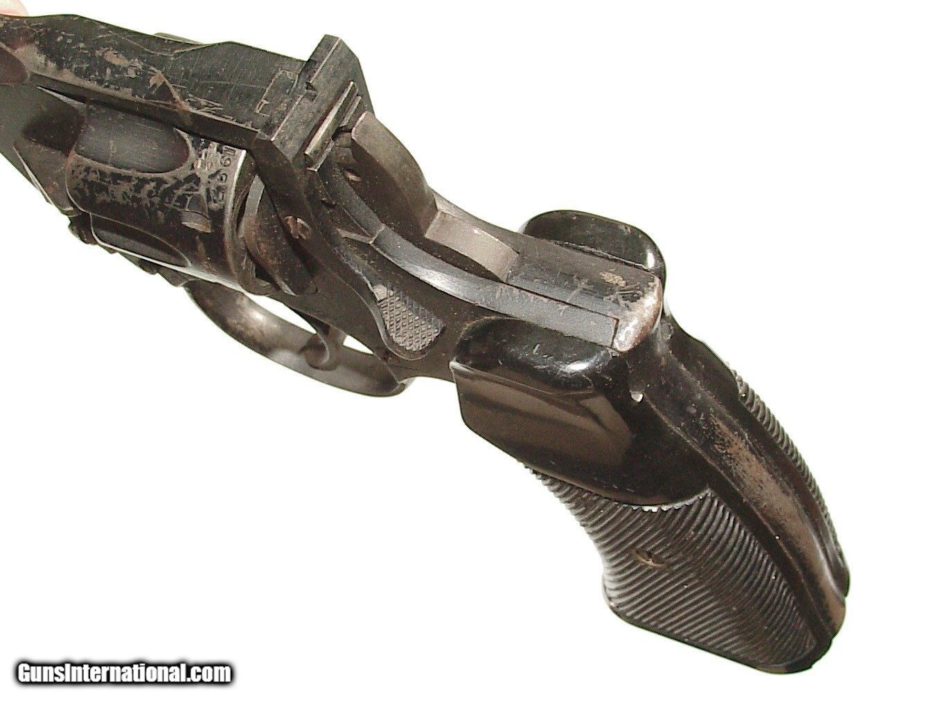 Description: .38-200 (S&W) caliber, 5" barrel with blade front sight. Double action with hinged frame and auto ejection. Finished in military blue with checkered plastic grips and lanyard ring on the butt. This appears to be a MK 1 altered to MK1* specifications during WWII where the hammer spur was removed. Remaining in used, issued condition and mechanically excellent. Mint bore. Curio/Relic: Yes Price: $650.00 Contact Seller |