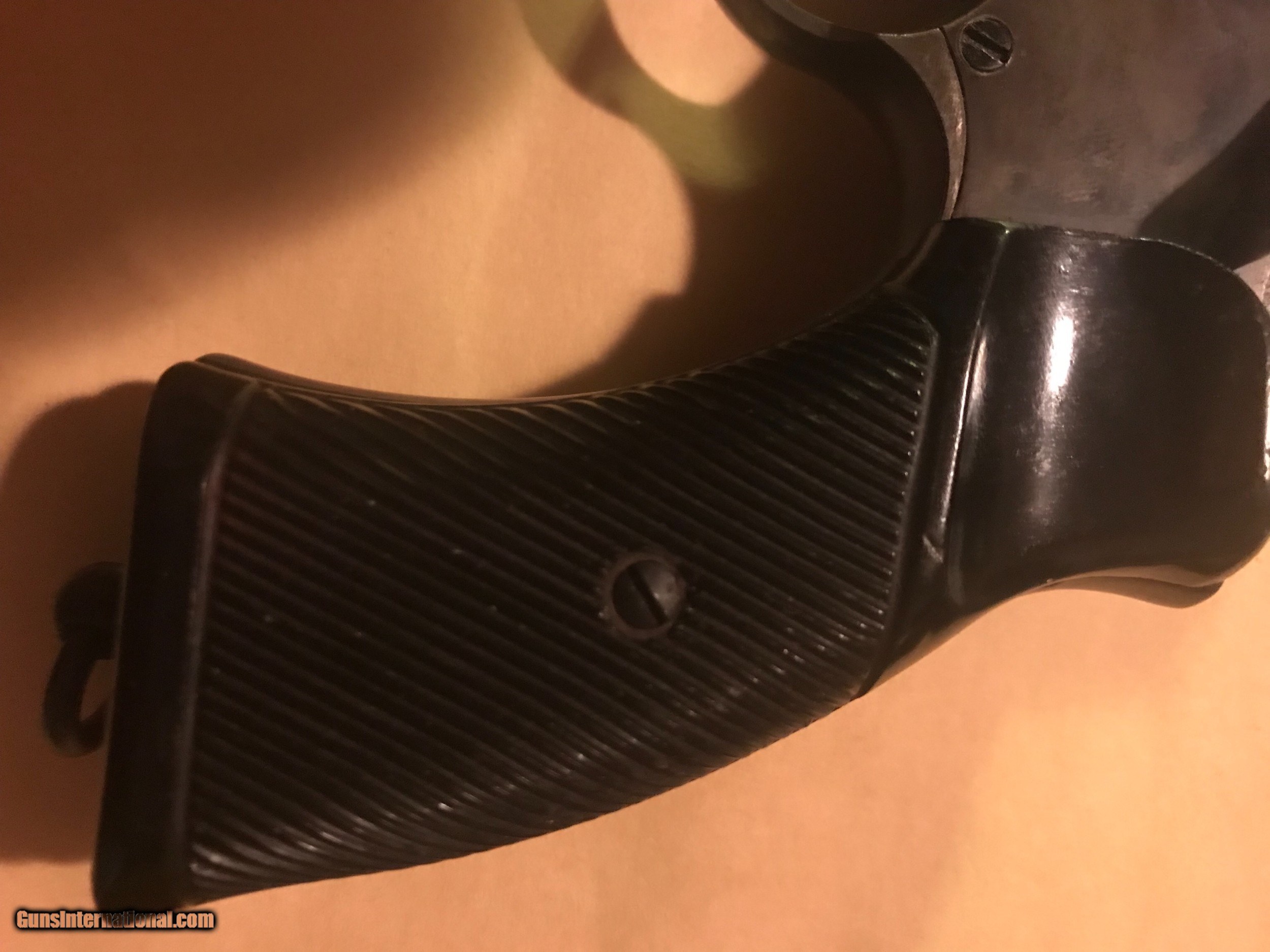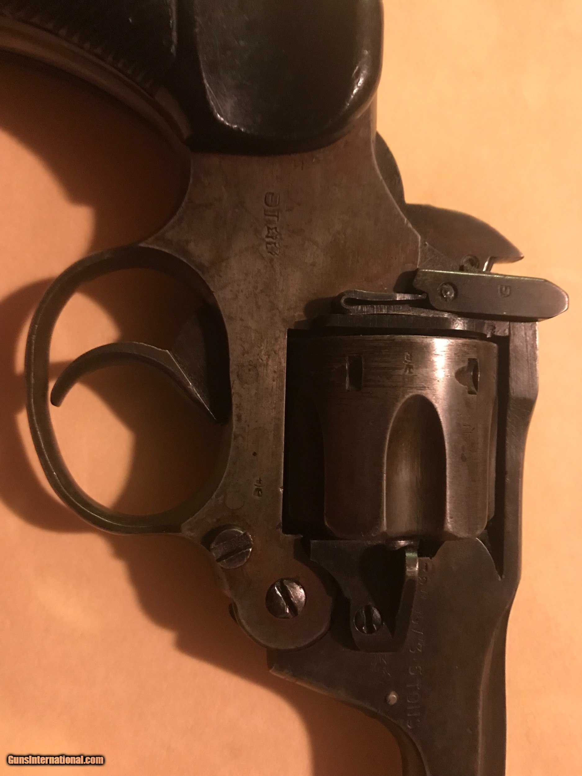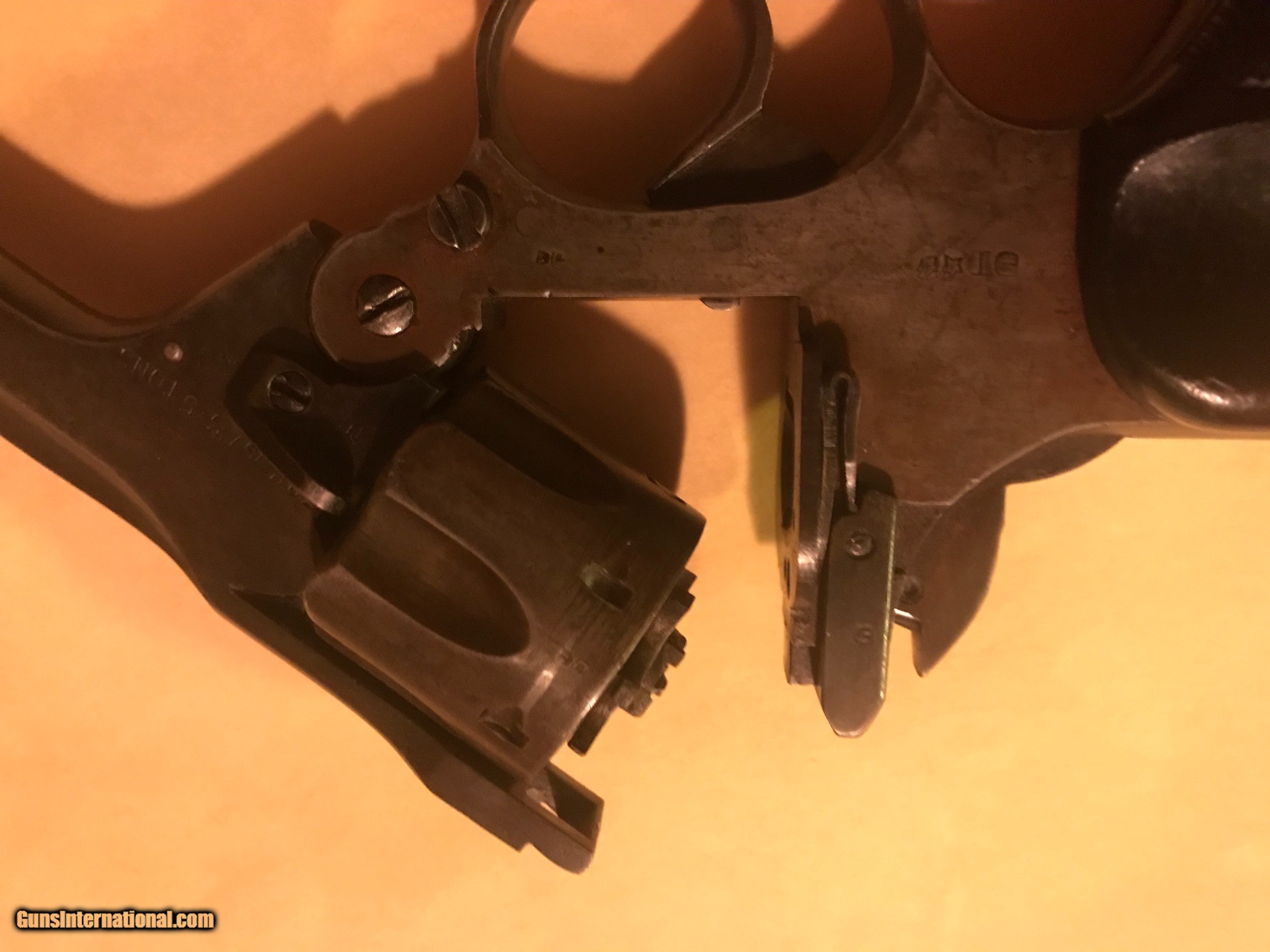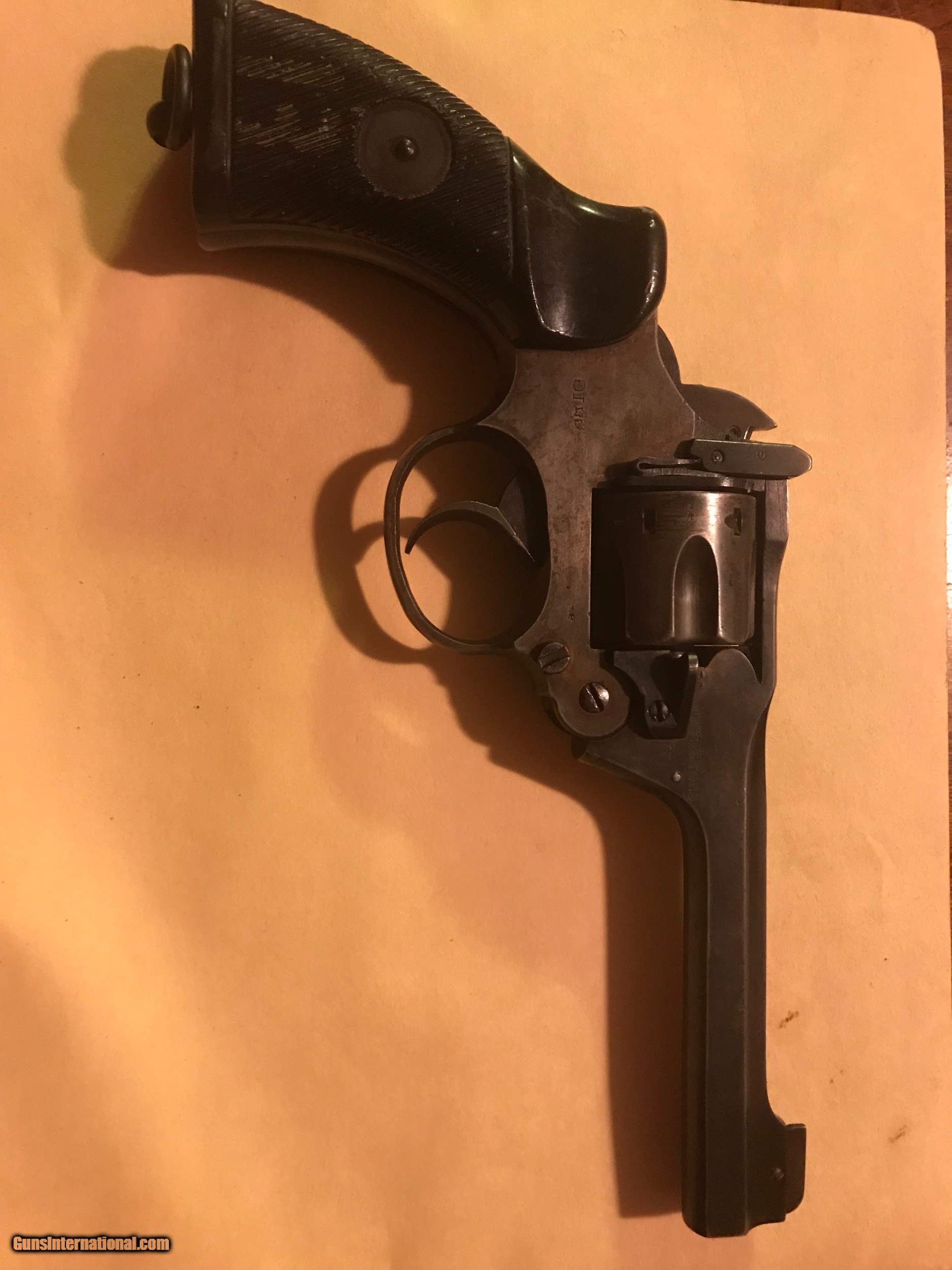 Description: Shipping fee: $35.00 WW II British. Mfg 1943. 6 shot revolver in caliber 38 S&W. Excellent condition overall. Original grips are excellent; original finish is 95% overall. Set # matching frame and cylinder. Bore is as new. Mechanic 100%. No import marks. Barrel Length 5”. Original DA only. A nice war time example. Revolver is not marked “war finish”. Nicely machined. Mfg for Royal Tank Regiment. SOLD Curio/Relic: Yes |