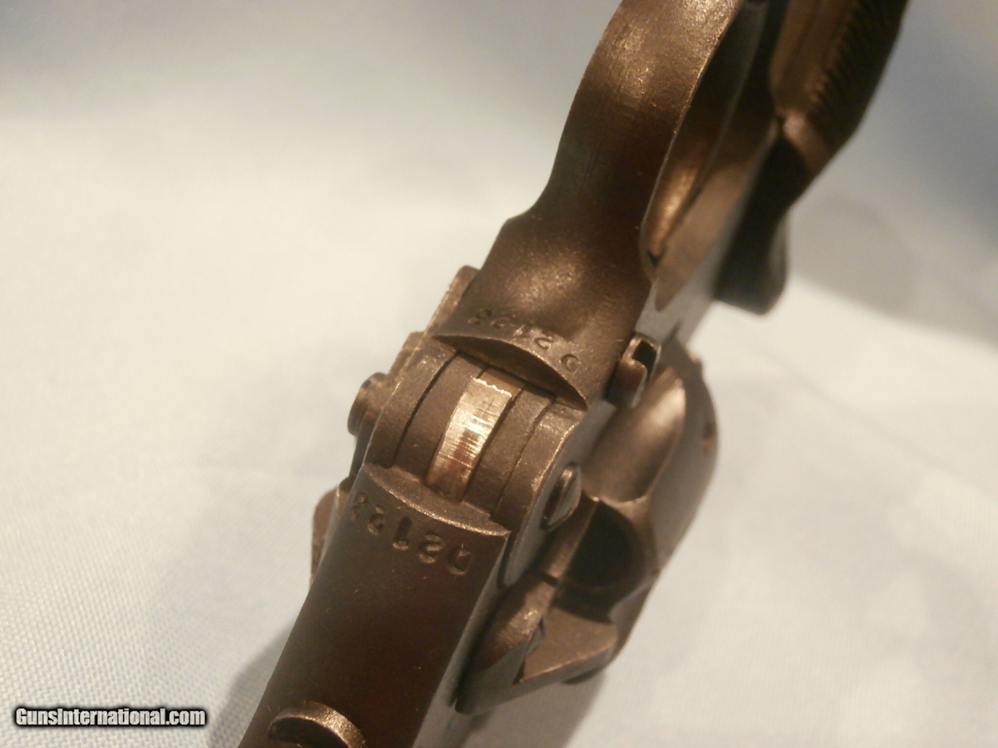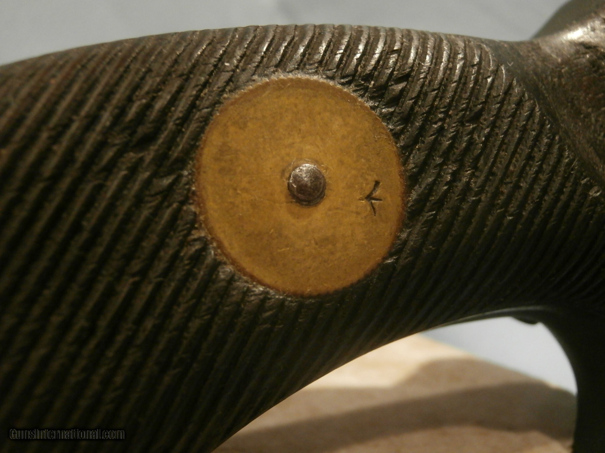 Description: WWII ALBION ENFIELD No.2 MK I** 2" BARREL "DETECTIVE COMMANDO" MODEL .38 S&W REVOLVER EXCELLENT OVERALL CONDITION!...SEE ALL PICS. ALL-MATCHING SERIAL NUMBERS!!...SEE ALL PICS. REEDED, BAKELITE GRIPS WITH AMBI THUMB RESTS AND MARKING DISC IN EXCELLENT CONDITION!...SEE PICS. MARKING DISC IS STAMPED WITH THE BRITISH "BROAD ARROW" ACCEPTANCE MARK...SEE ALL PICS. SMOOTH ACTION IS DAO AND HAS BEEN LIGHTENED. LANYARD LOOP IS PRESENT...SEE PICS. EXCELLENT BRIGHT & SHINY BORE WITH SHARP RIFLING!! SHORTENED "COMMANDO / DETECTIVE" 2" BARREL...SEE PICS. EXCELLENT MECHANICAL CONDITION!! 99% PARKERZIED FINISH REMAINS...SEE ALL PICS. Curio/Relic: Yes Handgun Caliber: .38 S&W (.38 Colt New Police, .38 Super Police) Manufacturer: ALBION Model: No.2 MKII** 1943 Serial Number: D21XX Barrel Length: 2" COMMANDO BARREL Bore Info: BRIGHT & SHINY! Chambers: ALL CHAMBERS BRIGHT & SHINY! Ejectors: STAR EJECTOR OPERATES PERFECTLY! Condition: EXCELLNT VINTAGE MILITARY! Metal Condition: EXCELLENT VINTAGE MILITARY! Bore Condition: EXCELLENT! BRIGHT & SHINY! Barrels: 2" COMMANDO BARREL Action: D/A ONLY Triggers: SMOOTH Stock: ORIGINAL REEDED BAKELITE W/MARKING DISC Finish: EXCELLENT VINTAGE!! Sights: FIXED Manufacture Date: c. 1943 Grips: ORIGINAL, REEDED BAKELITE W/MARKING DISC Price: $649.00 Contact Seller |
