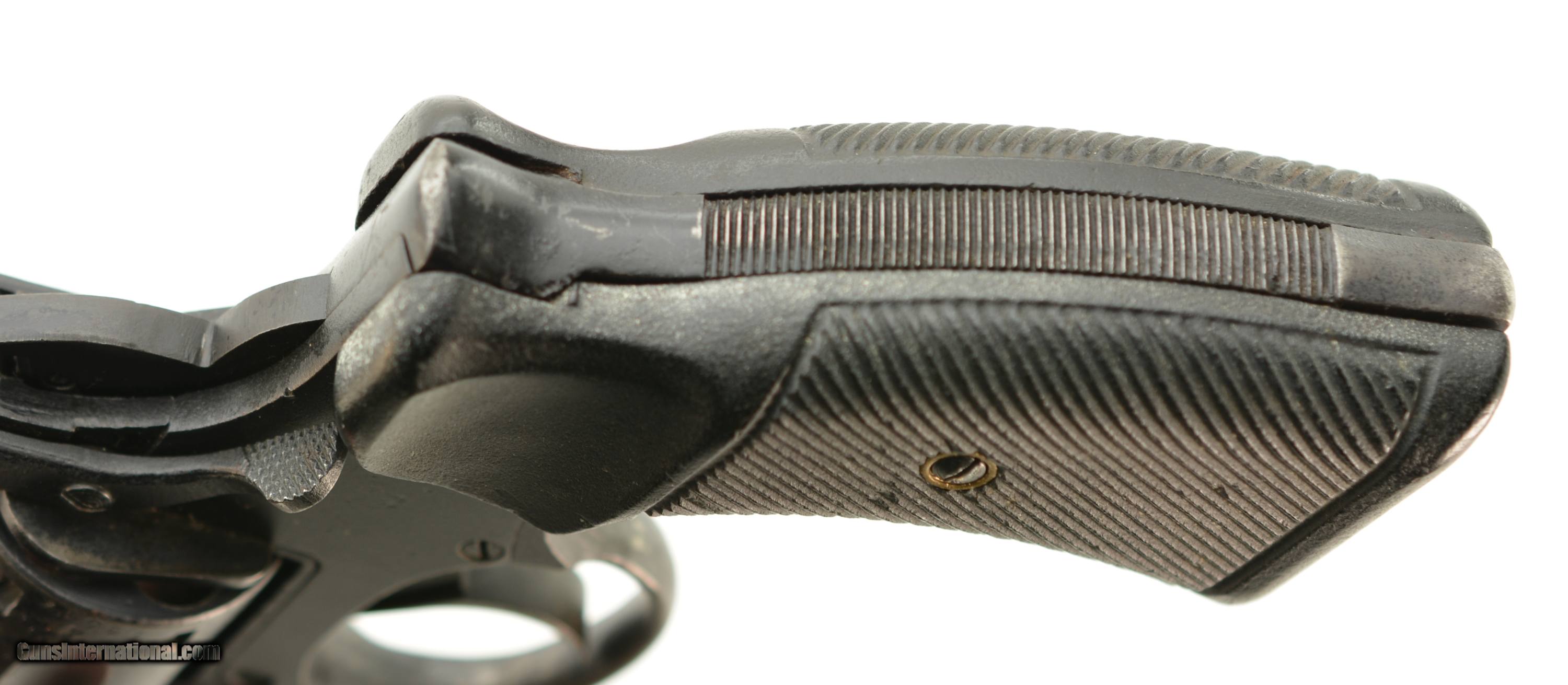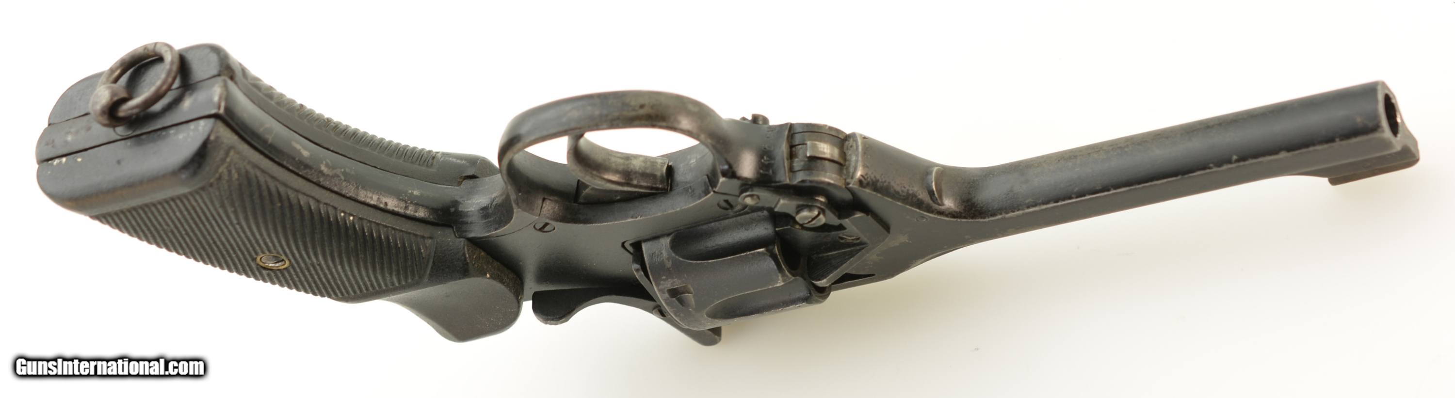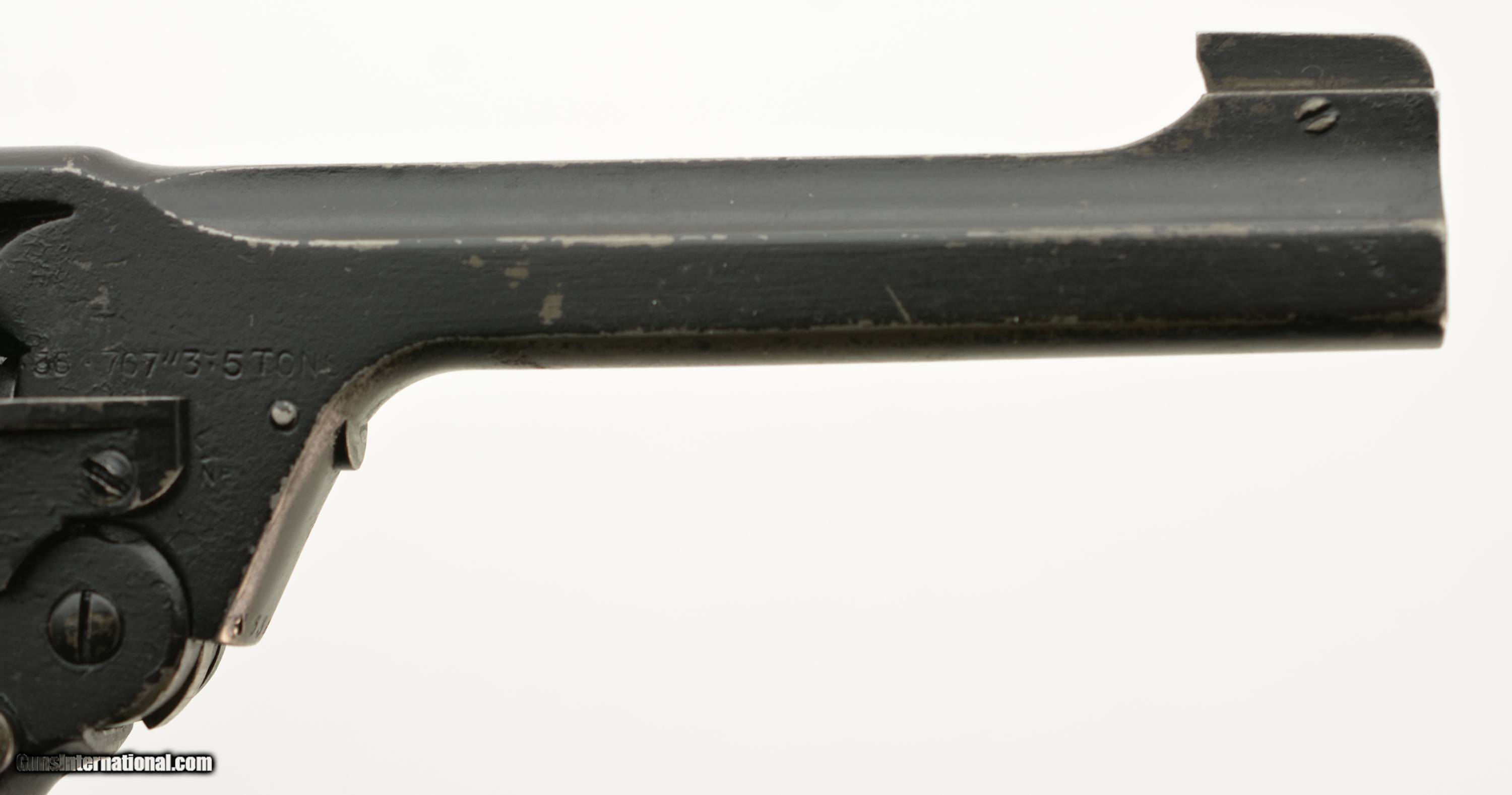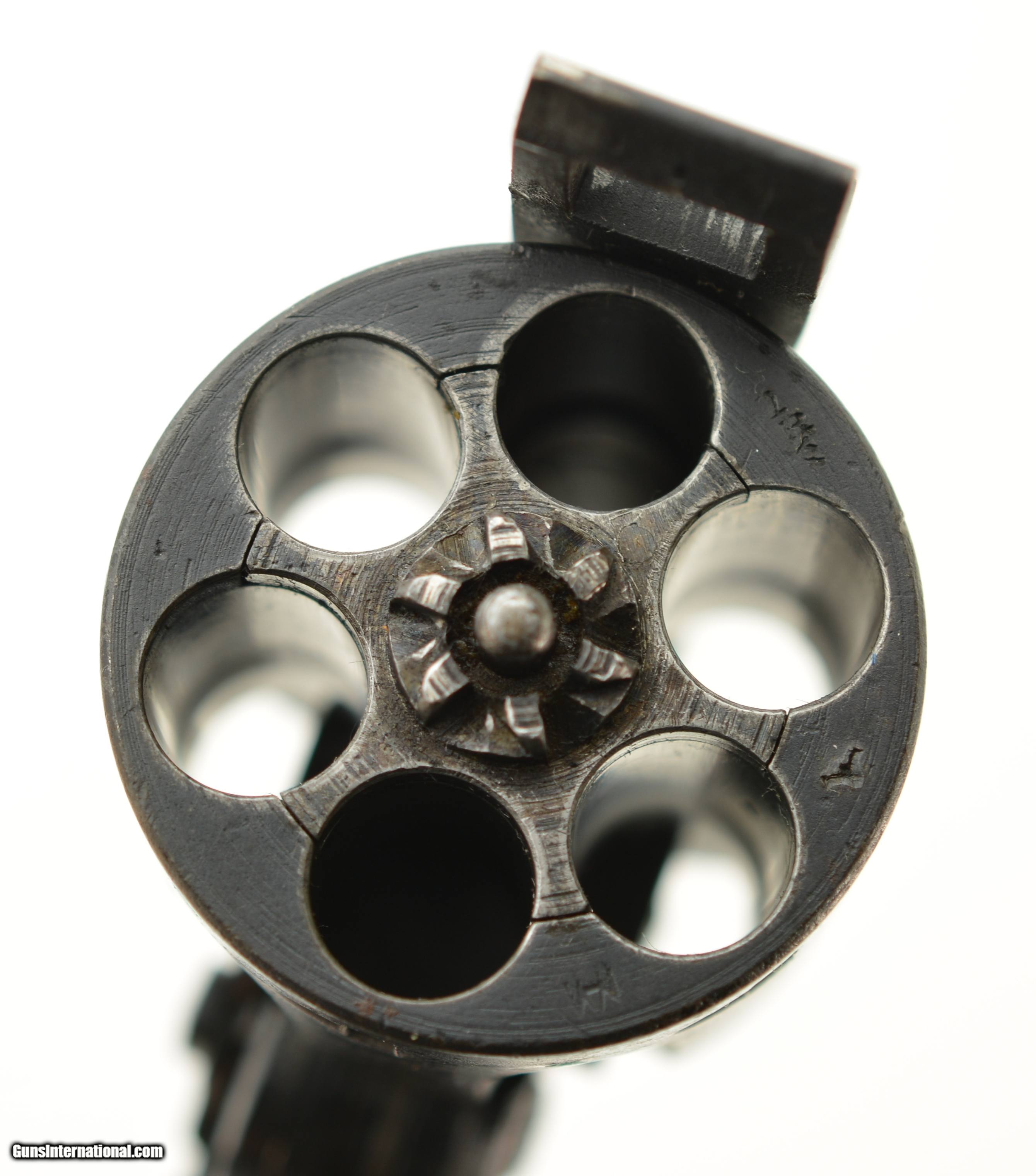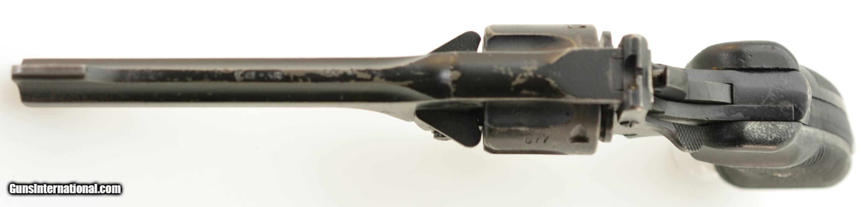 Description: Serial #A5347, .38/200 British (.38 S&W), 5" barrel with an excellent, bright bore. This is a 1942 dated, Albion-made revolver that has matching numbers on the frame, barrel, and cylinder. The metal retains 80-85% of the wartime Suncorite finish that has flaked to the underlying matte blue, and silvered slightly along the high and exposed edges. The cylinder has the “G77" batch code which is significant due to these being the only bobbed hammer models that retained the single-action lock. Postwar London proofs are also present. The grooved composite grips are in good-very good shape with numerous small handling marks and blemishes throughout, and both the Albion “AM" stamp and flaming bomb unit marking for the Grenadier Guards are present on the brass disk on the right side. This is a fine-near excellent example of a war-dated Enfield, with highly desirable unit marking. FFL or C&R SOLD Curio/Relic: Yes Manufacturer: Enfield Model: No.2 Caliber Info: .38 S&W Gauge Info: .38 S&W |