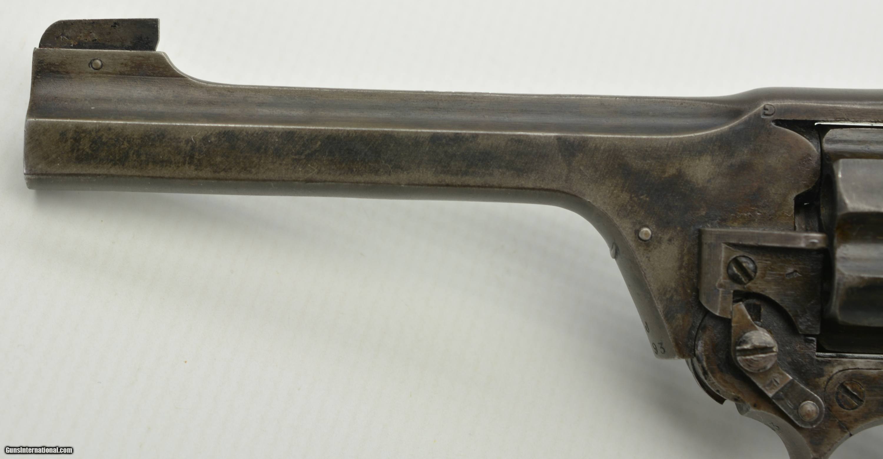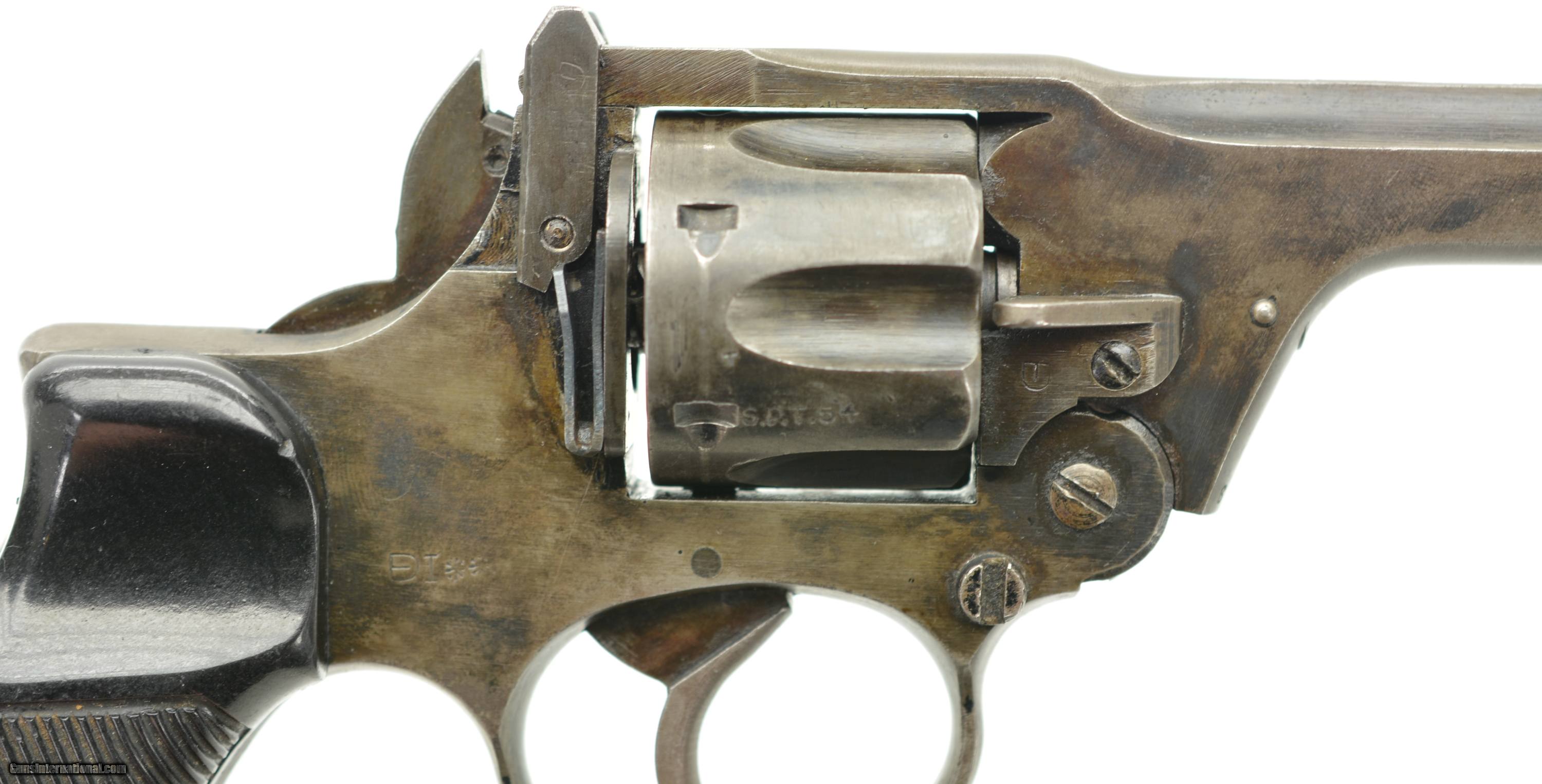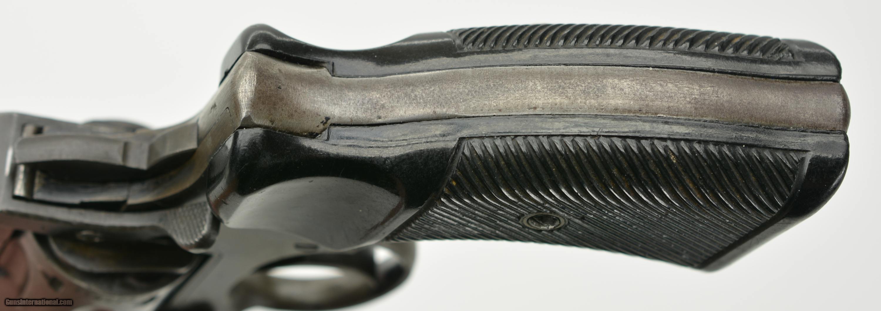 Description: Serial #ZJ6693, .38/200 British, 5 inch barrel with an excellent, bright bore. This 1945 dated, double-action only revolver has matching numbers on the frame, cylinder, and barrel with the metal retaining about 50-60% of the wartime matte blue finish, and a mottled plum-brown patina on the balance. There is some further silvering at the muzzle, as well as along the high edges and projections. The grooved Bakelite grips are in fine shape with some minor handling marks and small chips on both panels. The brass disk has been etched with a decorative rose motif at some point, and the lock-up is tight, and the mechanism fully functional. This is one of the last batch of Enfield .38 revolvers, as the highest known serial is in the ZJ7xxx range. This example is in very good plus condition overall. FFL or C&R SOLD Curio/Relic: Yes Manufacturer: British Model: No. 2 Serial Number: ZJ6693 Caliber Info: .38 S&W Gauge Info: .38 S&W |