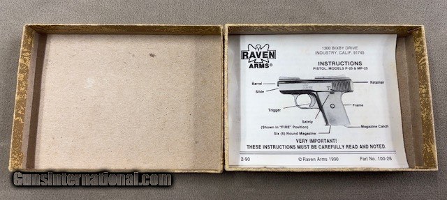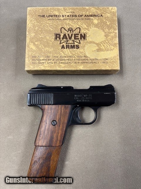 Description: In 55+ Years i have sold hundreds of Raven MP-25 pistols - blued, chrome, whatever. But I have never seen or heard of one with a factory 12 round magazine as this example has. As .25 autos have become very collectible this has to rate with the most elusive of them all. Possibly a factory prototype? And to have the original box numbered to the pistol, along with the original brochure; now that is something! Handgun Caliber: .25 ACP (6.35mm Browning, 6.35×16mmSR) Price: $299.00 Contact Seller |