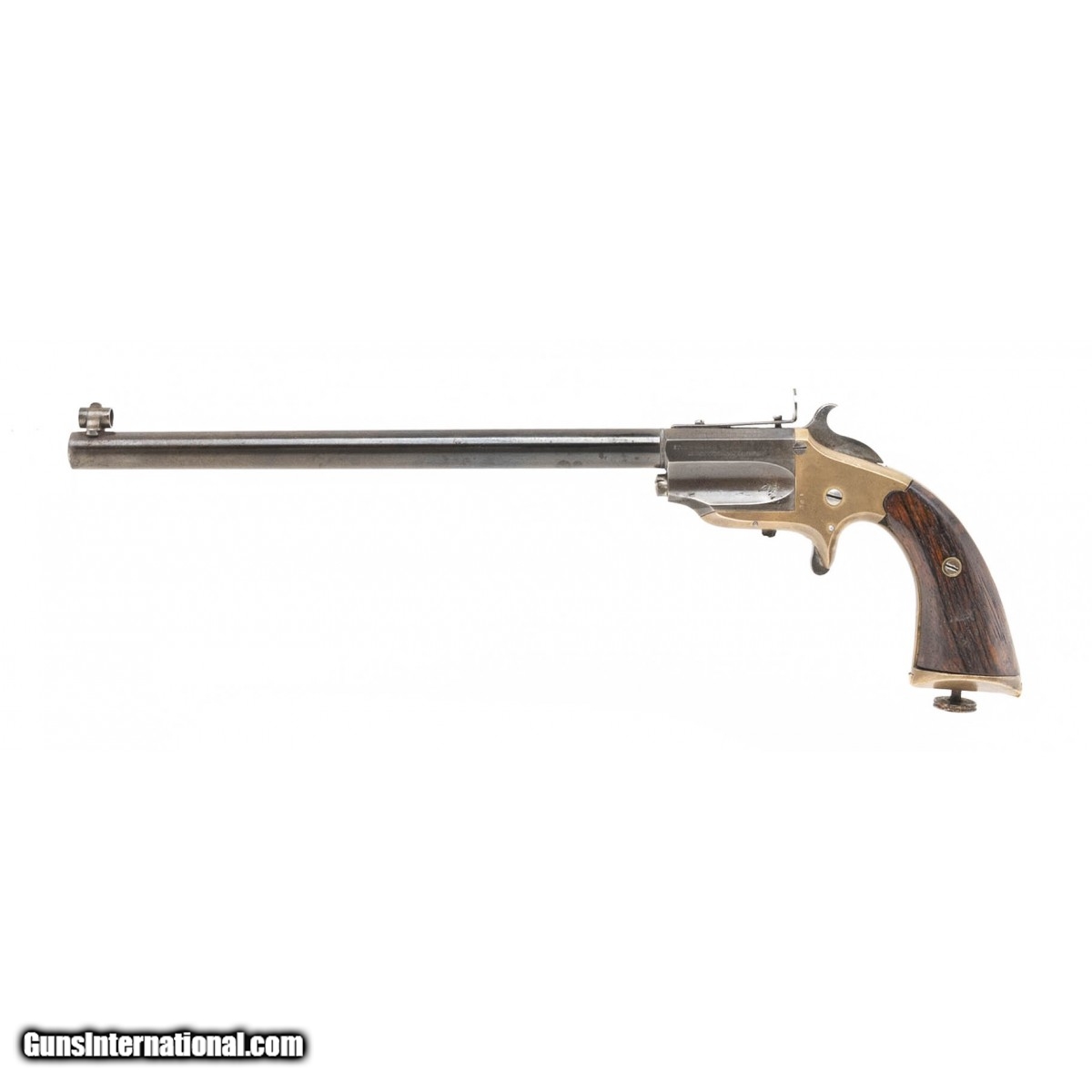Second model target pistol with 10"" barrel. Bore has strong rifling with pitting. Right side manual ejector slide. The remnant of the shoulder stock is still in the slot for the shoulder stock. Action works perfectly. A hard to find Frank Wesson Pocket Rifle!