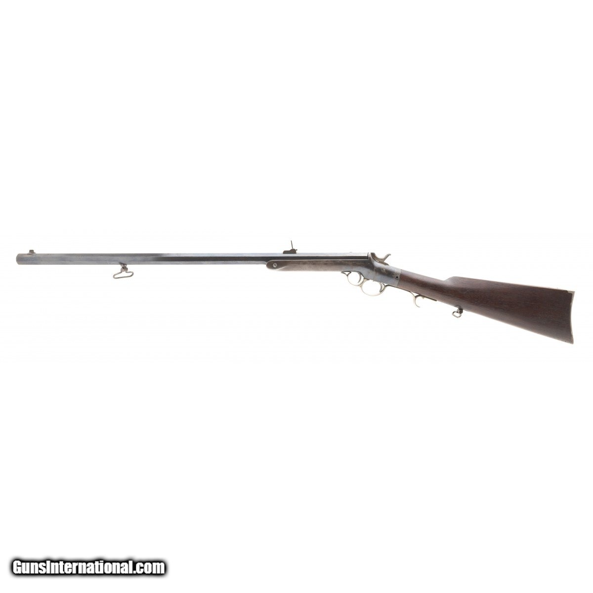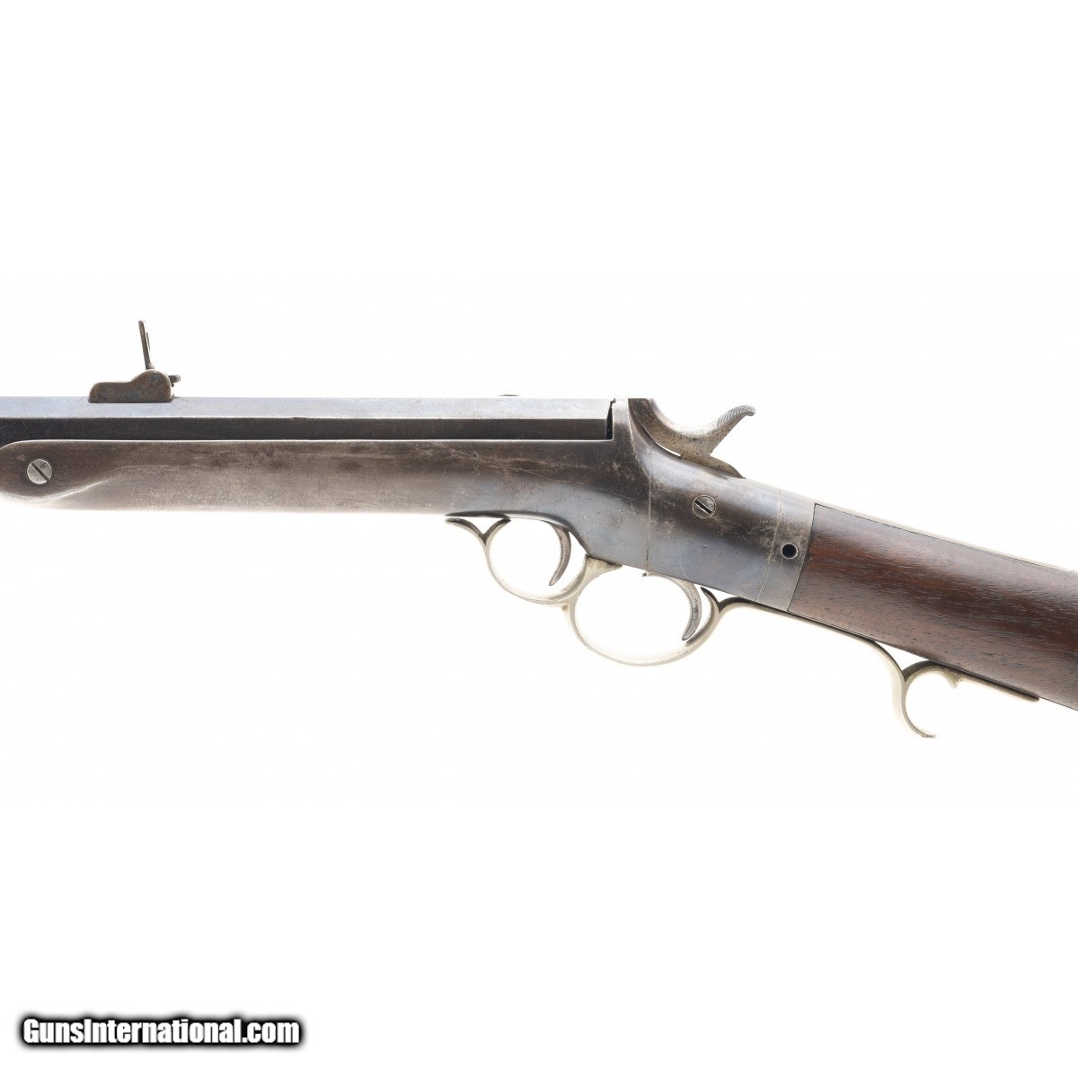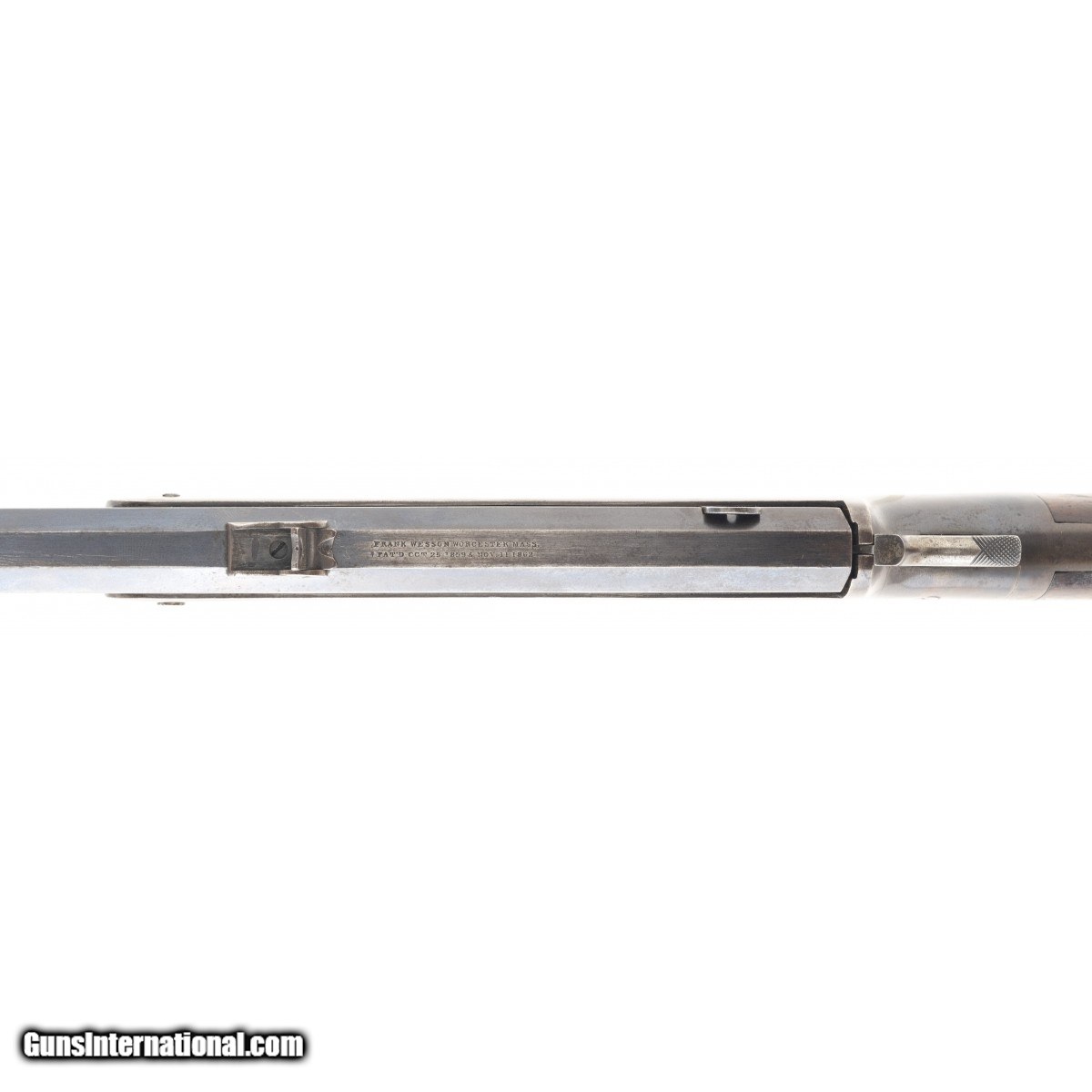 Description: " The Frank Wesson company of Worcester, MA, manufactured approx. 4,500 Frank Wesson 44 rimfire military carbines with 24"" octagon barrels and sling swivels. This carbine is in fine condition with approx. 90% barrel blue. The bore is very good with some erosion. The frame is a pleasing blue-brown. Both swivels are present. The stock is excellent with no cracks or chips. The German silver plated trigger guard and butt plate are fine. The top of the barrel is marked FRANK WESSON WORCESTER MASS. over PAT'D OCT 25 1859 & NOV 11 1862. The action functions correctly. This is a very fine Civil War era Frank Wesson military carbine. SOLD Antique: Yes |