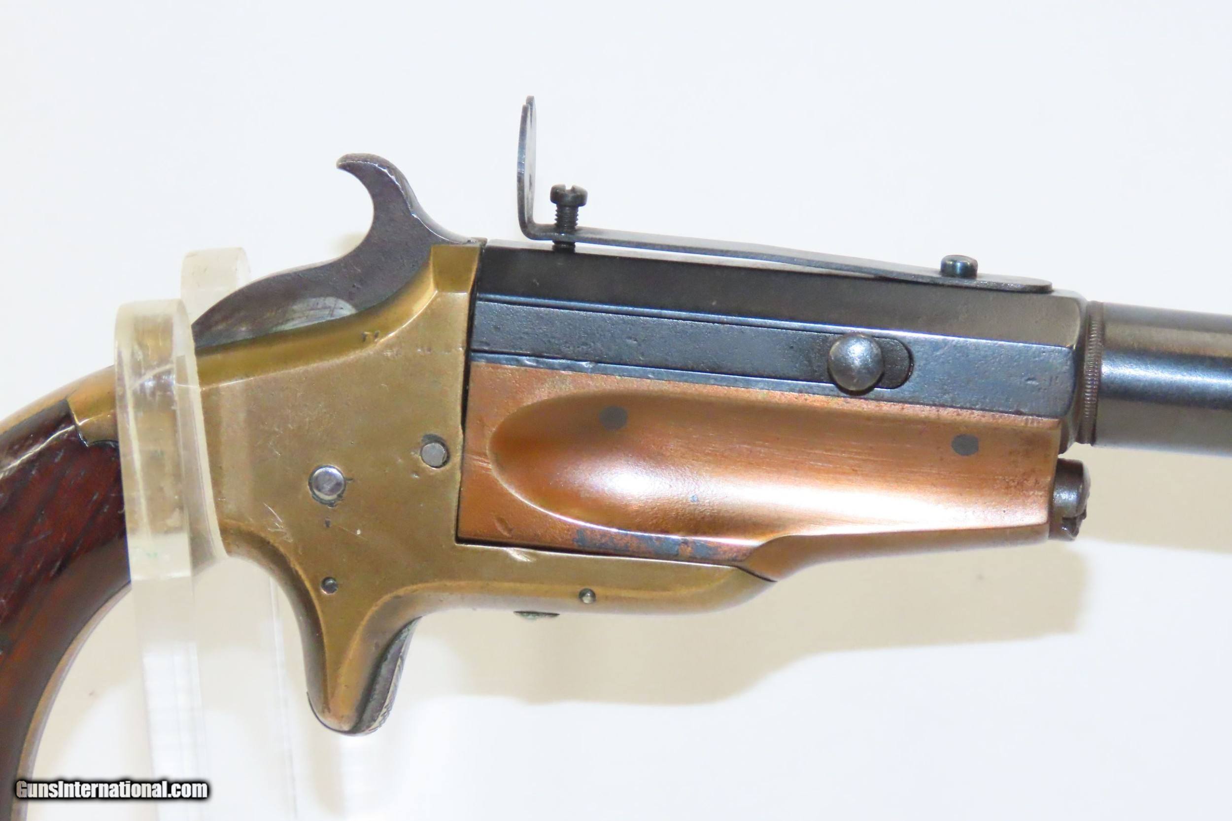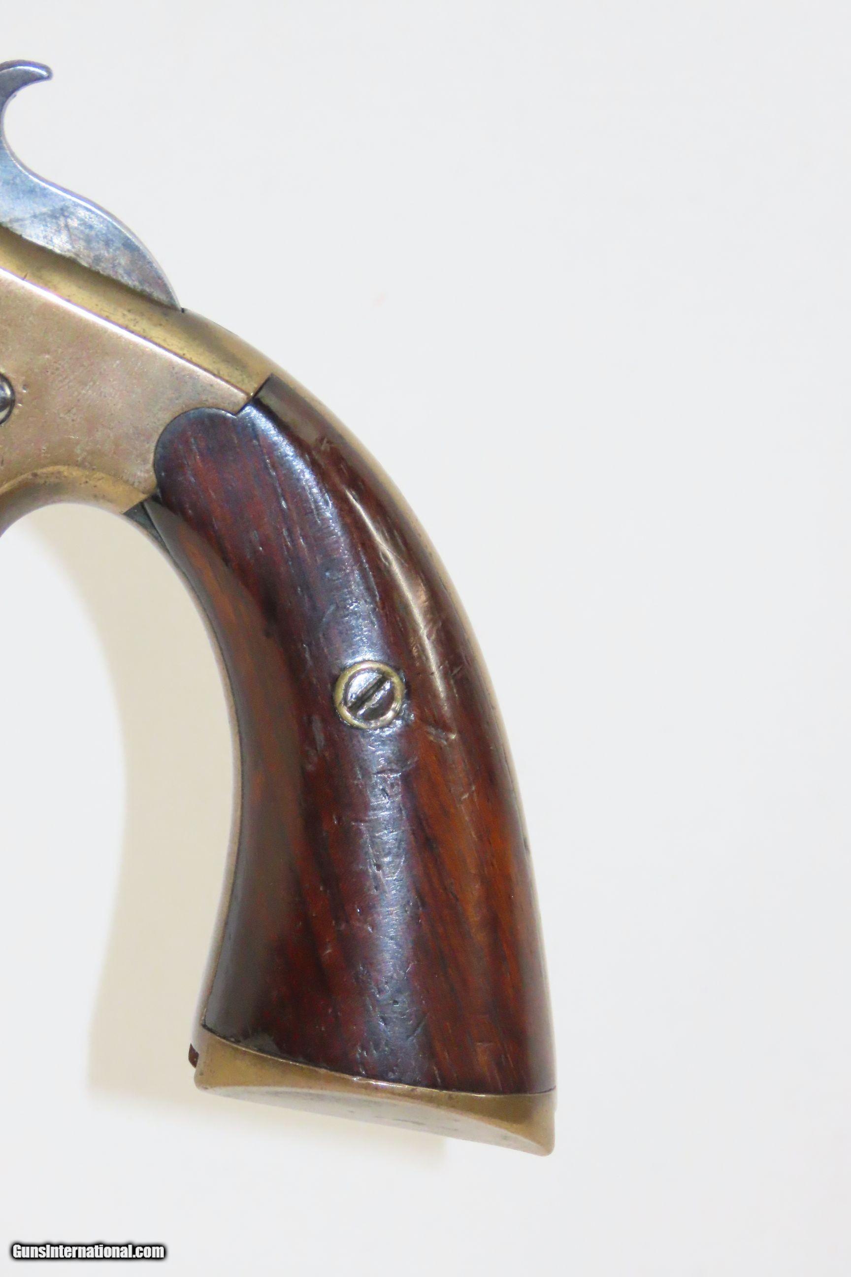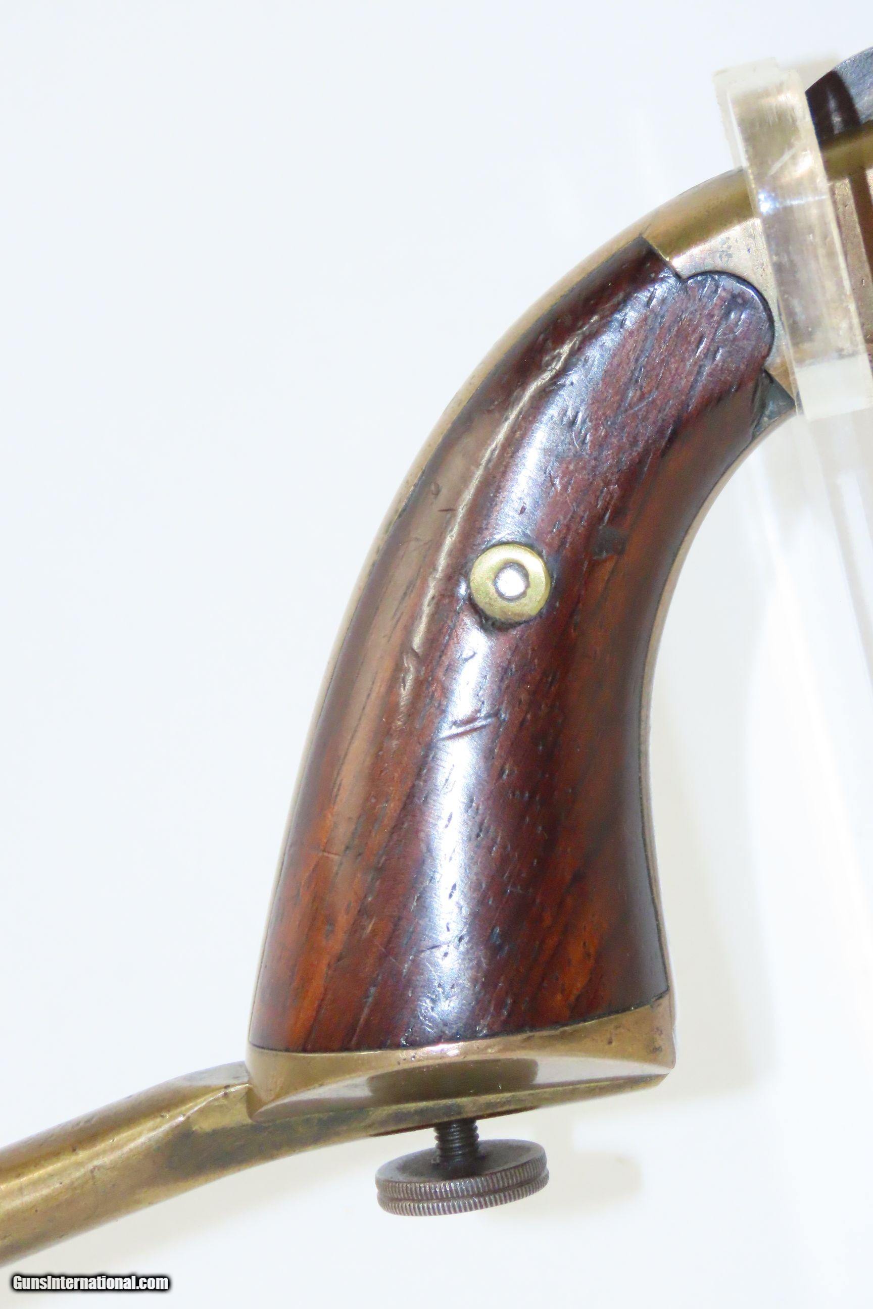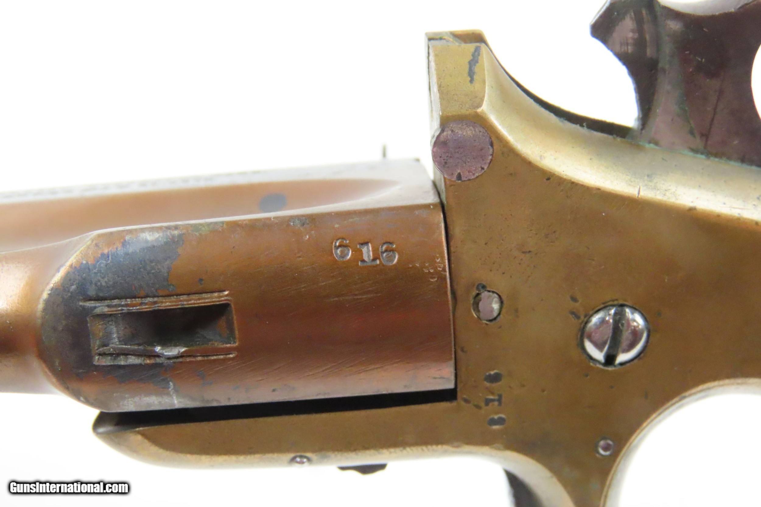 Description: Antique FRANK WESSON Model 1870 Medium Frame .32 Cal. Rimfire POCKET RIFLE 1 of 5,000; “SPORTSMAN’S JEWEL” with MATCHING STOCK Here we present an antique Frank Wesson Model 1870 Medium Frame Pocket Rifle made circa 1870-93 in Worcester, Massachusetts. Frank Wesson was the younger brother of Daniel B. Wesson, of Smith & Wesson, as well as Edwin Wesson, who was also a highly-esteemed gunsmith in the mid-to-late-1800s. The fame of his family’s name was not lost on Frank as he was, in fact, a prolific firearms designer and maker in his own right. Part of the 'Pocket Rifle' series of long barreled single shot stocked pistols, also known as the "Sportsman's Jewel". It was equipped with a globe front and aperture rear sights. The barrel turns on an axis to the right for loading and has a sliding manual extractor. The hammer and spur trigger are both serrated, and there is a pushbutton half-cock safety. The grips are smooth rosewood. There were approximately 5,000 of these pistols were produced during it’s 24 year production run. The overall condition is good. Strong action, the barrel easily swivels. The bore is in good shape for its age. Both grips are in good shape with a nice smooth finish. Numbers match. This example has been refinished. Legible markings. The front sight can be removed without effort. Own the original! This is a legitimate antique and not a reproduction. Barrel is 15-1/4 inches. Caliber: .32 Rimfire Overall condition as seen in photos. Very Fast. Very Safe. FREE SHIPPING WORLDWIDE. Delivered directly to your door by express mail! Guaranteed AUTHENTIC & Includes CERTIFICATE OF AUTHENTICITY. ancestryguns $1400 #217434 SOLD Antique: Yes |