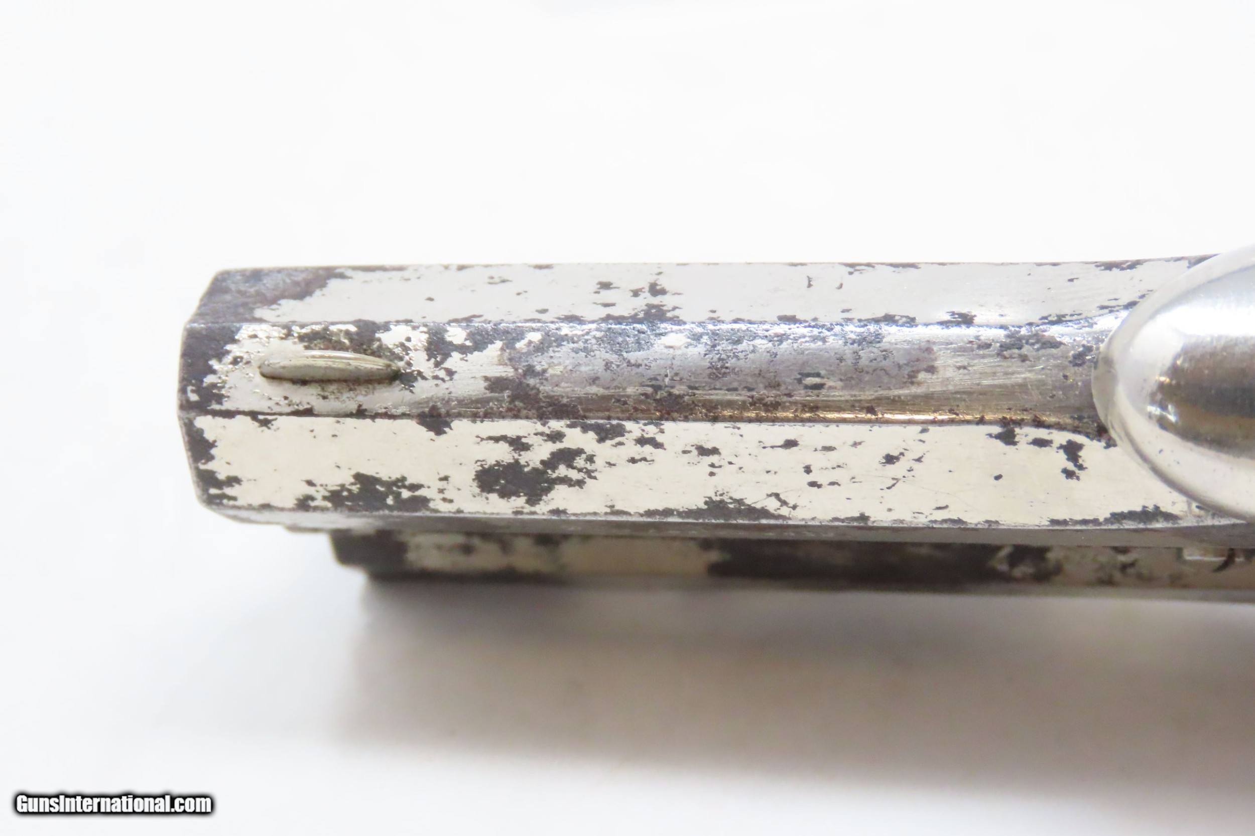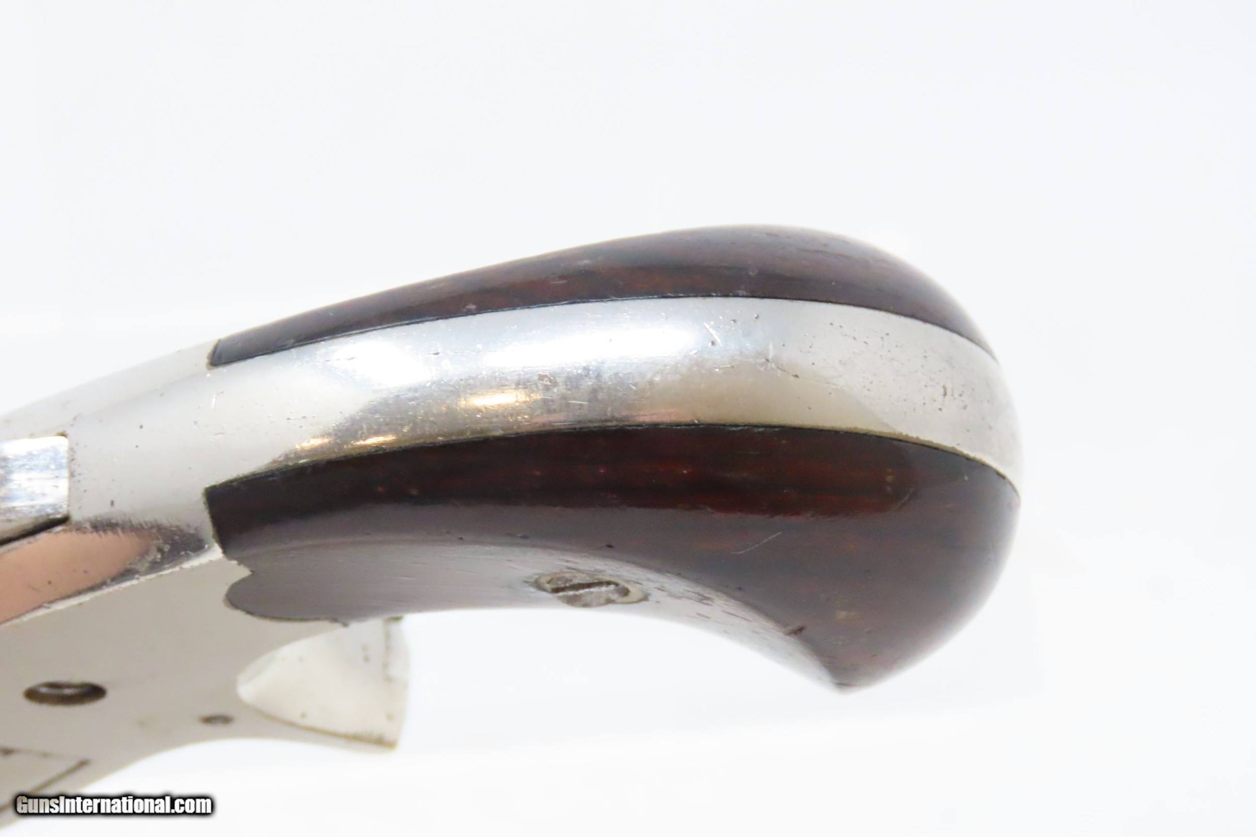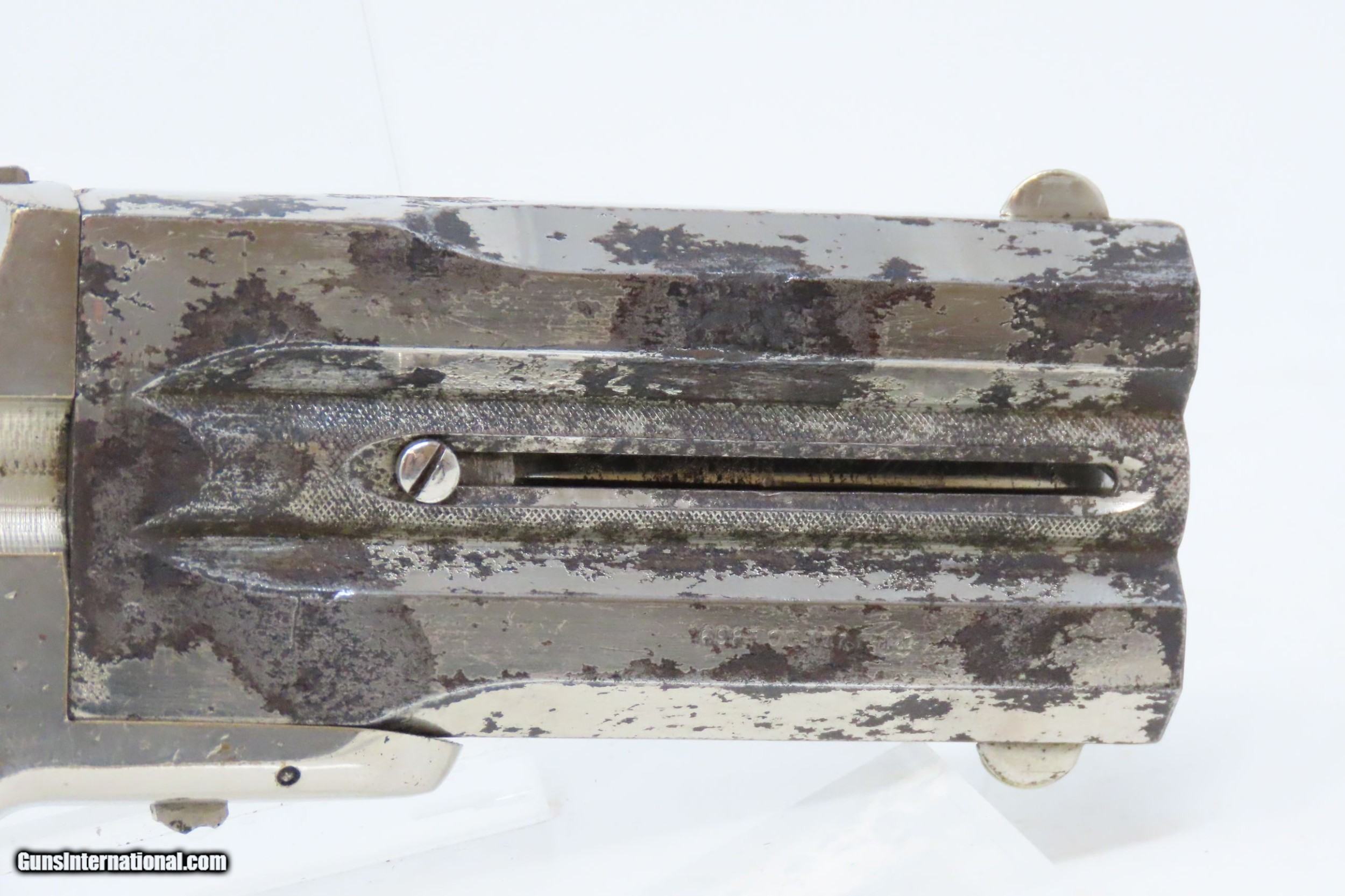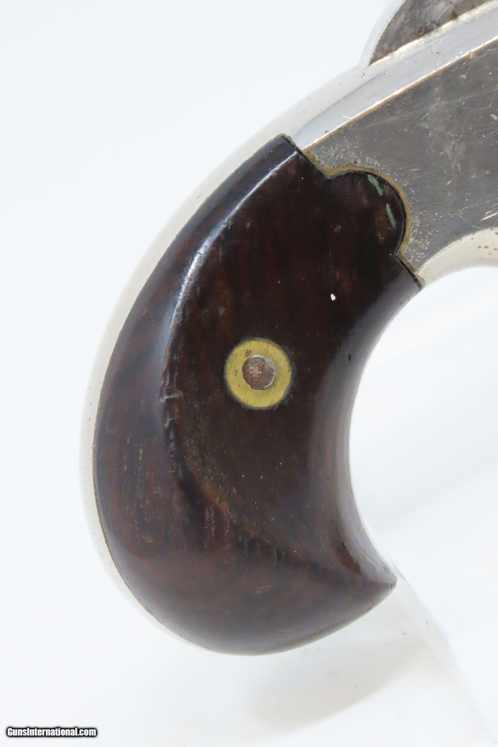 Description: Antique FRANK WESSON Superposed .41 Cal. Rimfire PISTOL with SLIDING DAGGER MASSACHUSETTS Made SWIVEL BREECH Pocket Pistol Here we present an antique Frank Wesson Swivel Breech Superposed Over/Under Pocket Pistol made circa 1868-80 in Worcester, Massachusetts. It is estimated that less than 3,000 of these two shot pistols were manufactured during its 12 year production run. The barrels rotate for loading and firing, and it has a serrated spur trigger and a smooth bird’s head butt with rosewood grips. Pistols of all sorts had by then become a common mode of pocket-sized firepower, though small revolvers were quickly eclipsing the single shot design. This would have likely been intended as a self-defense gun. In a day when the single shot pistol was popular, this over/under pistol would have been a very handy self-defense weapon to have around, having two shots to fire off instead of one! This little self-defense pistol would have been most at home in the pocket or belt of anyone in the busy cities of New York or Chicago during the tumultuous times of the mid to late-1800s. Men would carry them concealed in a waistcoat pocket or tucked inside one’s belt and women would hide them in a hand muff. From the time that firearms were introduced, gunsmiths had experimented with various ways to turn those single shot weapons into multi-shot weapons. Prior to the use of “repeating” arms, one of the most successful systems was to use multiple barrels, each with their own load and charge. The overall condition is near fine. Strong action. Original nickel finish. The bores are semi-bright. This example has nice grips with little handling wear. Legible markings. The dagger is fully functioning. Own the original! This is a legitimate antique and not a reproduction. Barrels are 3 inches. Caliber: .41 Rimfire Overall condition as seen in photos. Very Fast. Very Safe. FREE SHIPPING WORLDWIDE. Delivered directly to your door by express mail! Guaranteed AUTHENTIC & Includes CERTIFICATE OF AUTHENTICITY. ancestryguns $1750 #220599 SOLD Antique: Yes |