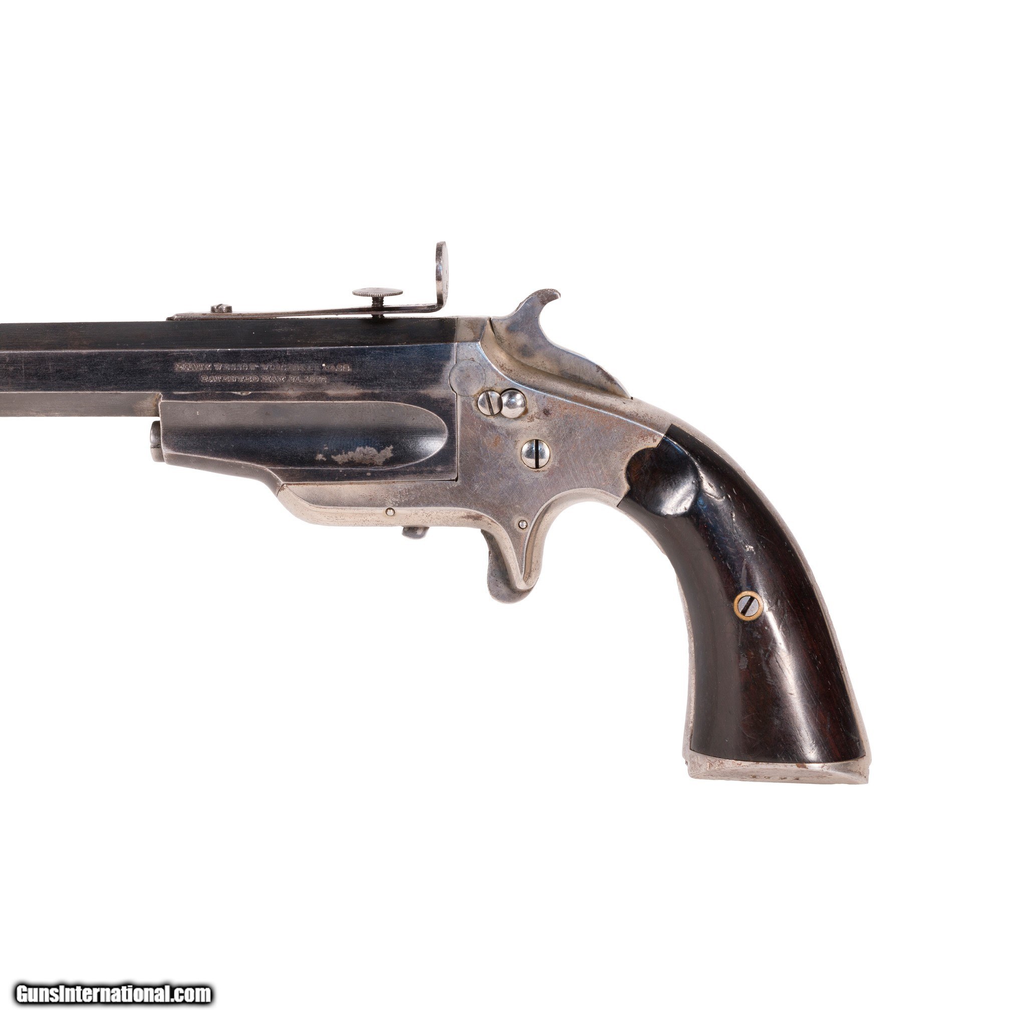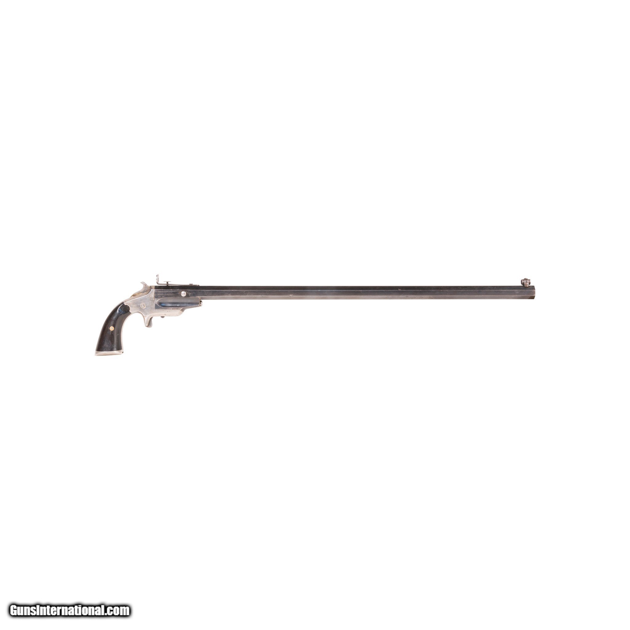 Description: Frank Wesson Pocket Rifle 1870 medium frame pocket rifle with shoulder stock. Serial #1721, 32RF cal., single shot, 20 1/8" octagon barrel. 95% + blue/nickel finish, wire frame stock, rosewood grips. Very good condition. SOLD Antique: Yes Manufacturer: Frank Wesson Serial Number: 1721 Caliber Info: 32 Manufacture Date: 1870 |