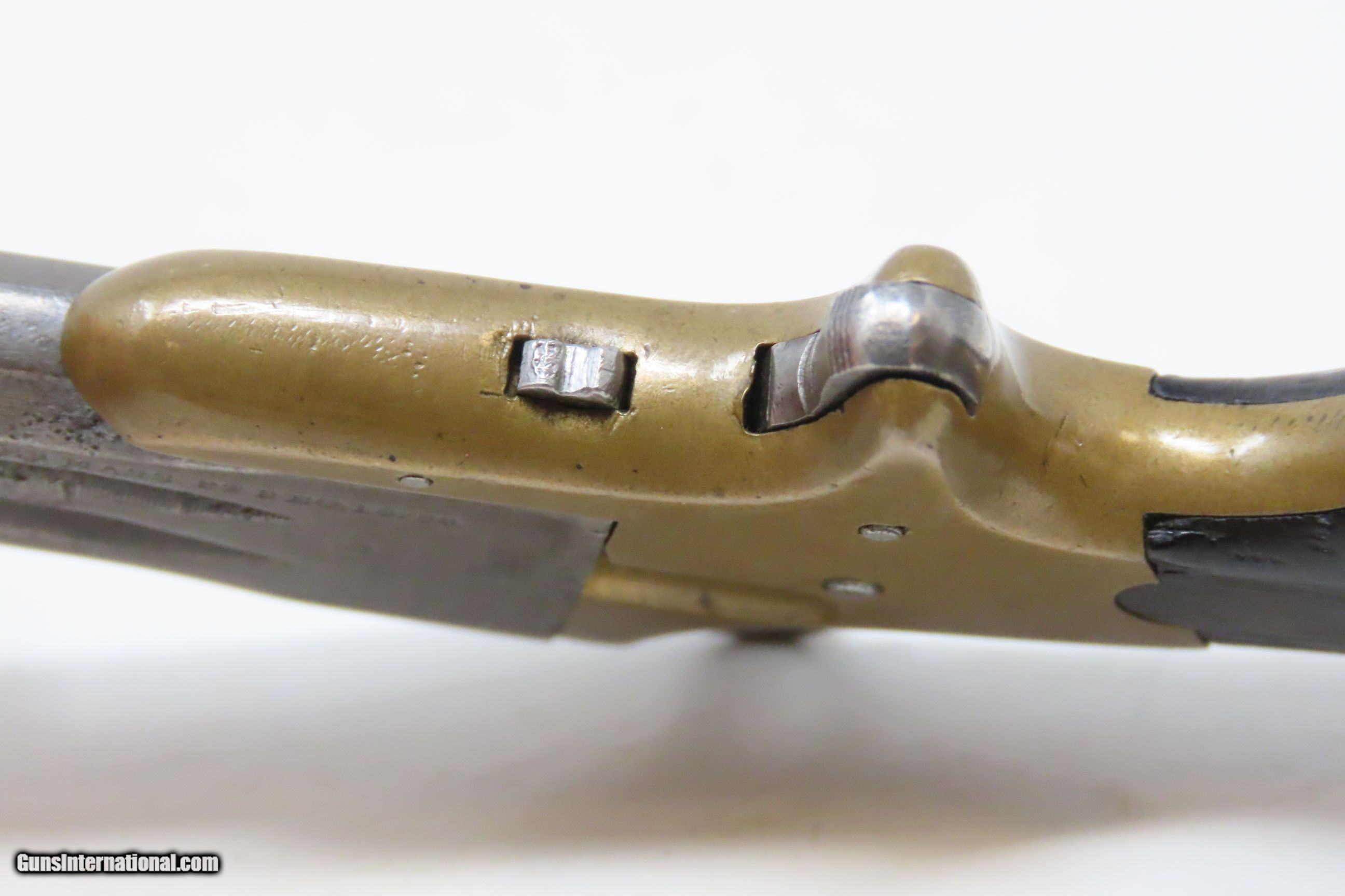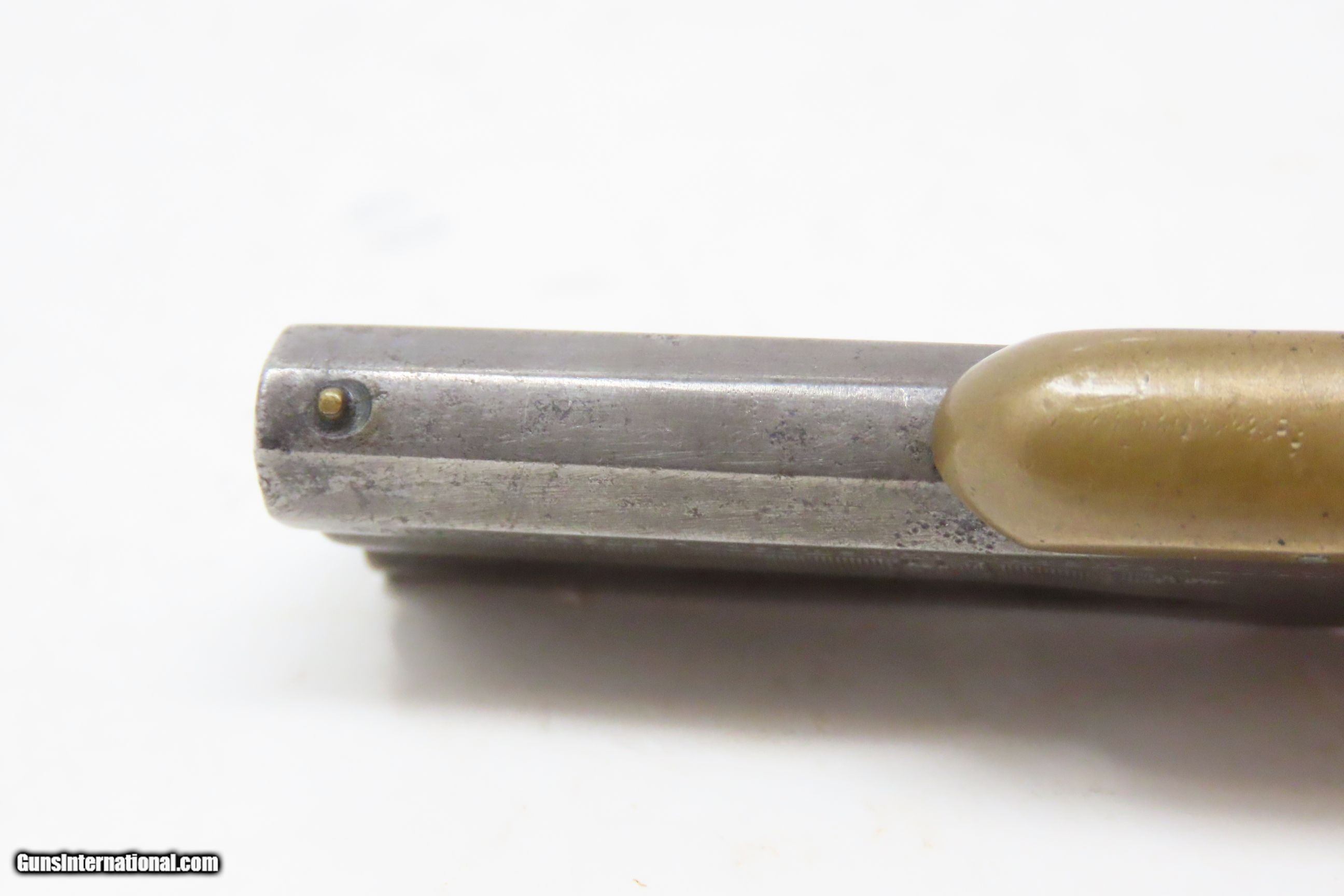 Description: RARE c1870 FRANK WESSON Small Frame WATCH FOB Swivel Breech 2-Barrel DERINGER Antique 1 of Less Than 3,000 Made Here we present an antique Frank Wesson “Watch Fob” Swivel Breech Double Barrel Deringer Pistol, made circa the late 1860s to 1880. Less than 3,000 of these tiny pistols were manufactured in two variations during this period. This example is marked "FRANK WESSON WORCESTER. MASS. PT. DEC. 15/68" on the side of the barrels, the serial number on the left side of the frame, a ring hammer, and smooth grips. The overall condition is very good. Original patina. The action is excellent. The bores are patinated with thin rifling. Solid grips. Own the original! This is a legitimate antique and not a reproduction Barrel is 2 inches. Caliber: .22 Rimfire (Short, black powder) Overall condition as seen in photos. Very Fast. Very Safe. FREE SHIPPING WORLDWIDE. Delivered directly to your door by express mail! Guaranteed AUTHENTIC & Includes CERTIFICATE OF AUTHENTICITY. ancestryguns $2300 #230401 SOLD Antique: Yes |