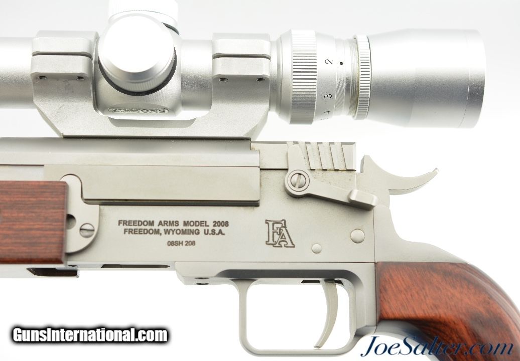 Description: Serial #08SH208, .260 Rem, .454 Casull, .223 Rem, all with bright, excellent bores. This is a Freedom Arms Model 2008 single shot pistol manufactured in Wyoming in 2012. The Custom order set includes three barrels all numbered to the frame. The frame includes custom upgrades with sling studs, Lovell scope mount and has a tuned action with the trigger pull measuring about 2lbs 8oz. Barrels include a 16 inch .260 Remington with Lovell Scope mount and a Simmons ProHunter 2-6x32 power scope with clear cross hair optics; a 15 inch ported 454 Casull barrel with Silhouette target sights; and a 15 inch .223 Remington. All 3 barrels are in excellent condition with light use marks on the matte stainless finish. The frame is excellent showing a very few light use marks. The impregnated hardwood grips and forearm are likewise excellent with a very light scratch on the left panel and a tiny use mark on the bottom. It comes in the original cardboard box numbered to the gun. An excellent Freedom Arms Single Shot package all set up for hunting and the range. FFL SOLD |