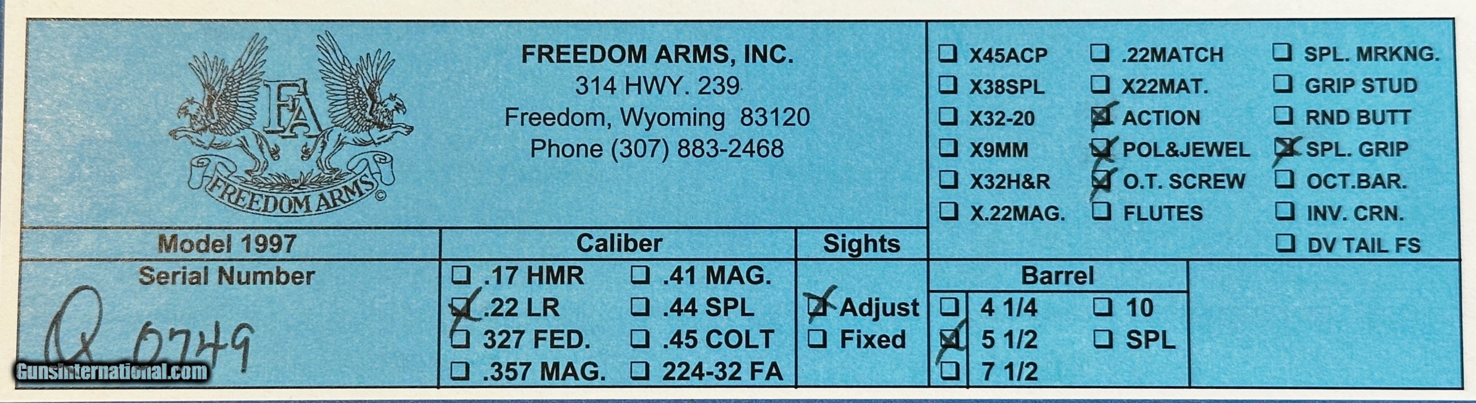 SOLD Handgun Caliber: .22 Long Rifle Manufacturer: Freedom Arms Model: Model 97 Premier Grade w/ Many Upgrades Serial Number: Q0749 Barrel Length: 5.5 Condition: New |