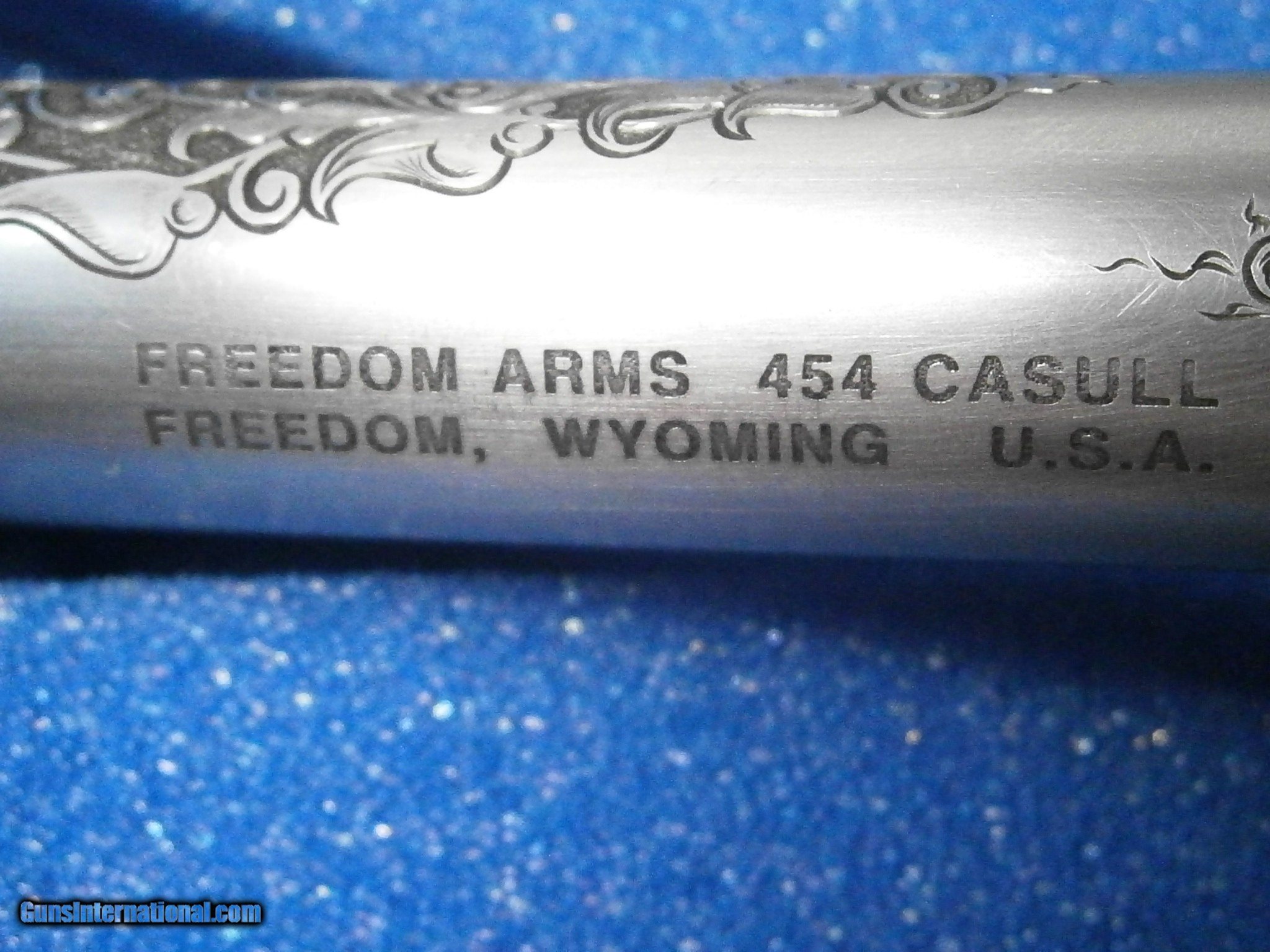 Description: (Sale Pending)Freedom Arms model 83 Premier in 454 Casull. 7 1/2 inch barrelled 5 shot stainless steel revolver purchase in 1995 by Jerome Glimm, master engraver in Conrad, Montana. The revolver made it to Hallowell & Company in Livingston, Montana at some point and was then sold to a gentleman in Eugene, Oregon and the gun was shipped to Mazama Sporting Goods. I talked with Jerome Glimm who's work is amazing. He said he engraved three of these Freedom Arms revolvers and charged right around $3000 each for the engraving. I saw one that sold several years ago and it was made in 475 Linebaugh and I don't know what the third revolver caliber was. Here is your chance to own a possible one of a kind beauty. The revolver trigger pull was factory set a 3 pounds,has a factory action job and comes with winewood grips. It has been fired sparingly and is in like new conditon. Pictures tell the story. Comes with factory box, test target, receipts and booklet. An amazing collector or shooter. Please add $50 for shipping and insurance to your FFL. If interested feel free to call with offer. SOLD Manufacturer: Freedom Arms Model: 83 Premier Caliber Info: 454 Casull Condition: Excellent Metal Condition: Excellent Wood Condition: Excellent Bore Condition: Excellent Barrels: 7 1/2 Action: Single Finish: Stainless Steel Manufacture Date: 1995 Engraving: Jerome Glimm Extras: Reciepts, box, test target |