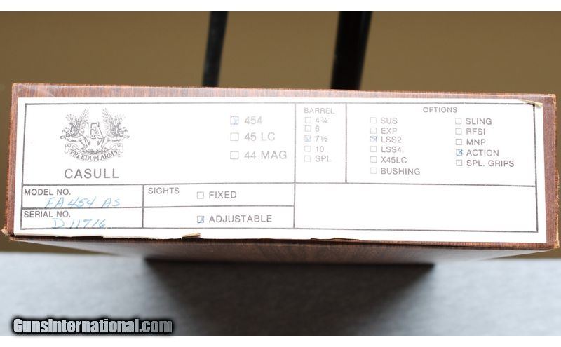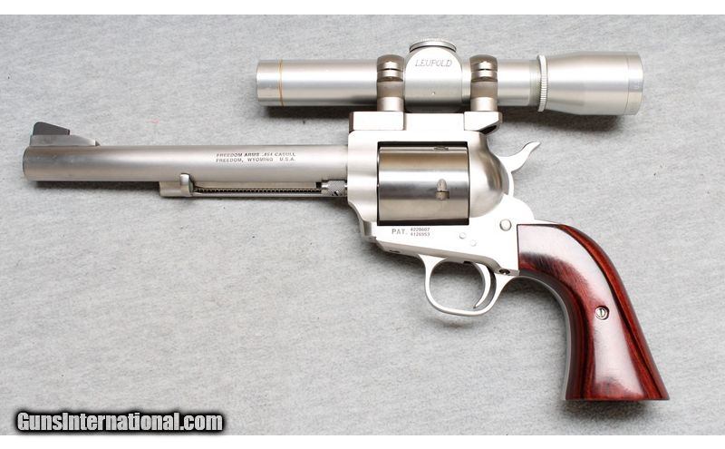 Description: Appears as new, with original box and test target. Beautifully crafted stainless large frame single action magnum revolver. 7 1/2" Barrel, unfluted cylinder, factory laminated wood grips. Leupold 2x pistol scope installed. One look at the 25 yd test target indicates the potential accuracy of this outstanding and meticulously crafted revolver. .454 Casull SOLD Chambers: Revolver Metal Condition: As new Wood Condition: Grips are as new Bore Condition: Bright Barrels: 7 1/2 Triggers: Single action Butt Pad: Wood grips Sights: Leupold 2x scope Item Location: La Vista, NE |