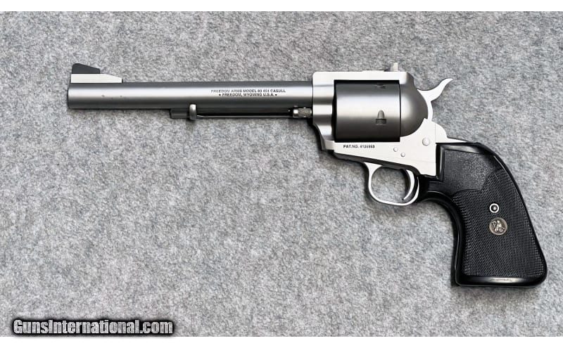 Description: Freedom Arms ~ 83 ~ Chambered in .454 Casull. Firearm features a 7.5" barrel with front black blade sight (Interchangeable), Rear fixed black u-notch sight. (Firearm Only). .454 Casull SOLD Chambers: .454 Casull. Metal Condition: Very good condition. Wood Condition: Good condition PachMayr grips. Bore Condition: Very good condition. Barrels: 7.5" Barrel. Triggers: Single-action. Weight: 3.3 lbs Sights: "Front black blade sight (Interchangeable), Rear fixed black u-notch sight. Item Location: Acworth, GA |