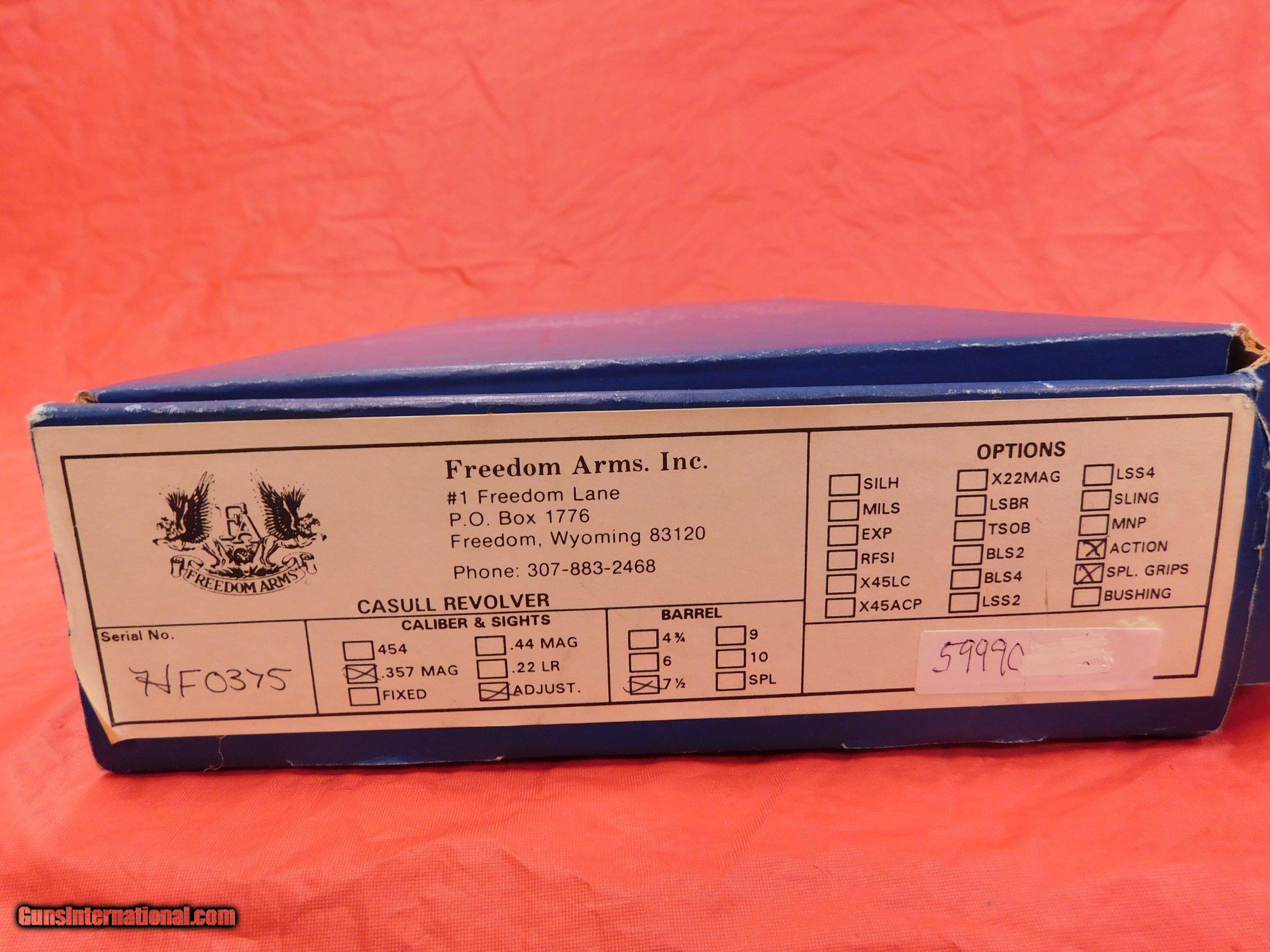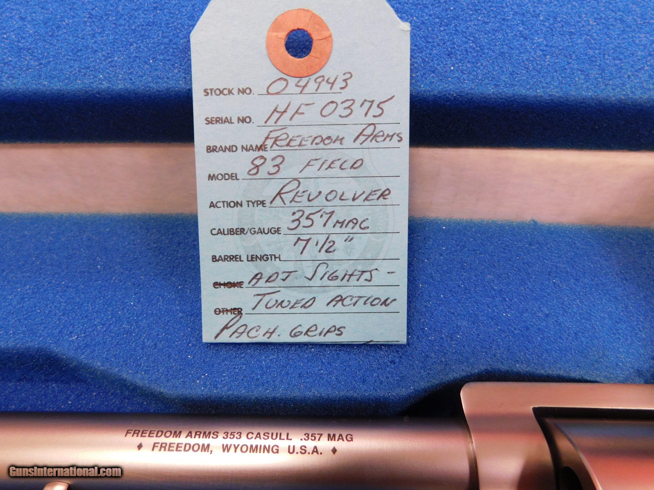 Description: Freedom Arms 83 Field Grade 357 7 1/2" bbl, adjustable sights, tuned action, NIB, excellent hunting gun. Clearance price $1600 $30 shipping and NO cc fees. Please ask for Steve 716-833-2581 or 716-835-1546. SOLD Manufacturer: Freedom Arms Model: 83 Field Grade Caliber Info: 357 Condition: NIB Barrels: 7 1/2 |