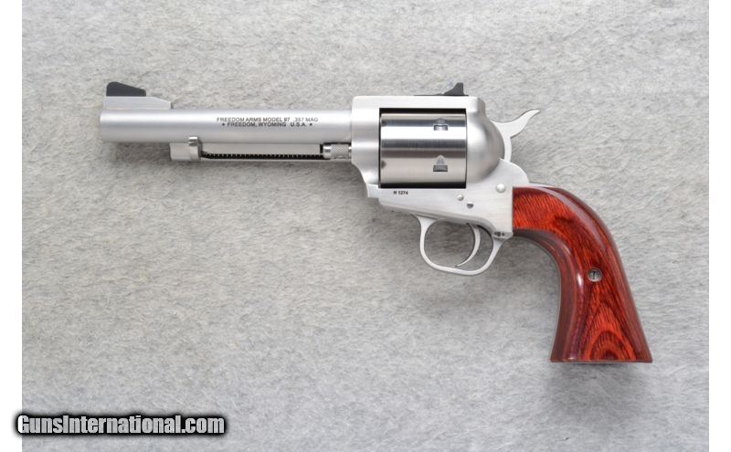 Description: This Freedom Arms Model 97 Premier Grade is a 6 shot unfluted cylinder stainless steel single action revolver in .357 Magnum Cal. It has a 5.5 inch satin finish barrel and smooth grip hardwood grips. In overall excellent condition it comes as is in its original blue carton. SOLD Manufacturer: Made in U.S.A. Caliber Info: .357 Magnum Chambers: 6 shot unfluted cylinder. Metal Condition: Excellent. Wood Condition: Excellent. Bore Condition: Excellent. Barrels: 5.5 inch satin stainless steel. Triggers: Single Action. Stock: Smooth grip hardwood. Weight: 40 oz. Sights: Raised blade front. Adjustable notch rear. Item Location: Richfield, WI |
