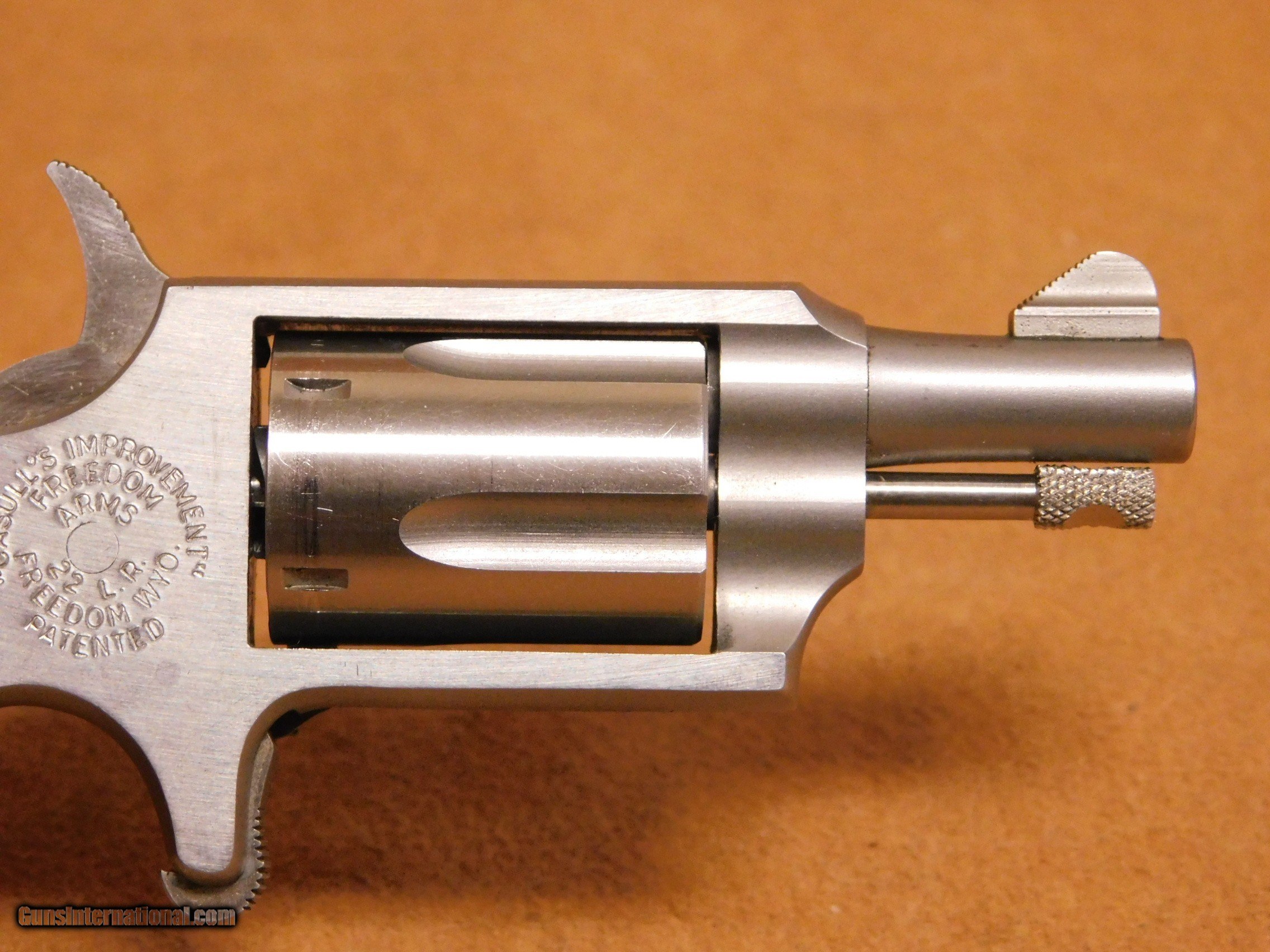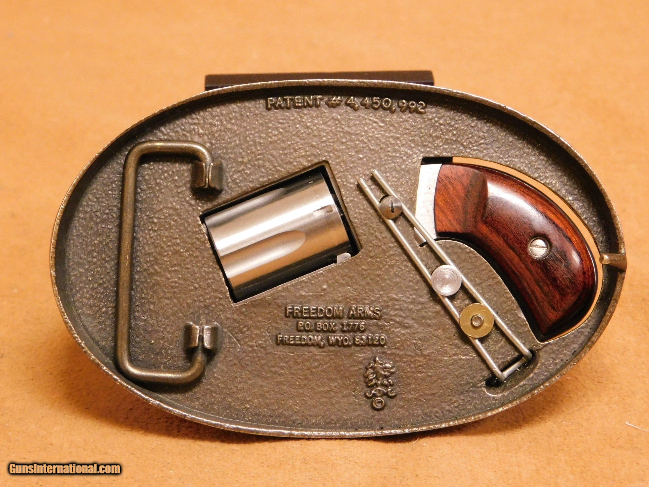 Description: This is a rare Freedom Arms Casull's Improvement .22 LR revolver with the brass belt buckle. Manufacturing of this mini revolver stopped in the late 80's. It is a 5-shot chambered in .22S/L/LR with a fluted, pinned cylinder. It is a single action with a spur trigger and a 1-1/8" barrel. The metal is brushed stainless steel and it is equipped with laminate wood grips. The bore is bright and shiny. The cylinder index is excellent and locks up tight. The guns is in overall good condition. It also comes with the factory Freedom Arms brass belt buckle. All items are also available for sale in our brick & mortar store and are subject to prior sale. Think long, think wrong. Payment On firearms, we typically only accept credit cards or money orders/cashier's checks.