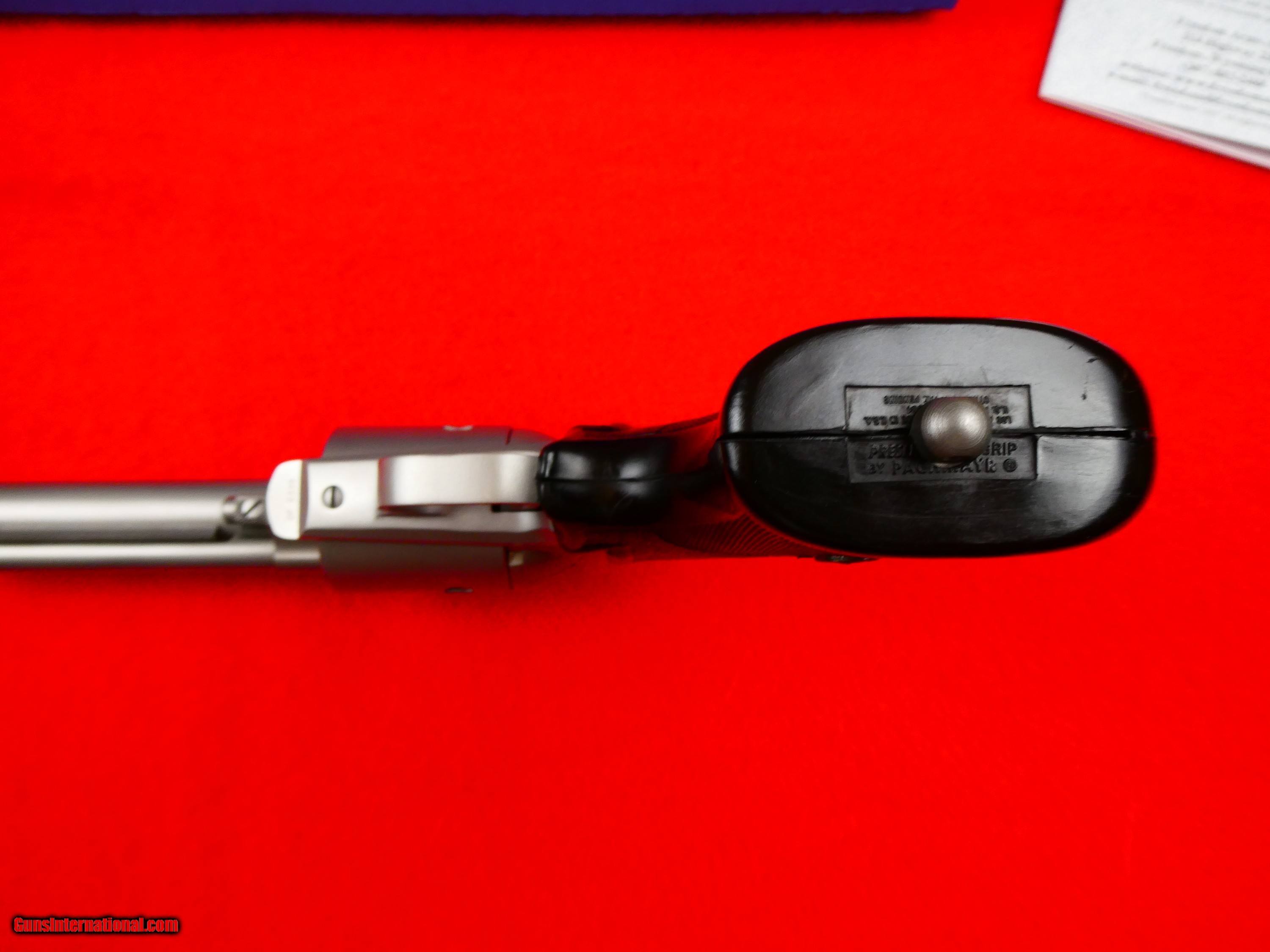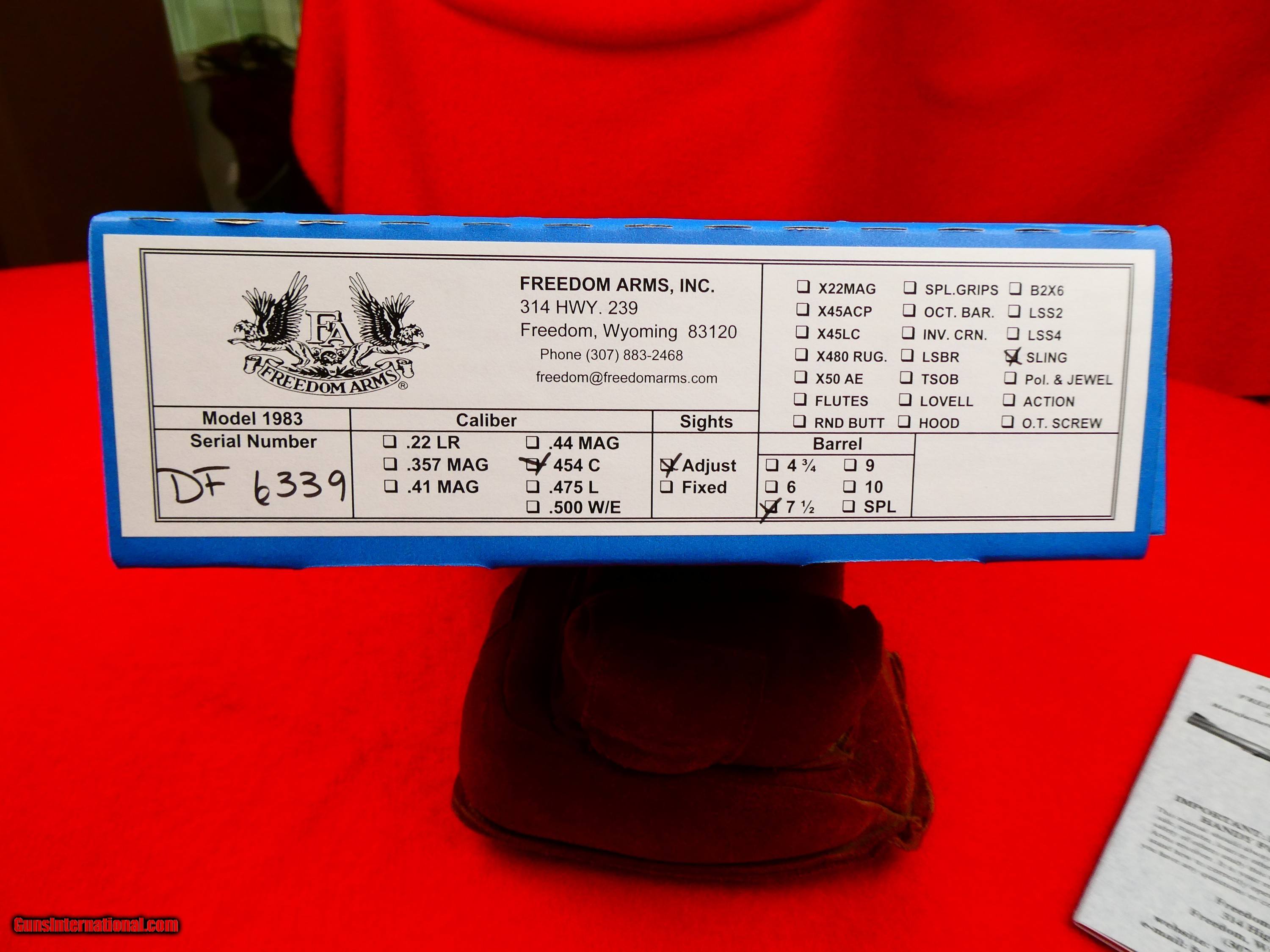 Description: ***SOLD*** Freedom Arms model 83 field grade .454 casull, Looks like it is possibly unfired, Comes with box and manuals , Ser # DF-633X Made 2/16/1993, 7 1/2 inch barrel, Adjustabe sights, Five shot revolver, Special order Pachmayr presentation grips and factory sling studs, Looks new in box. Layaway Available SOLD |