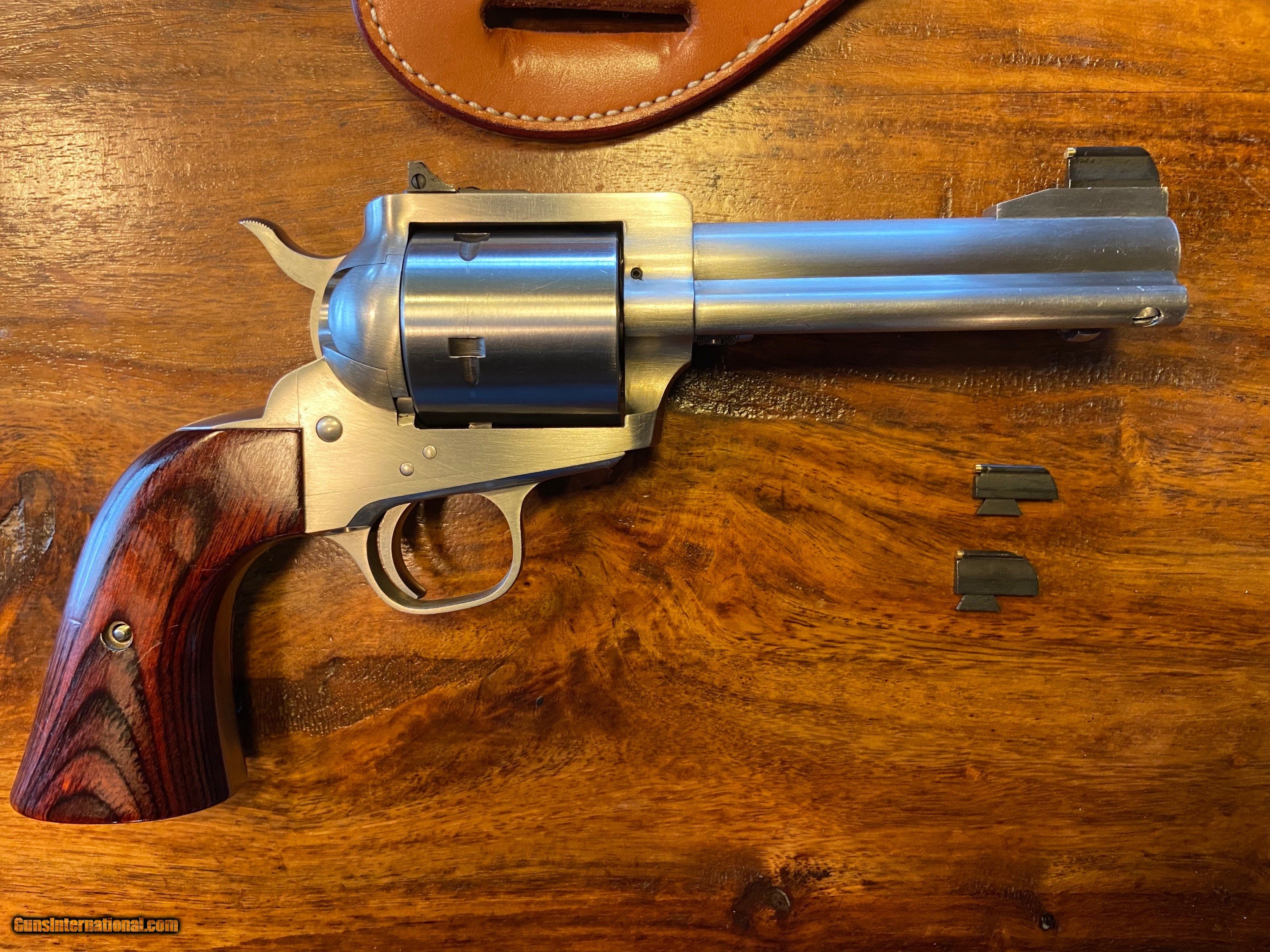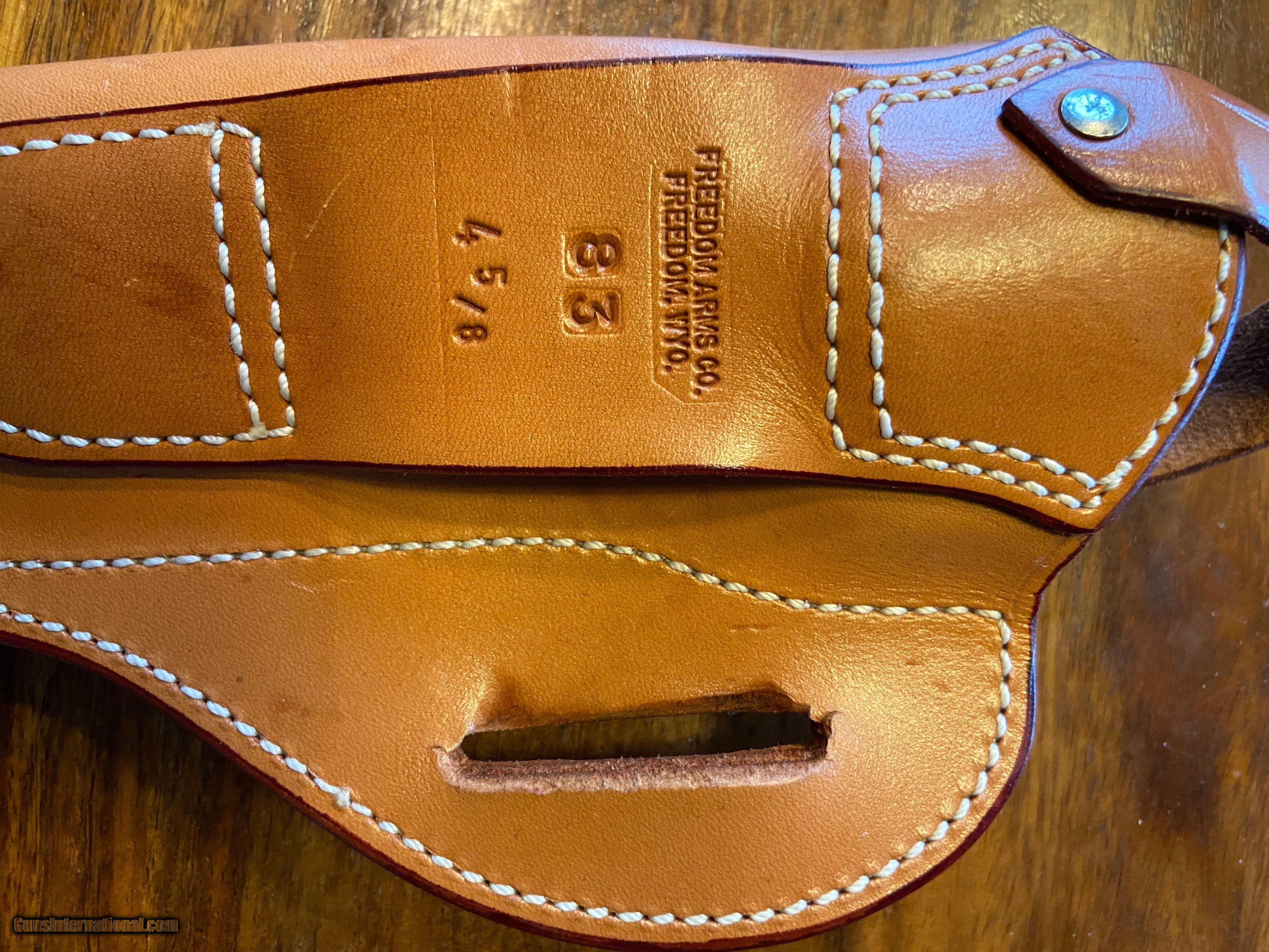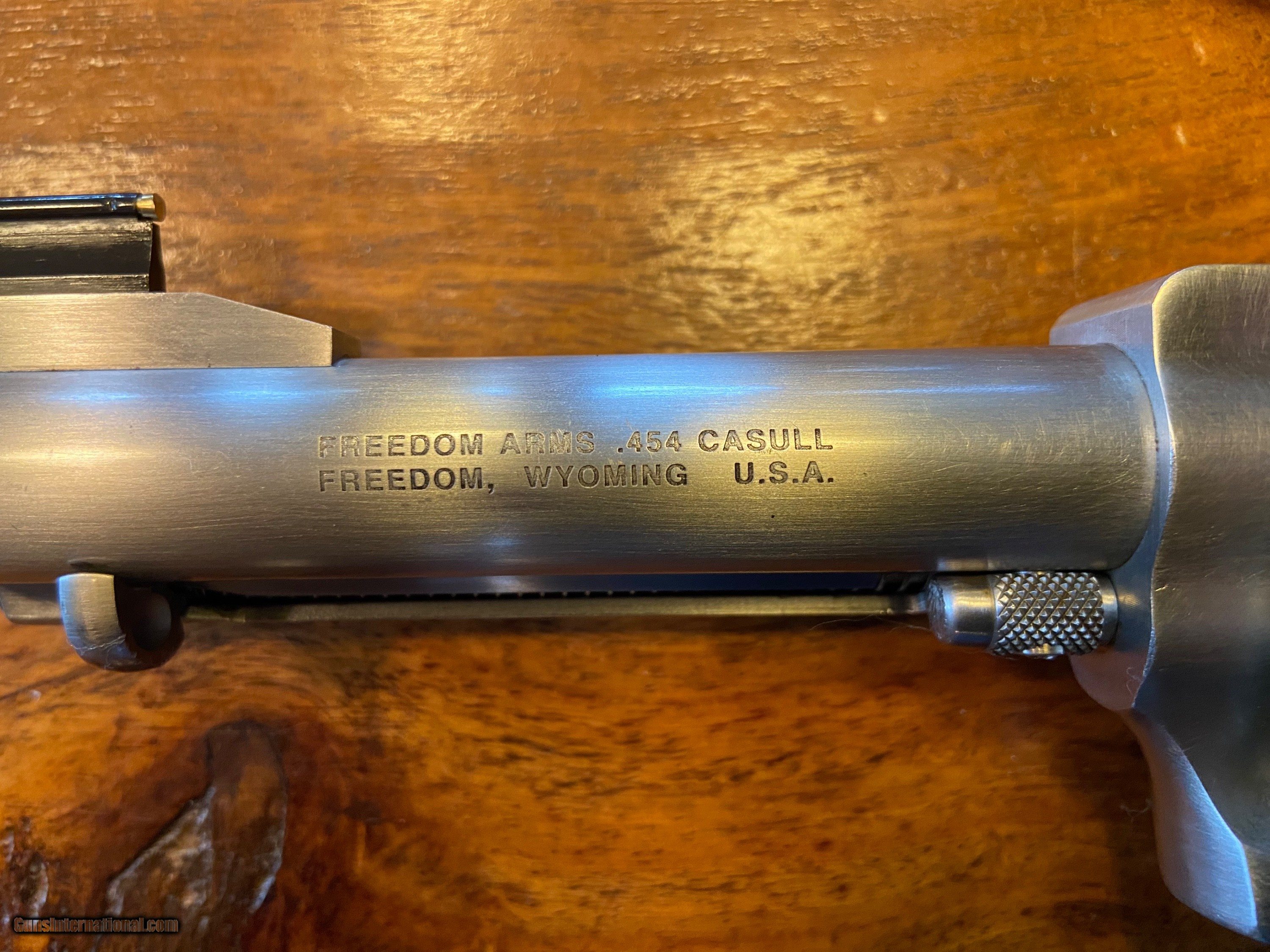 Description: Very nice Freedom Arms .454. 4 5/8" Barrel, Hardwood Grips. Comes with 3 front sight blades to fine tune your sight picture preferences. Rear sight is adjustable. Condition is excellent and functions like a fine Swiss watch. Fit and finish equally as nice. Manufacture date is August 4, 1987! Premier grade quality, but predates the "premier grade/field grade" designations. Comes with Genuine Freedom Arms leather holster specifically made for this model ($136 value). MUST BE SHIPPED TO FFL *Also have a suite of quality ammunition that can be negotiated for additional cost. Ammunition must be shipped separate from firearm, so additional shipping would apply SOLD Handgun Caliber: .454 Casull Manufacturer: Freedom Arms Model: 83 Condition: Excellent Metal Condition: Excellent Wood Condition: Excellent Bore Condition: Excellent Action: Single action revolver Extras: Holster and 2 additional from sight blades. P |