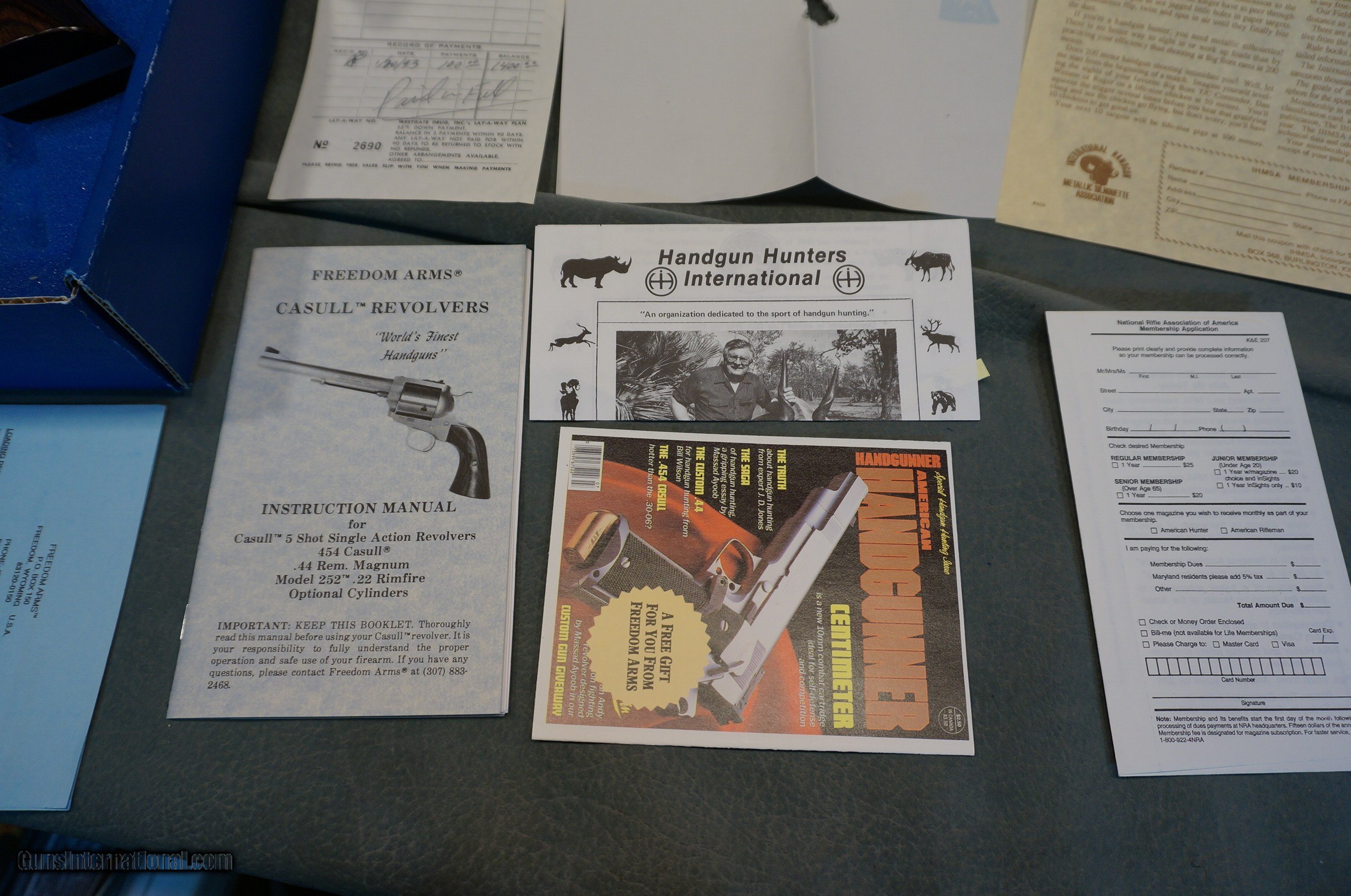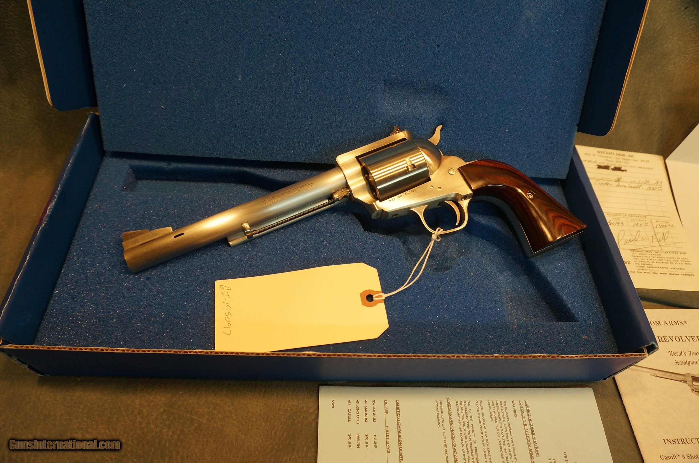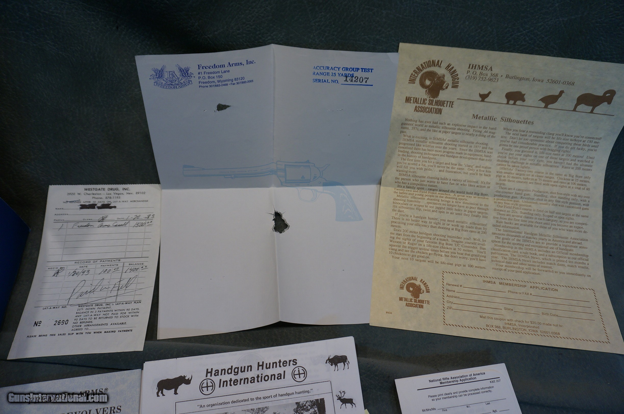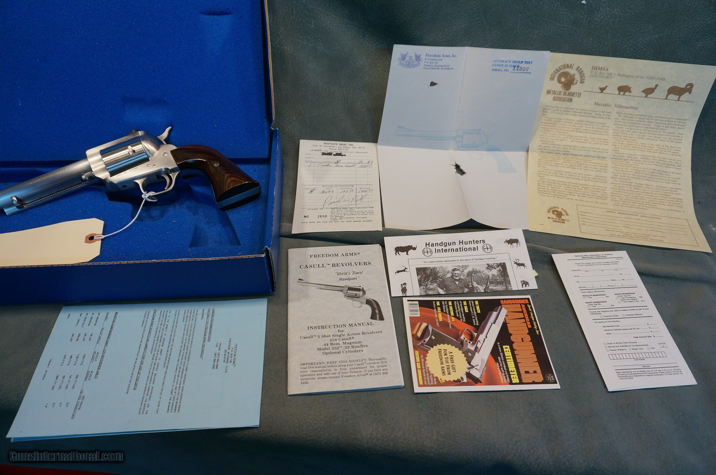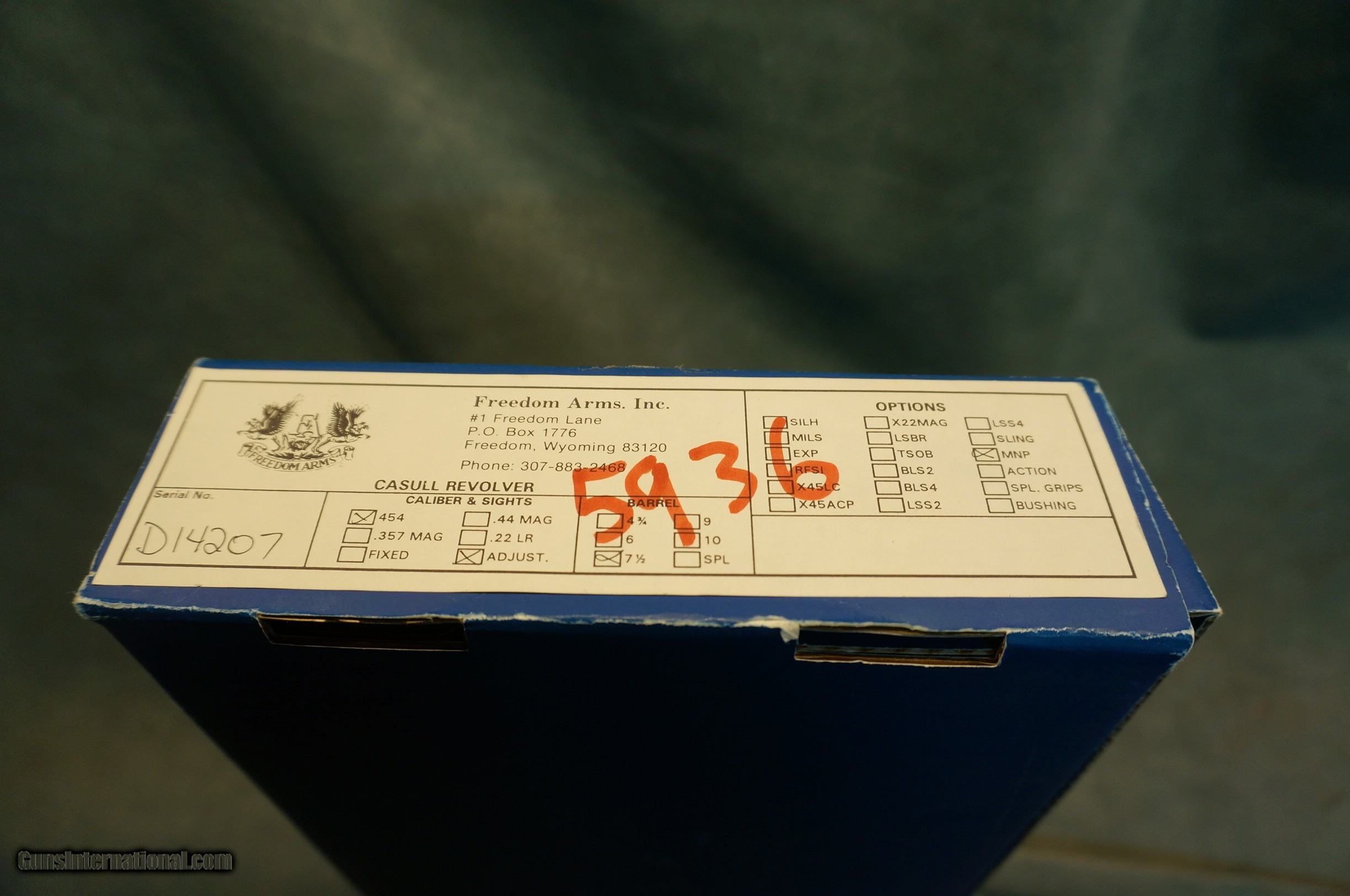Description: Freedom Arms Model 83 Premier Grade 454Casull 7 1/2" factory magnaported barrel,adjustable sights,winewood grips,early gun in excellent condition with the box,test target,warranty card and original receipt from 1993. GUN COLLECTIONS WANTED FOR CASH! We buy, sell, consign and trade new and used firearms. This is our 44th year in business.To send your FFL or for tracking info please e-mail shippingfirststopguns . We offer 90 day layaways with 20% down. No return on layaways. Firearms will need to be transferred through a FFL dealer. Prices reflect a cash discount. There will be 3% added to credit card sales. We trade for gold and silver. THANK YOU! SOLD |