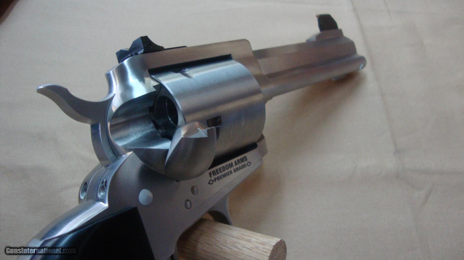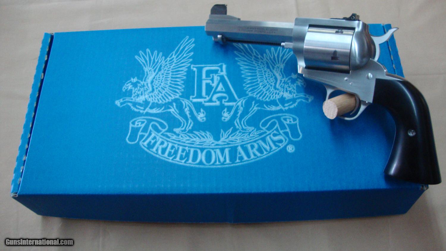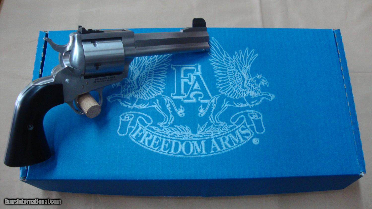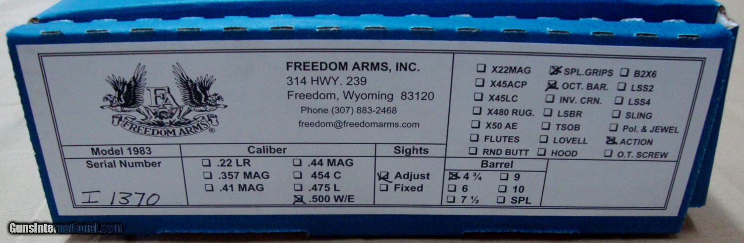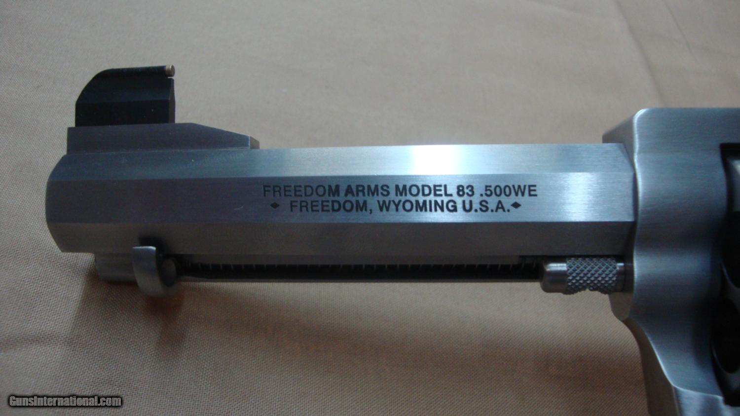 Description: Freedom Arms Model 83 .500 W/E. This single action revolver has a 4-3/4" octagonal barrel with adjustable factory express sights. The frame is stainless steel and the non-fluted cylinder holds five rounds. This revolver is new in box and comes with a limited lifetime warranty. Brass and dies can be ordered through Freedom Arms. SOLD |