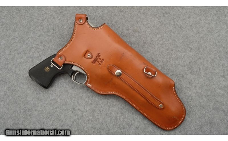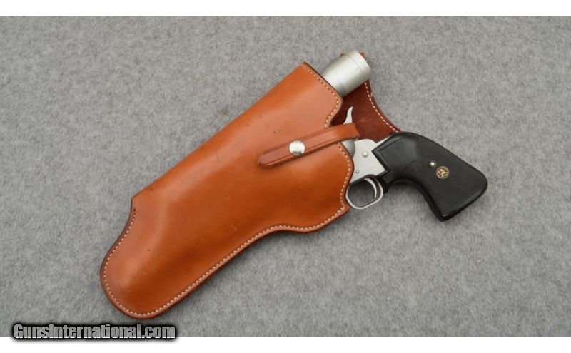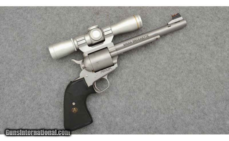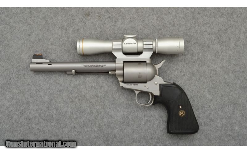 Description: Freedom Arms Model 83 .500 Wyoming Express. Includes a Freedom Arms shoulder holster minus straps. Apparently the handgun was made to order and the customer had Freedom Arms stamp his name on the barrel. The hangun and scope are in excellent condition. SOLD Caliber Info: .500 Wyoming Express Chambers: 5 chamber cylinder. Metal Condition: Excellent Wood Condition: Grips: Excellent. Bore Condition: Excellent. Barrels: 7 1/2" ported barrel. Triggers: Single action. Stock: Pachmayr rubber grips. Weight: 3 Lbs. 14 Oz. Sights: Leupold 4 Power Handgun scope, an FX-II 4x28mm scope with duplex reticle. Item Location: Boise, ID |