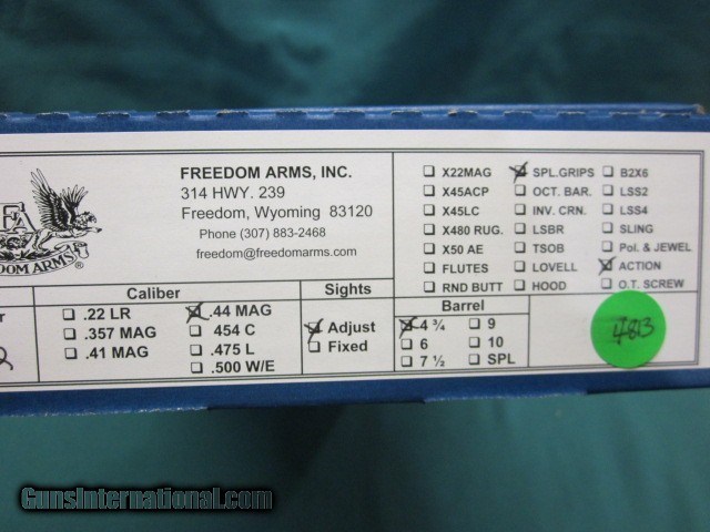 Description: Freedom Arms Model 83 premier .44 Magnum with 4 3/4" barrel, Black micarta grips, factory action job with 3lb trigger.100% new in box with full factory warranty.ADD 3% for credit cards,shipping is 35.00. 260 409 9828 SOLD |