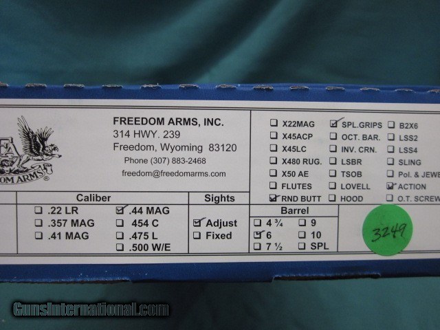 Description: Freedom Arms Model 83 Premier .44 Mag. with 6" barrel ,Round butt grip, black micarta grips, factory action job with 3lb trigger. 100% new in box with full factory warranty, ADD 3% for credit cards, shipping is 35.00 (260-409-9828) SOLD |