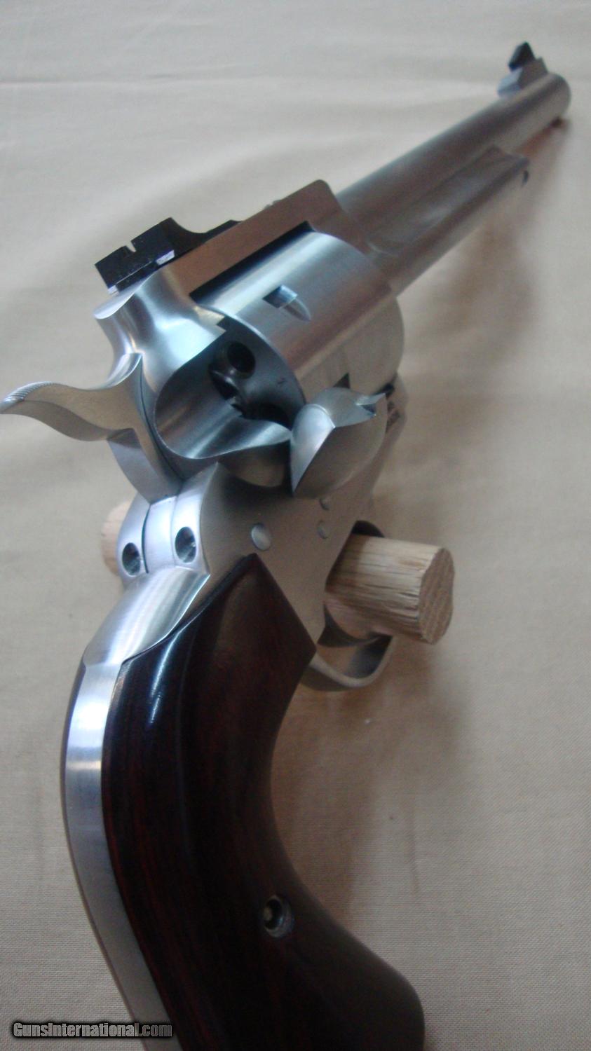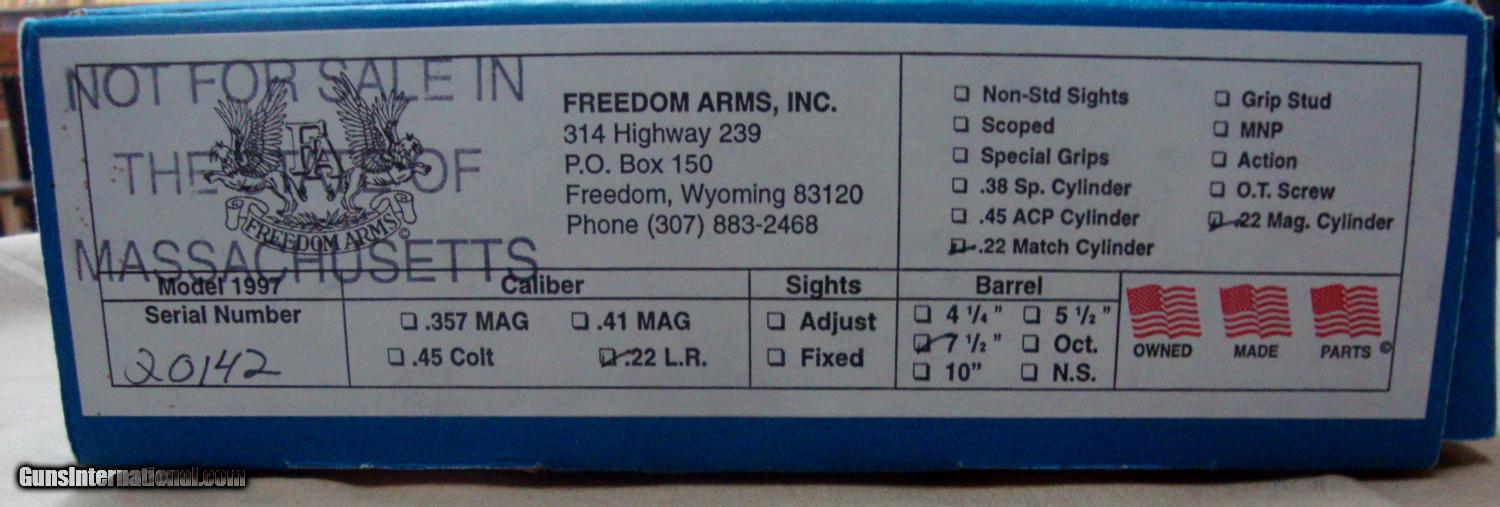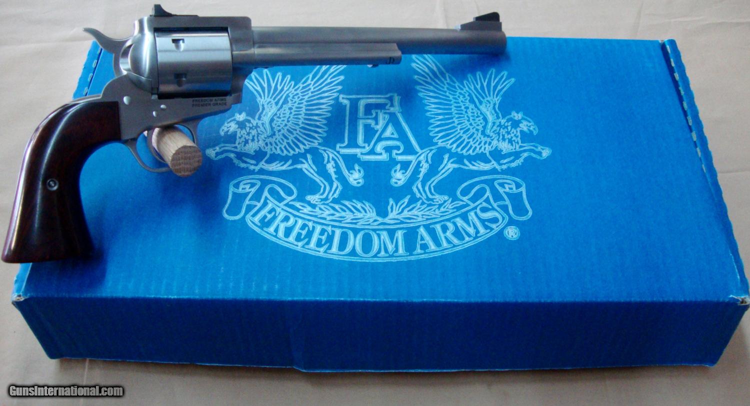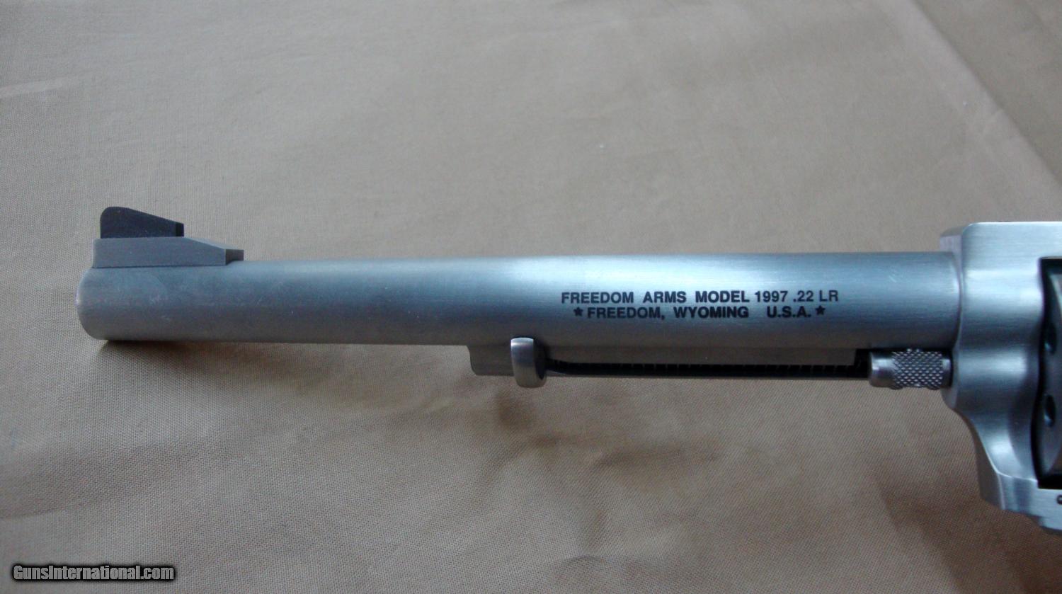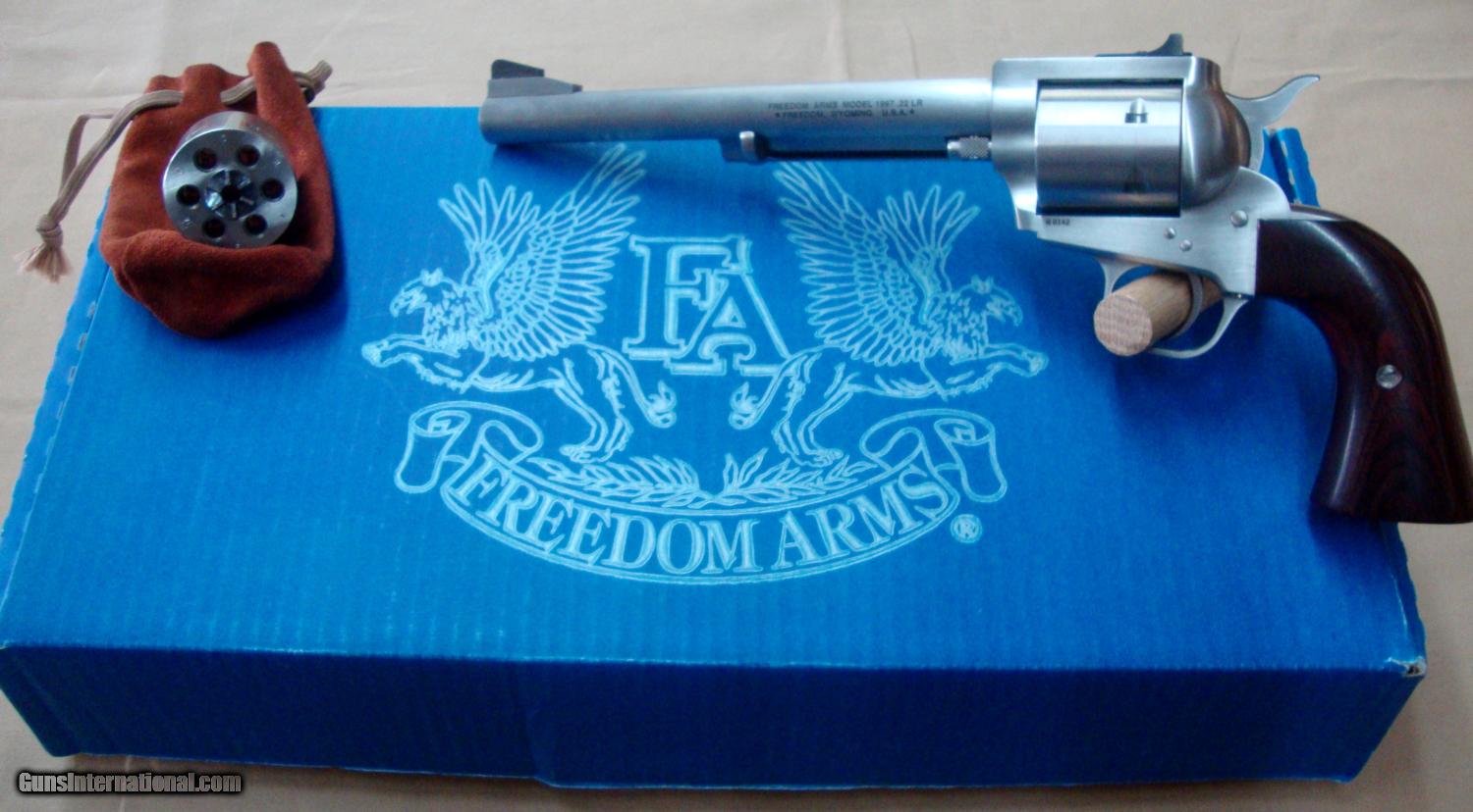 Description: Freedom Arms Model 97 .22LR/ .22MAG. This single action revolver has a 7-1/2" barrel with adjustable factory express sights. The frame is stainless steel and the non-fluted cylinder holds six rounds. It has beautiful hardwood grips. This revolver is new in box and comes with a limited lifetime warranty. SOLD |