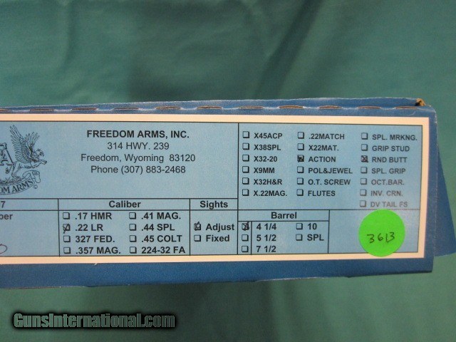 Description: Freedom Arms model 97 Premier .22LR. with 4 1/4" barrel , Round butt grip with winewood grips.factory action job with 3lb trigger, expres rear sight with gold bead front.100% new in box with full factory warranty. ADD 3% for credit cards,shipping is 35.00, 260 409 9828 SOLD |