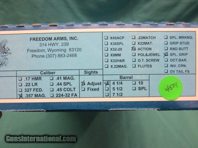 Description: Freedom Arms model 97 Premier .357 Mag with 4 1/4" barrel, Black micarta grips, factory action job with 3lb trigger. 100% new in box with full factory warranty. ADD 3% for credit cards,shipping is 35.00. 260 409 9828 SOLD |