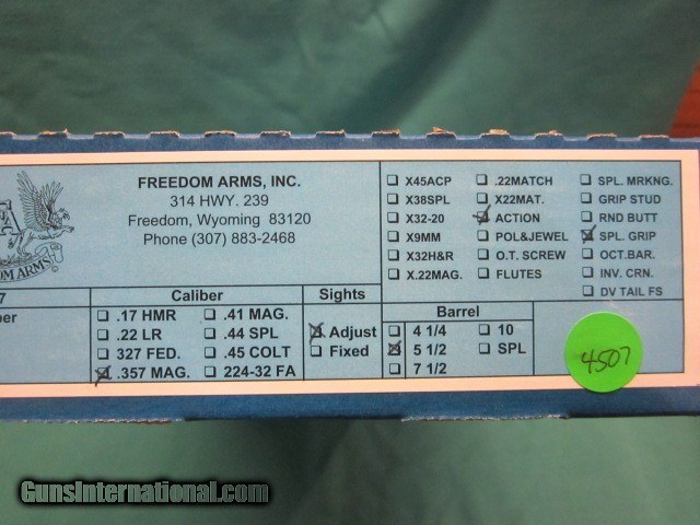 Description: Freedom Arms model 97 Premier .357 Mag with 5 1/2" barrel, Black Micarta grips, factory action job with 3lb trigger. 100% new in box with full factory warranty. ADD 3% for credit cards,shipping is 35.00. 260 409 9828 SOLD |