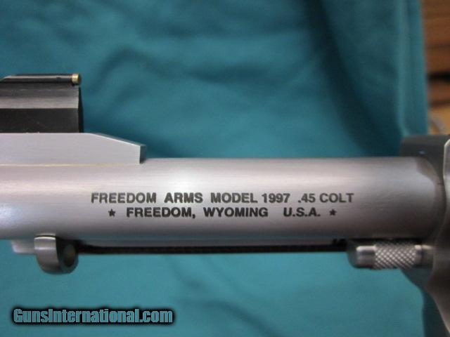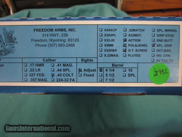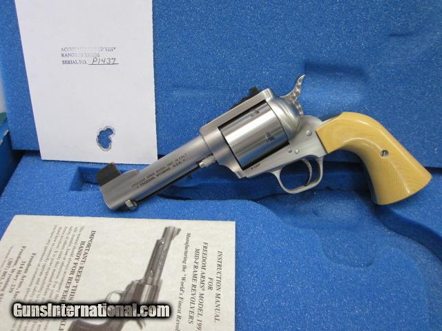 Description: Freedom Arms model 97 Premier .45 LC. with 4 1/4" barrel, factory action job with 3 lb trigger, Trigger overtravel screw, hammer and trigger polished and jewelled,Ivory(tan) micarta grips.Express rear sight with gold bead front. 100% new in box with full factory warranty.ADD 3% for credit cards, shipping is 35.00, 260 409 9828 SOLD |
