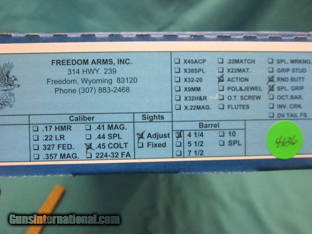 Description: Freedom Arms Model 97 Premier .45LC with 4 1/4" barrel, Round Butt Grip with Black Micarta grips, factory action job with 3lb trigger, 100% new in box with full factory warranty. ADD 3% for credit cards,shipping is 35.00. 260 409 9828 SOLD |