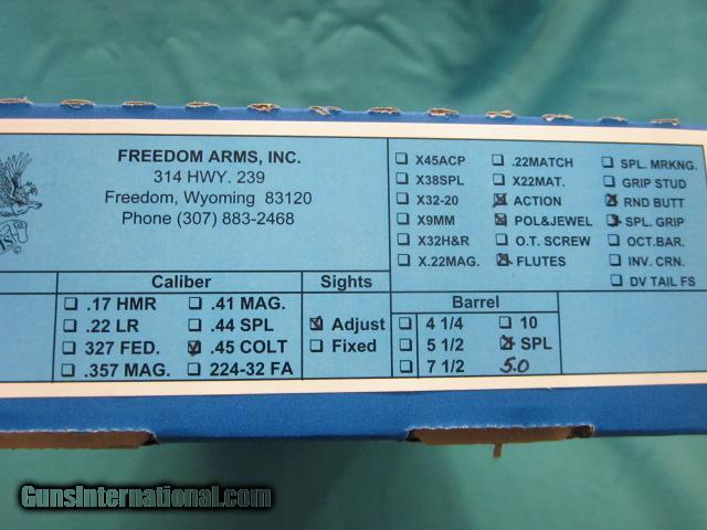 Description: Freedom Arms Model 97 Premier .45LC. with custom length 5" barrel Fluted cylinder, and extra gold bead front, Round butt grip with Black Micarta grips,hammer and trigger polished and jeweled, factory action job with 3lb trigger .100% new in box with full factory warranty,ADD 3% for credit cards, Shipping is 35.00. (260 409 9828) SOLD |