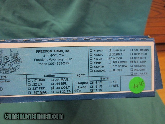 Description: Freedom Arms Model 97 Premier .45LC. 7 1/2" with trijicon mount factory installed, no sights., black micarta grips, factory action job with 3lb trigger. 100% new in box with full factory warranty. ADD 3% foe credit cards,shipping is 35.00. 260 409 9828 SOLD |