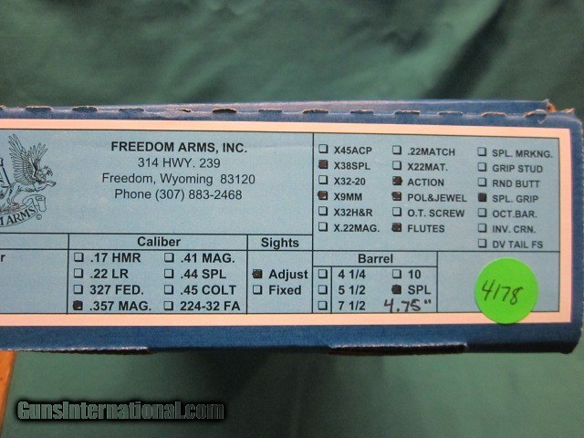Description: Freedom Arms Mopdel 97 Premier custom 4 3/4" .357 Mag. with extra .38 Special fluted cylinder and Extra 9mm fluted cylinder, Blak micarta grips, hammer and trigger are polished and jewelled, standard rear sight with green fiber optic front, factory action job with 3lb trigger. ADD 3% for credit cards,shipping is 35.00. 260 409 9828 SOLD |