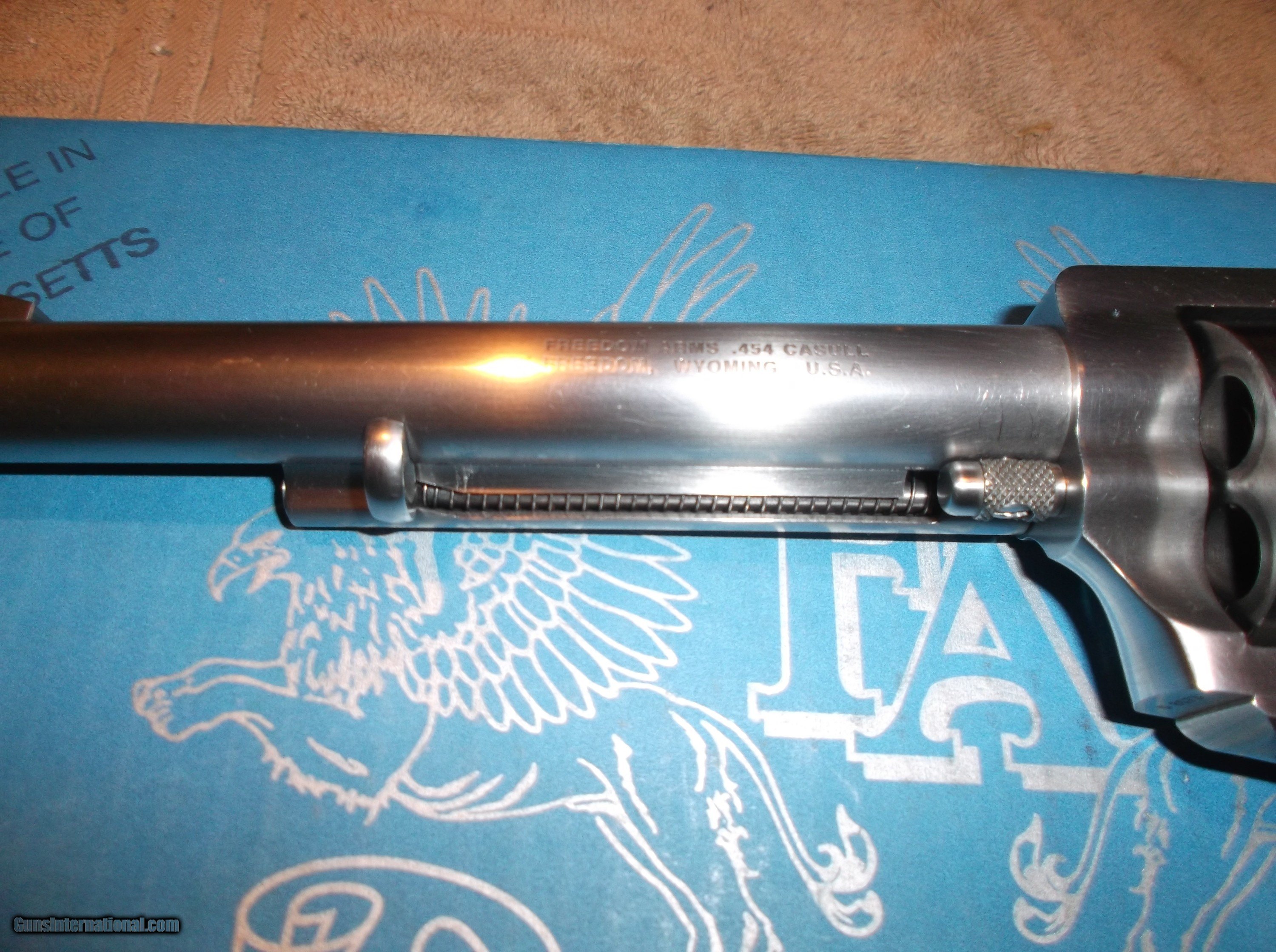 Description: freedom arms 454casull rev 71/2 bbl in like new cond no marks on metal or grips an early gun ser d85xx . priced to sell add 50.00 for shipping . in freedom arms box but ser# to gun SOLD Handgun Caliber: .454 Casull
