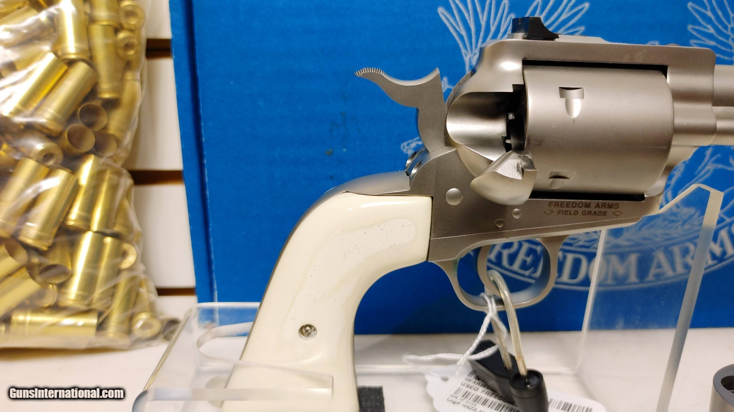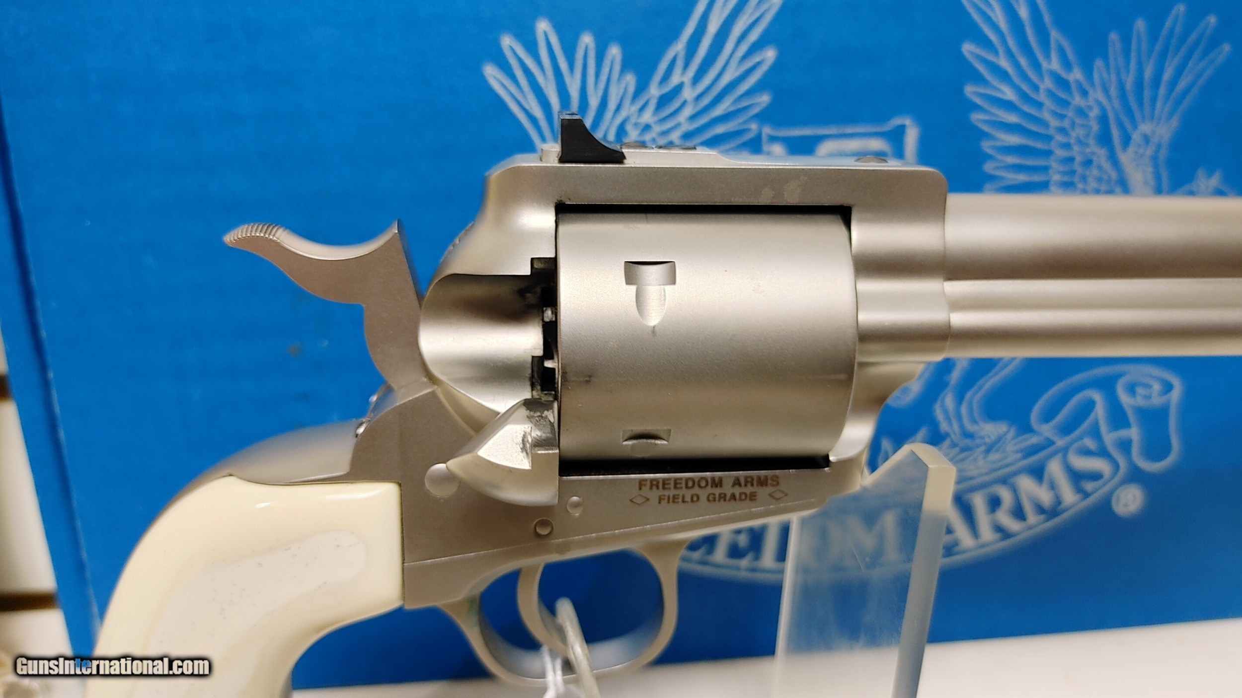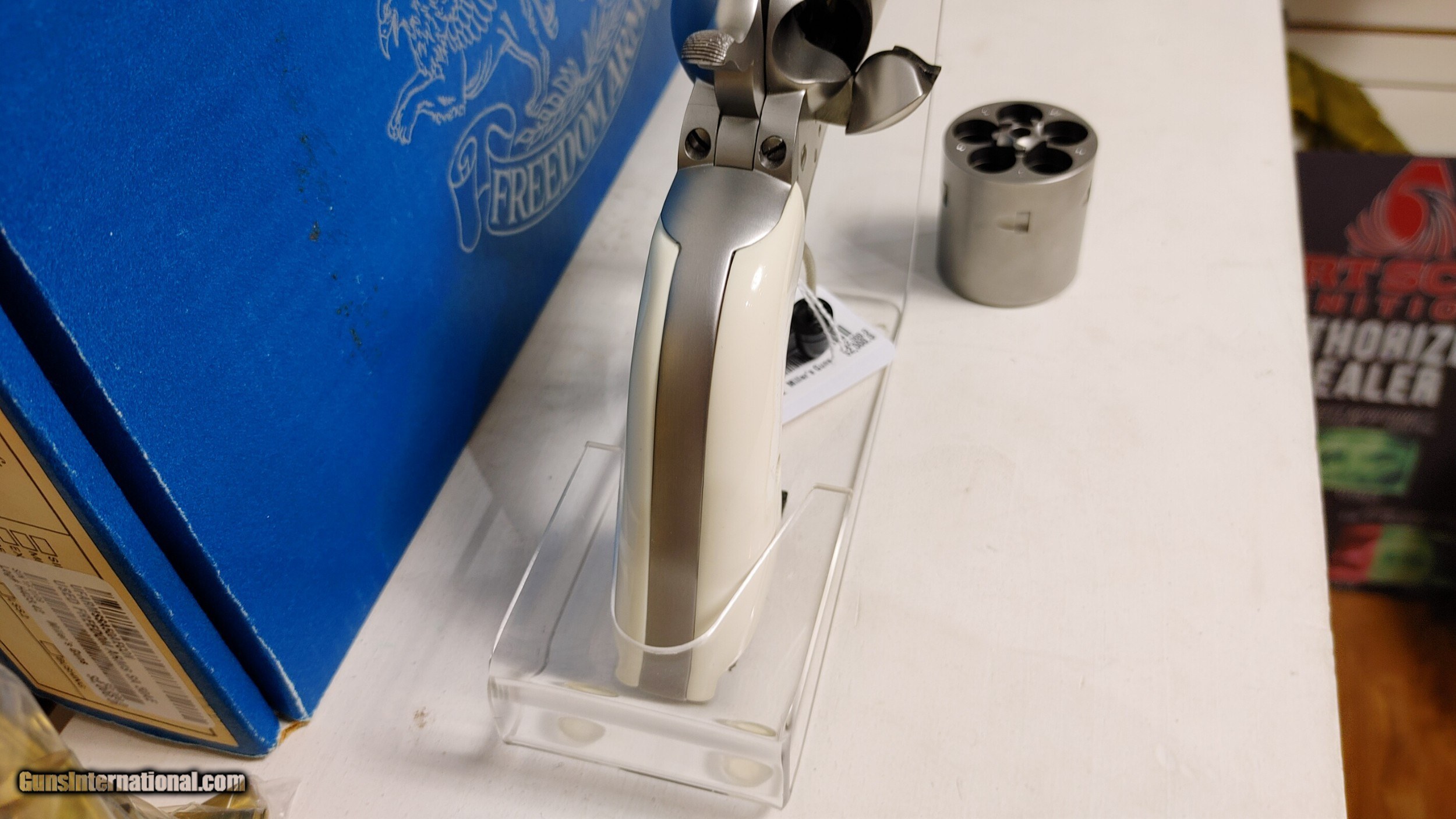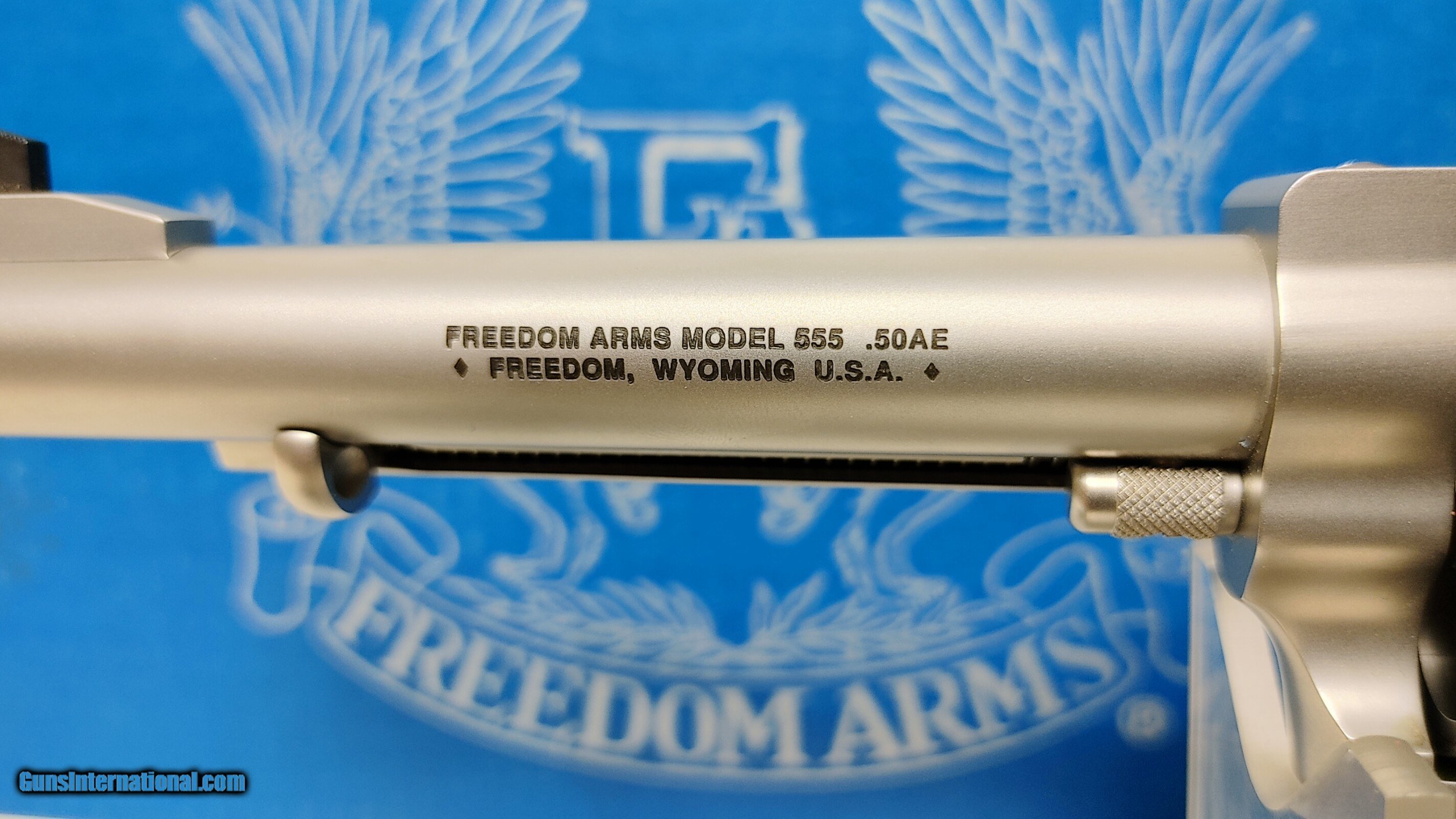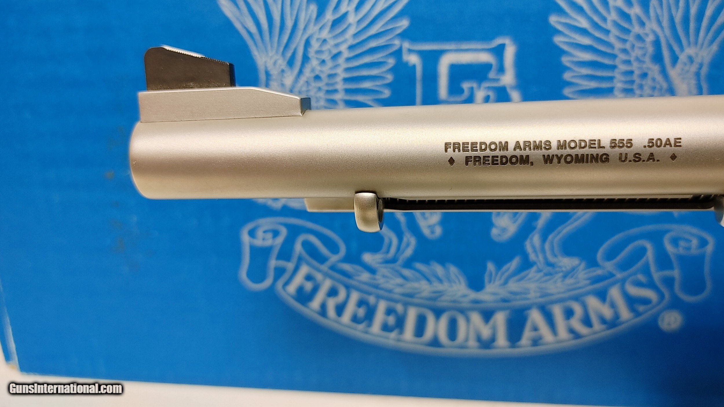Description: Lightly Used Freedom Arms Revolver 6" barrel convertable 2 cylinders 1 5 shot 50 AE 1 5 shot 500 Wyoming Express with 450 brass cartridges leather pouch original box very good condition Buyer pays shipping Millers Gun Center Located in New Castle, Delaware "Home of TAX-Free shopping" No Credit Card Fees SOLD Serial Number: 1F0109 |