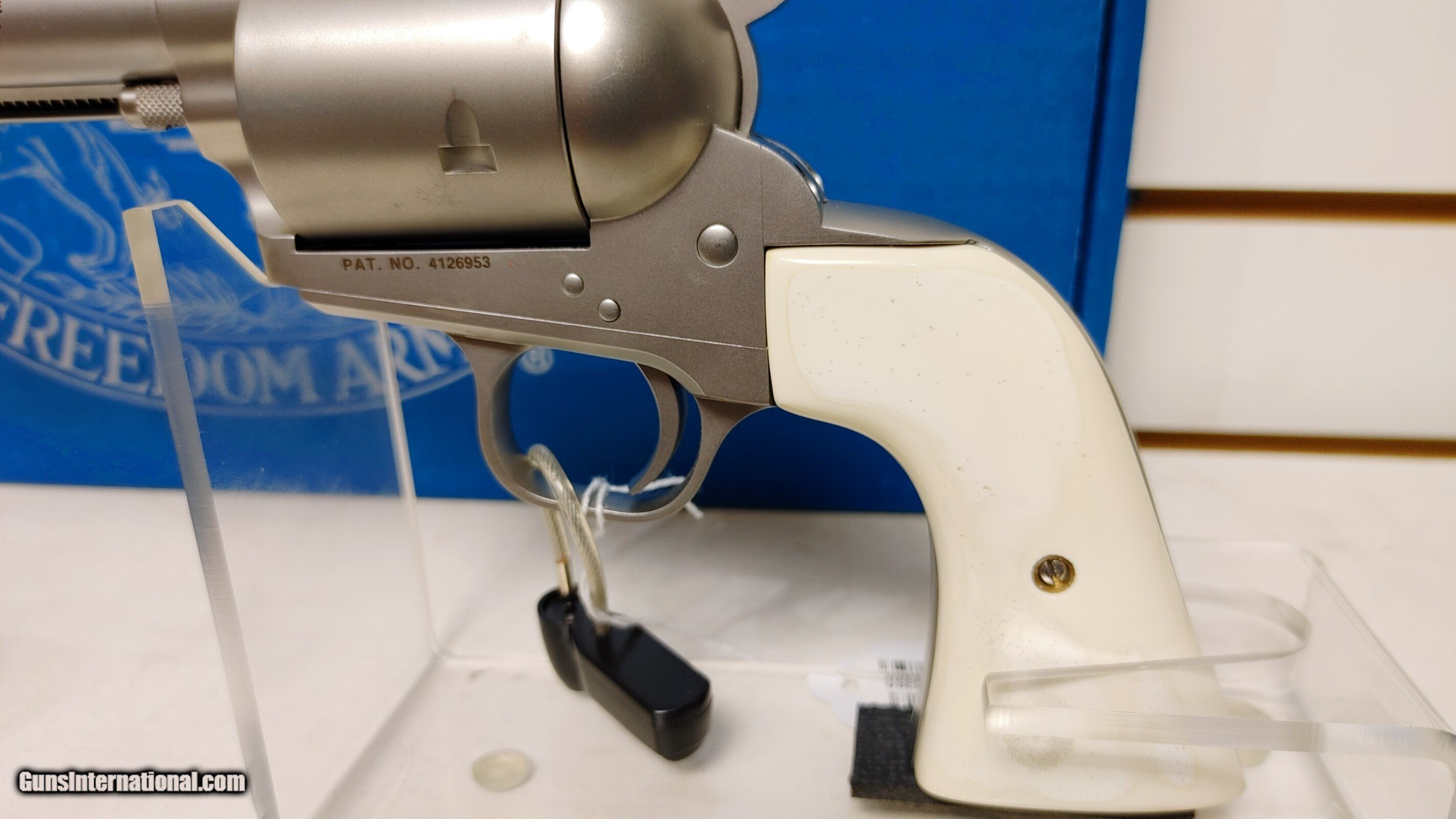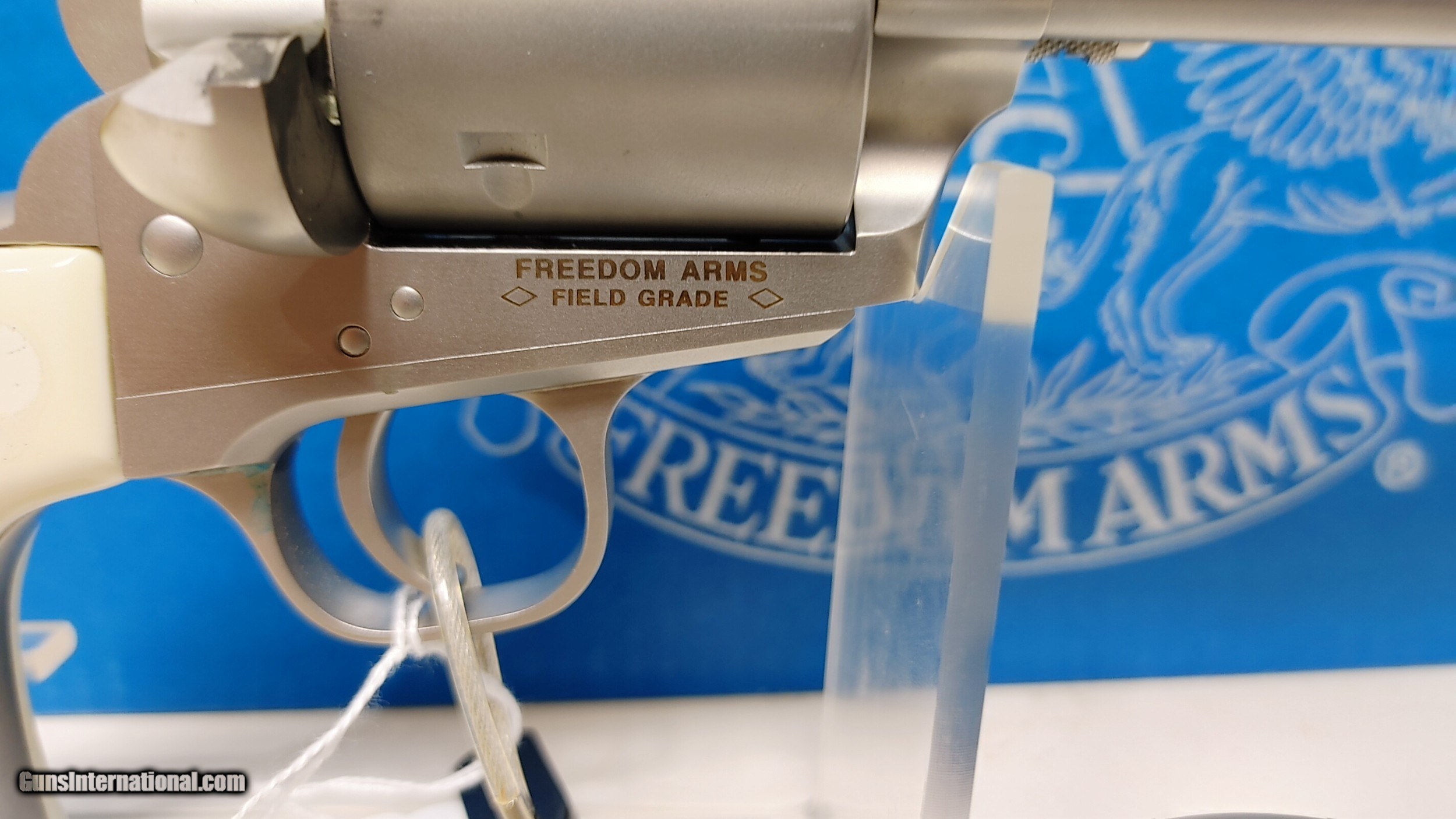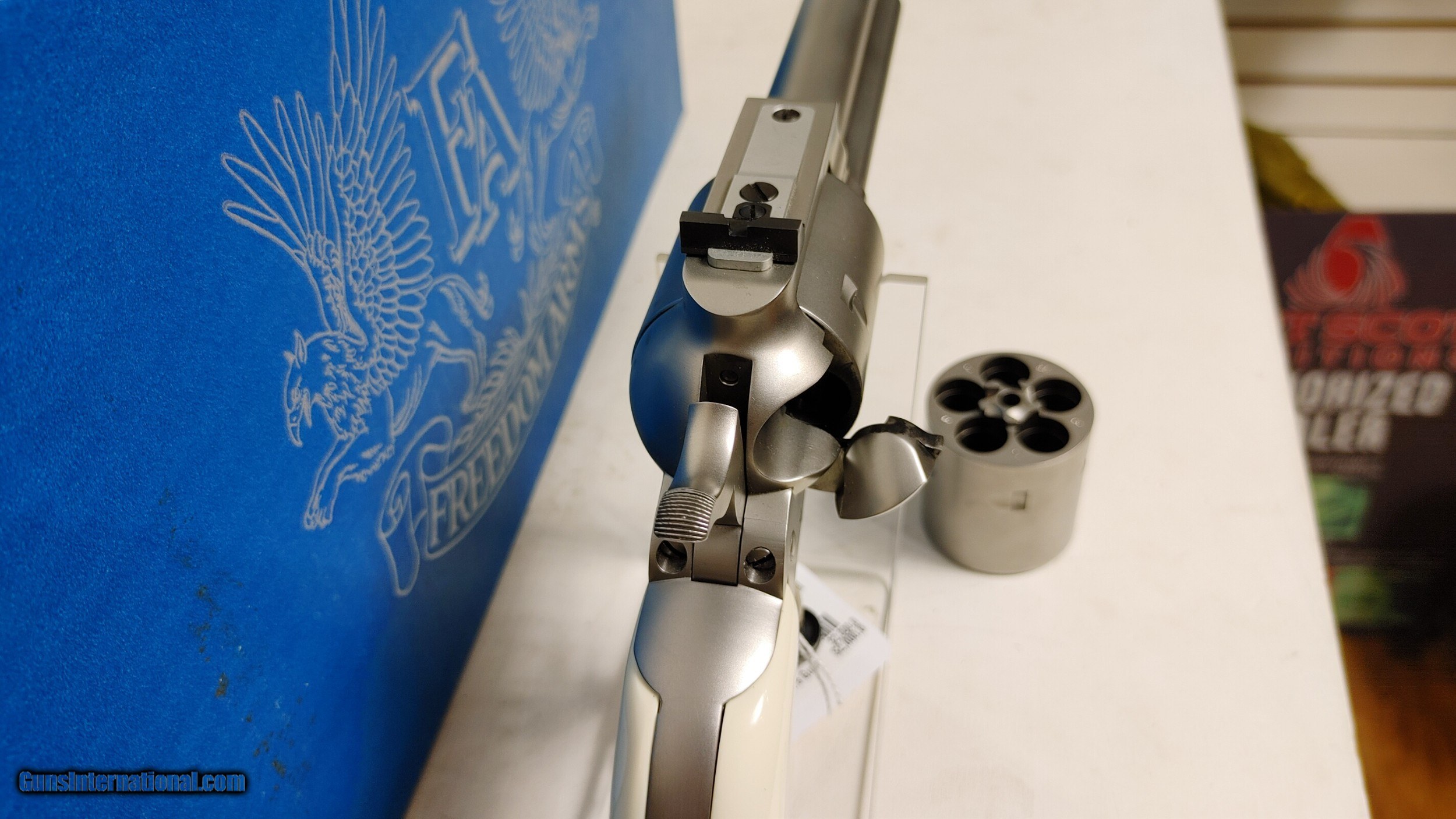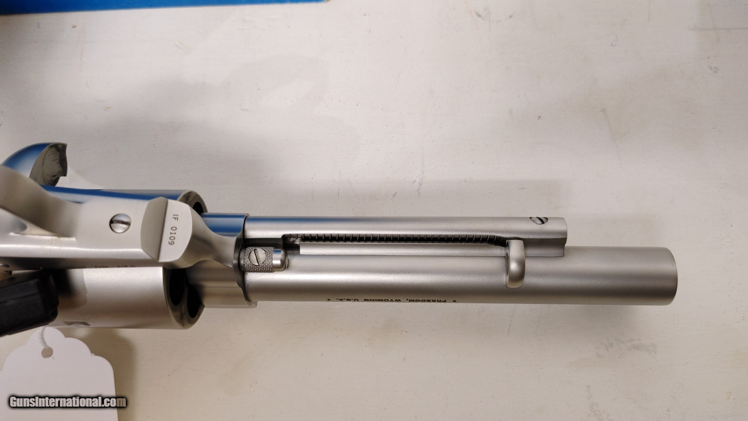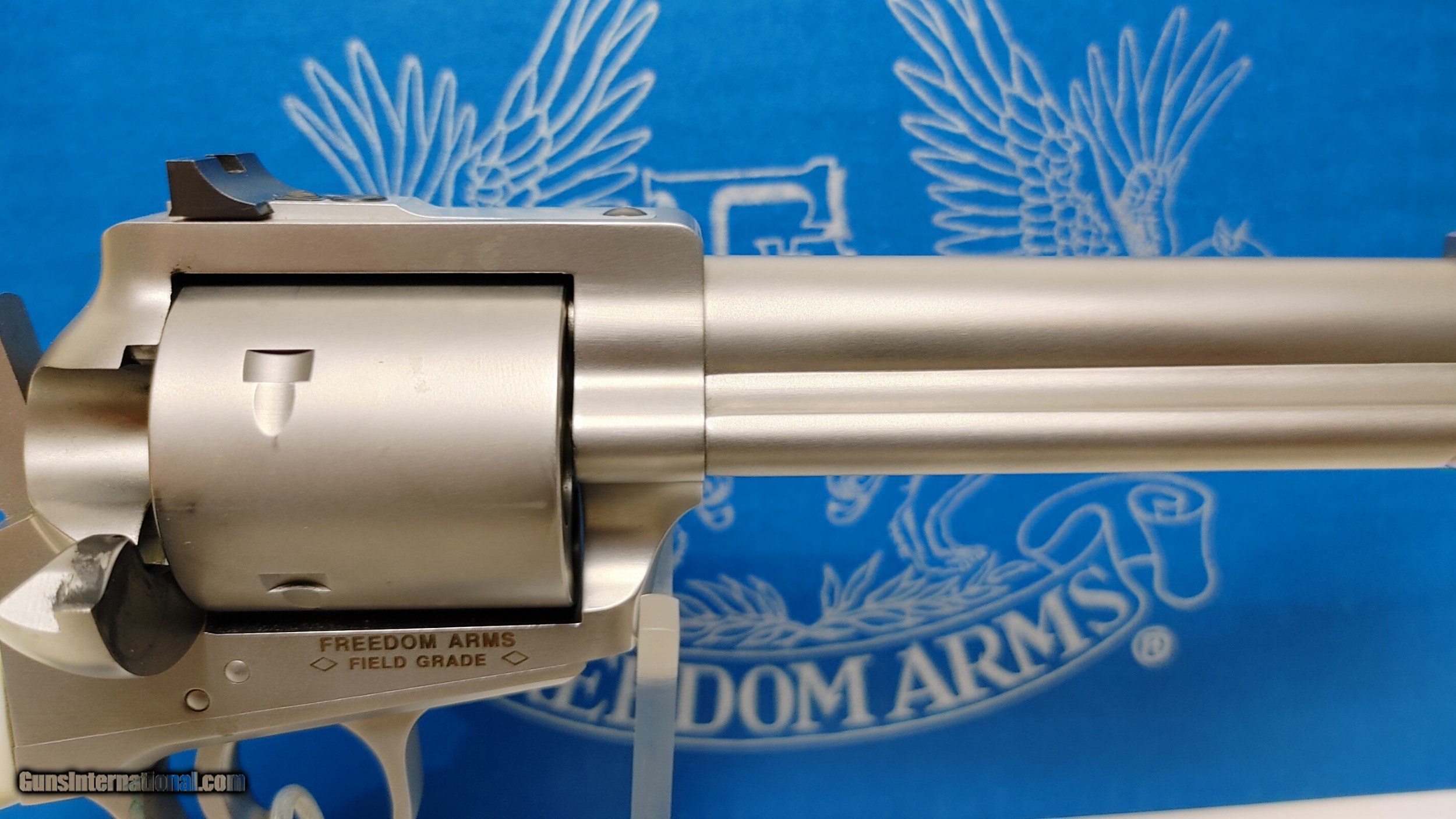 Description: Lightly Used Freedom Arms Revolver 6" barrel convertable 2 cylinders 1 5 shot 50 AE 1 5 shot 500 Wyoming Express with 450 brass cartridges leather pouch original box very good condition Buyer pays shipping Millers Gun Center Located in New Castle, Delaware "Home of TAX-Free shopping" No Credit Card Fees SOLD Serial Number: 1F0109 |