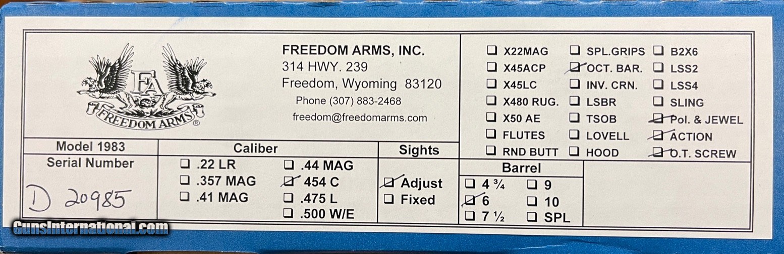 Additional Information SOLD Handgun Caliber: .454 Casull Manufacturer: Freedom Arms Model: Model 83 Premier Grade Serial Number: D20985 Condition: New |