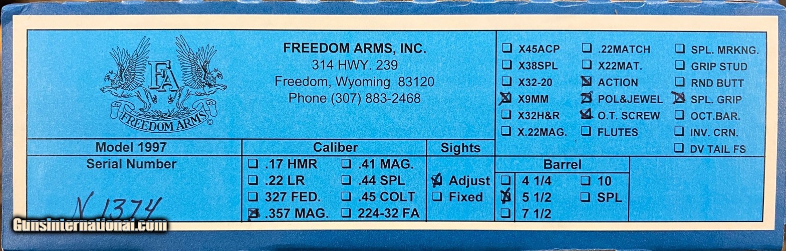 ADDITIONAL INFORMATION SOLD Handgun Caliber: .357 Magnum Manufacturer: Freedom Arms Model: Model 97 Premier Grade Barrel Length: 5.5 Condition: New |