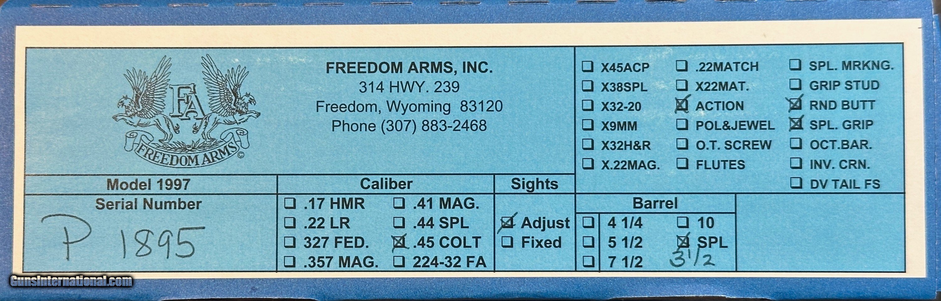 Handgun Caliber: .45 Colt Manufacturer: Freedom Arms Model: Model 97 Premier Grade w/ Many Upgrades Serial Number: P1895 Barrel Length: 3.5 Condition: New Price: $4,499.99 Shipping: $55.00 Buy Now Contact Seller |
