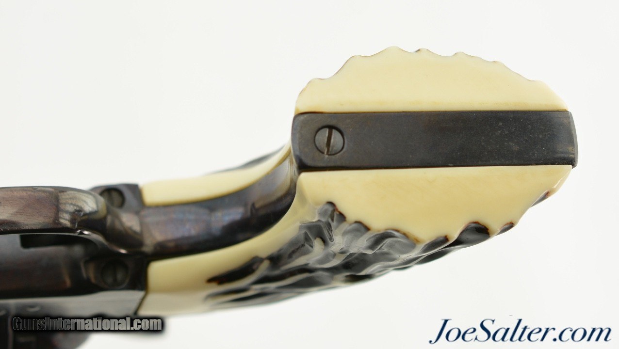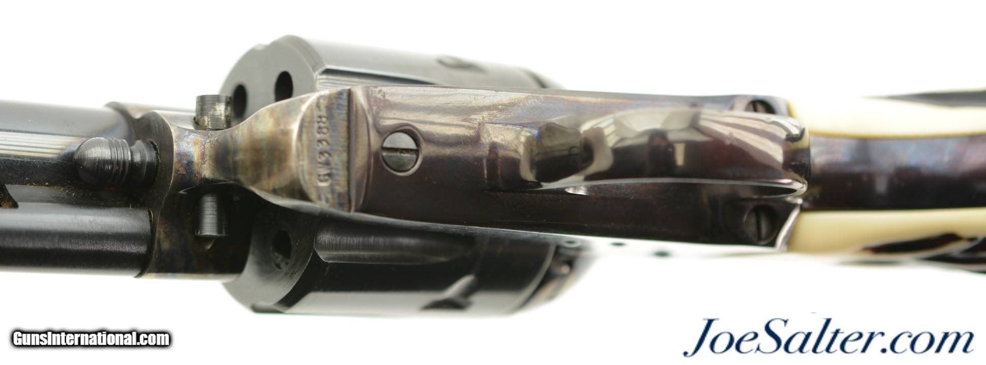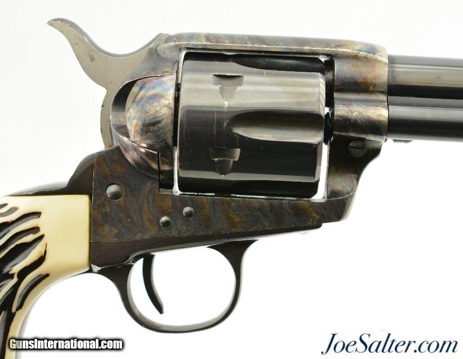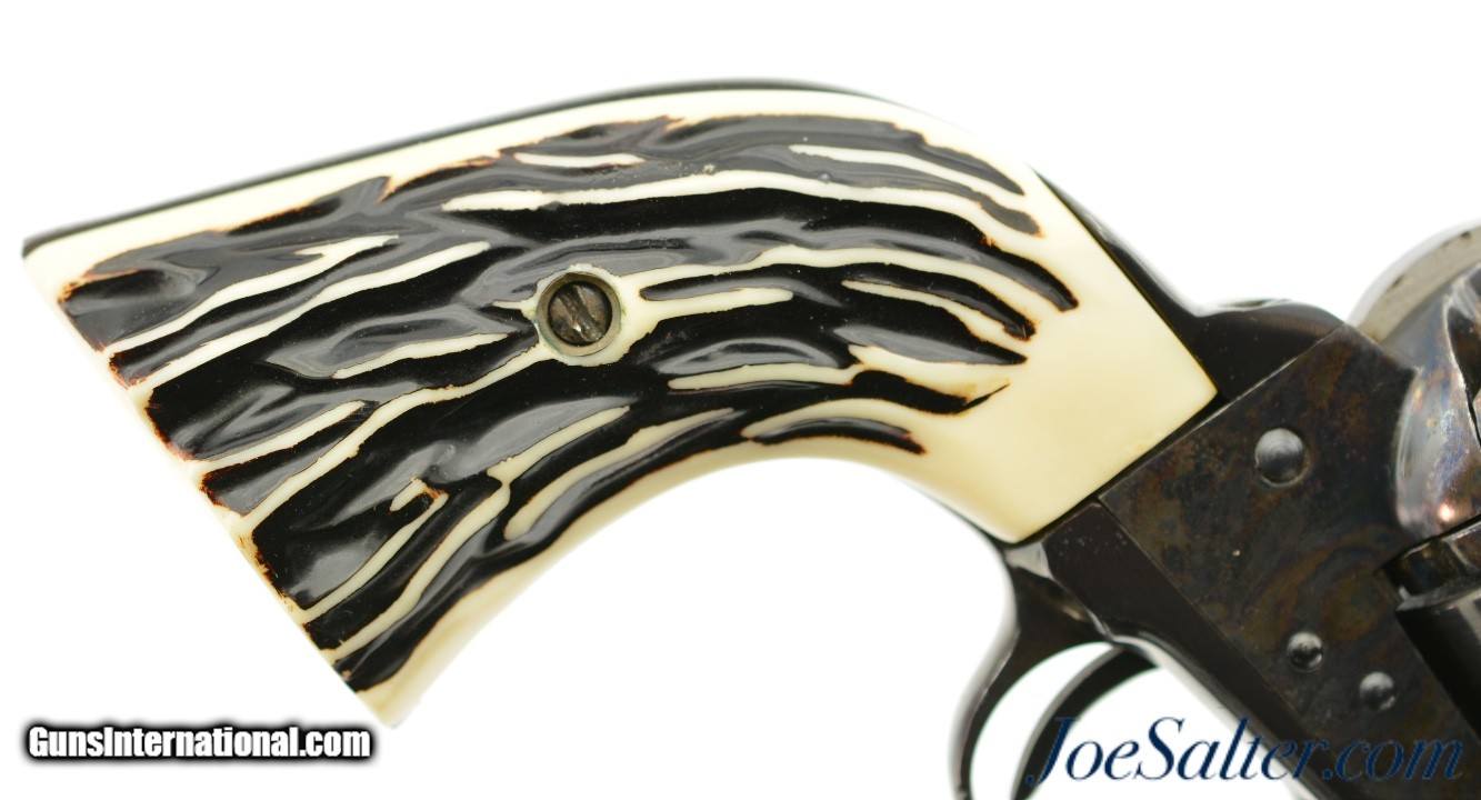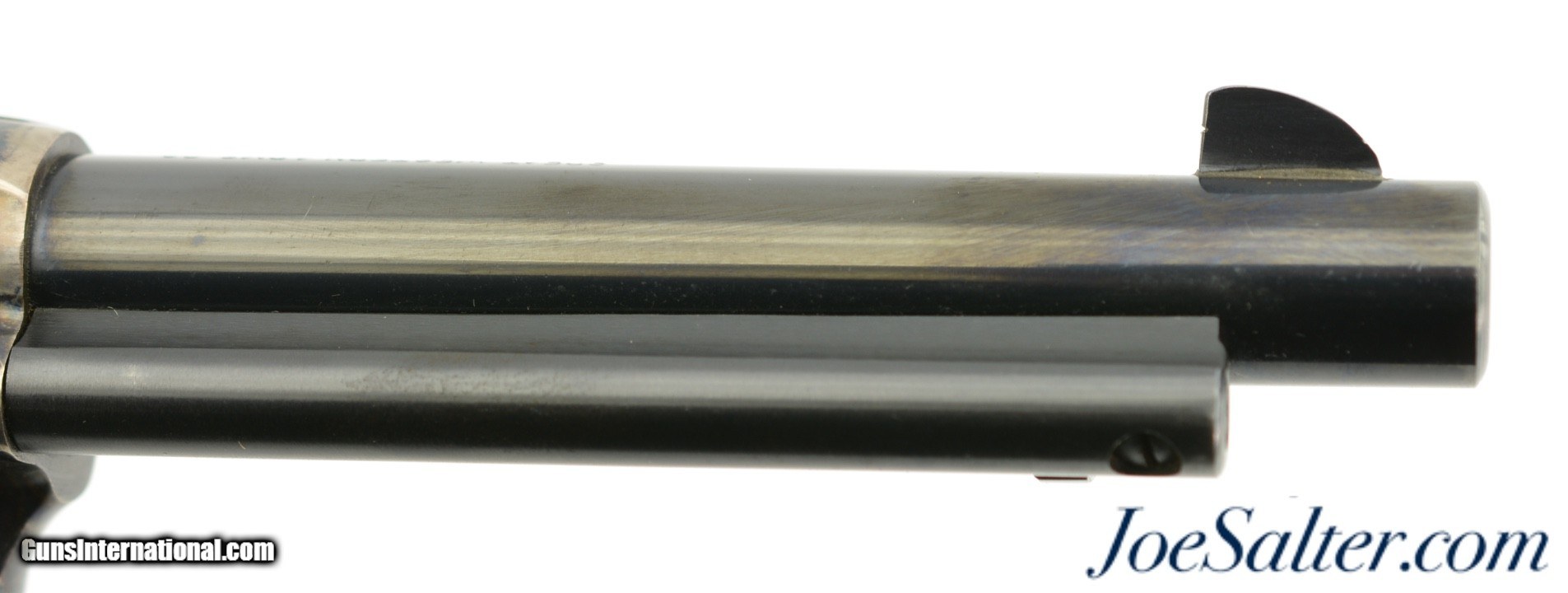 Description: Serial #GW3388, .22 LR, 5 ½ inch barrel with a bright, excellent bore. This is a 2nd year production Single Action Action revolver manufactured by the Great Western Arms Company in 1954. Produced to supply the great demand caused by the explosion of Western Movies and TV shows the Great Western Arms Co. began building copies of the famed Colt SAA Peacemaker revolvers. The SAA remains in excellent condition with the barrel and cylinder having 94-96% of the original blue finish with some light use and holster marks mostly on the cylinder with light turn marks. The grip frame is mostly a dark finish with spots of the brighter plum color that is typical of the early chemical mixtures they were working on perfecting with some light use marks. The frame shows the original vibrant case-hardened colors that are somewhat muted along the edges and toning to gray. The original faux stag grips rate excellent. Mechanically it functions properly with proper timing and lock up. It is well marked with "GREAT WESTERN ARMS CO" on barrel top with "22 CALIBER" on the side. A great looking example of these very collectible 22 Caliber 1950's revolvers. FFL or C&R SOLD Curio/Relic: Yes |