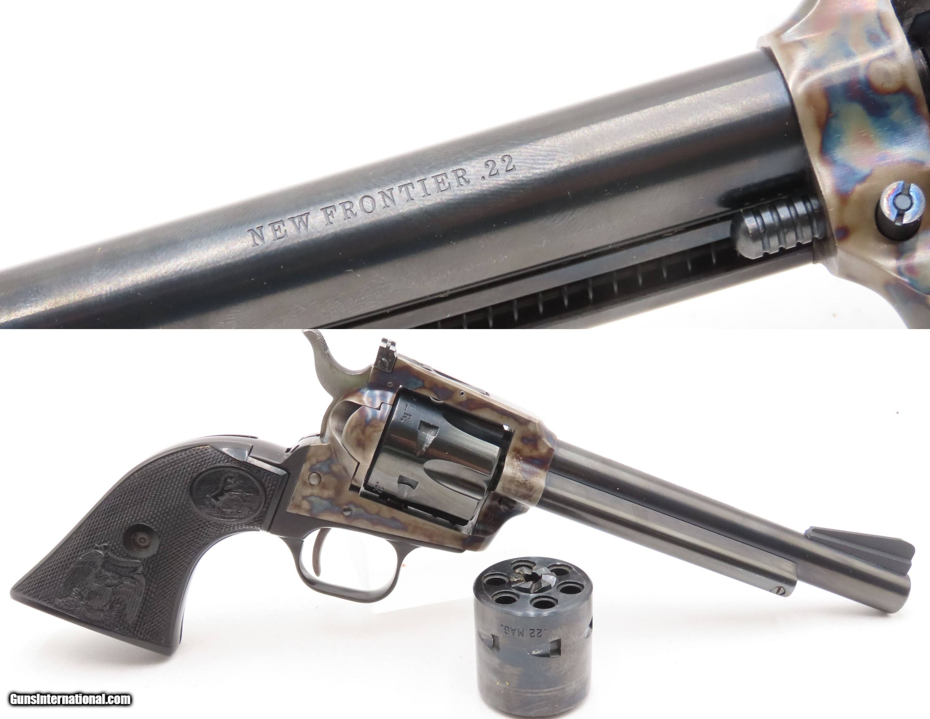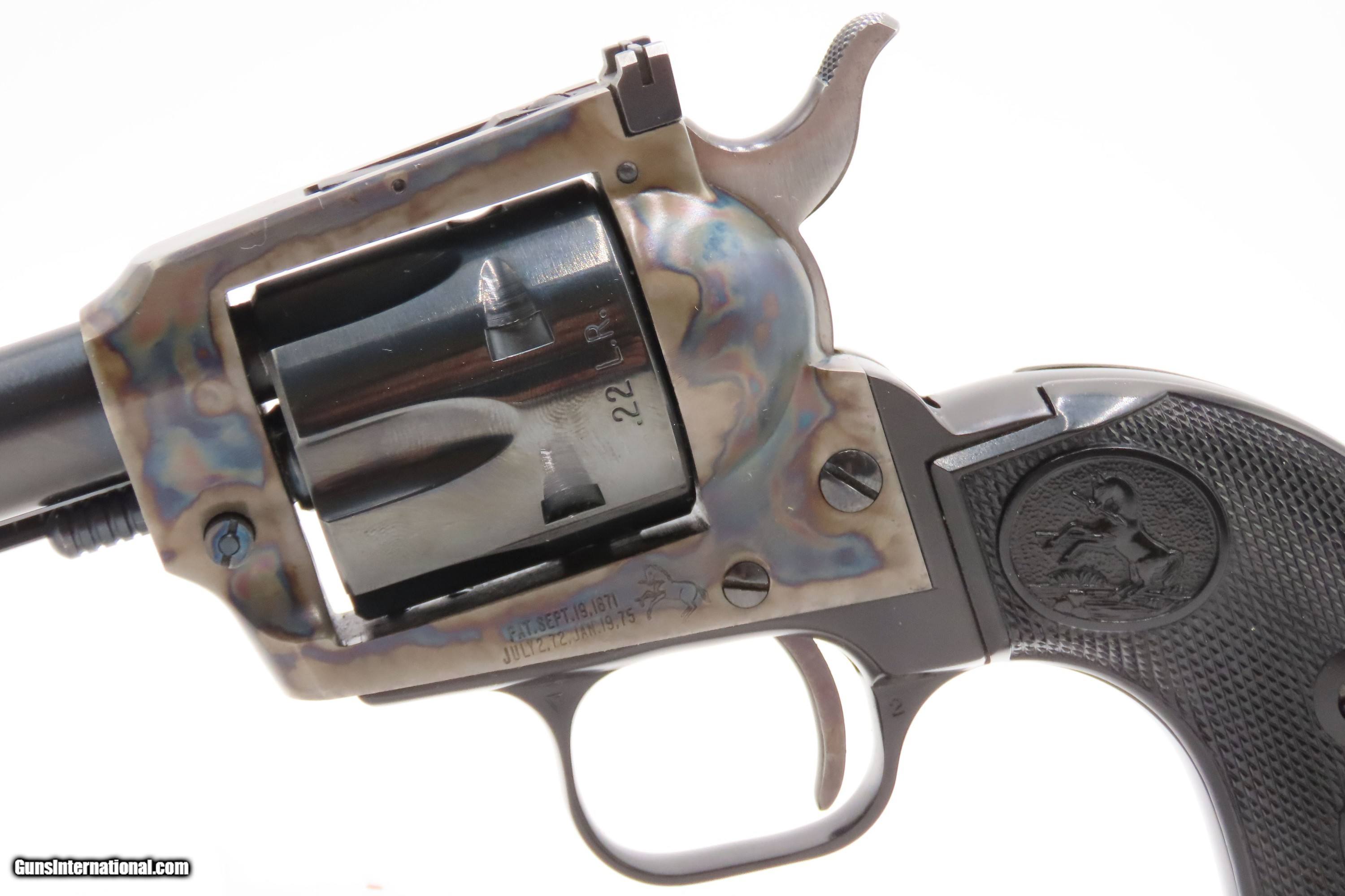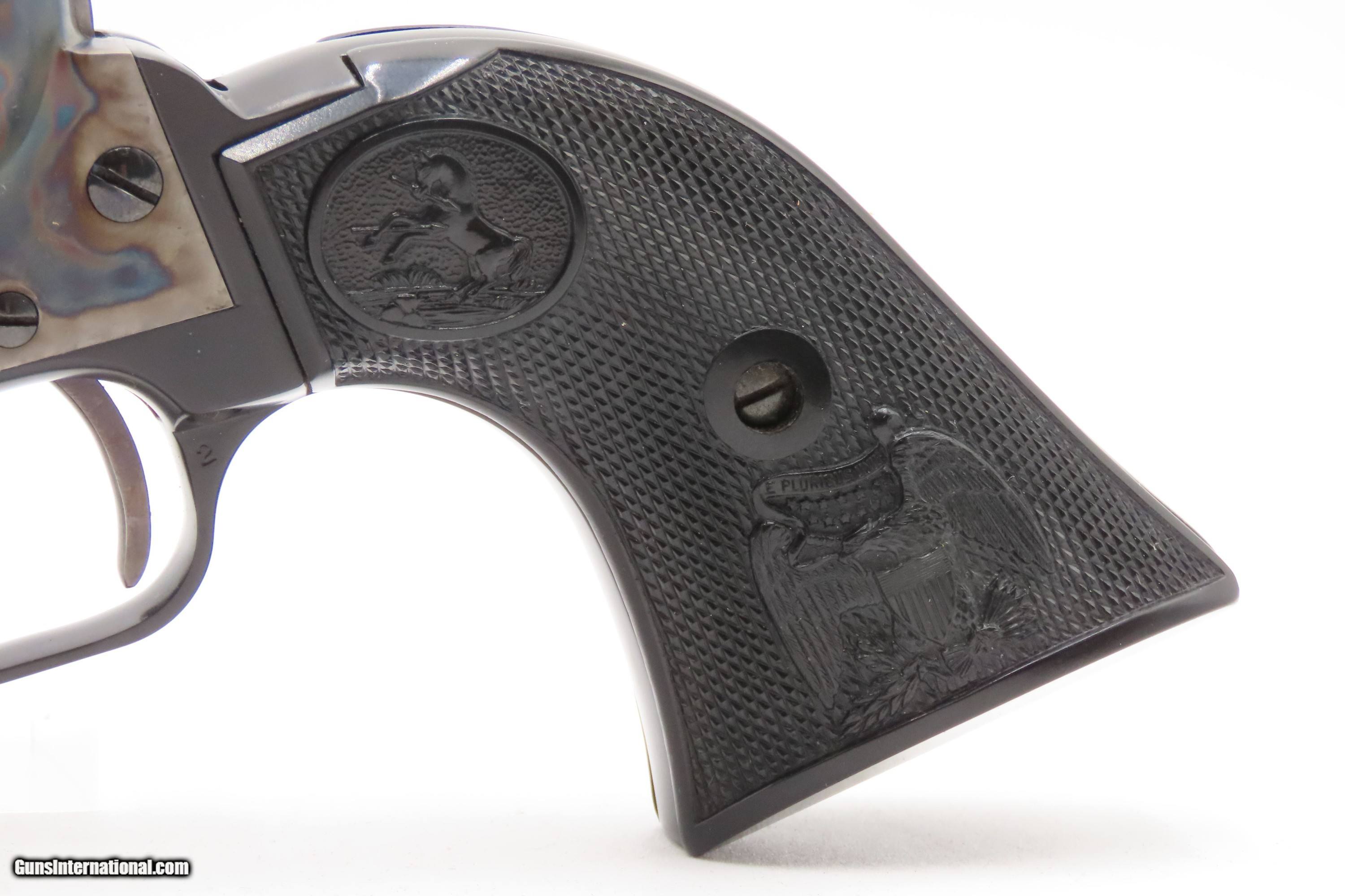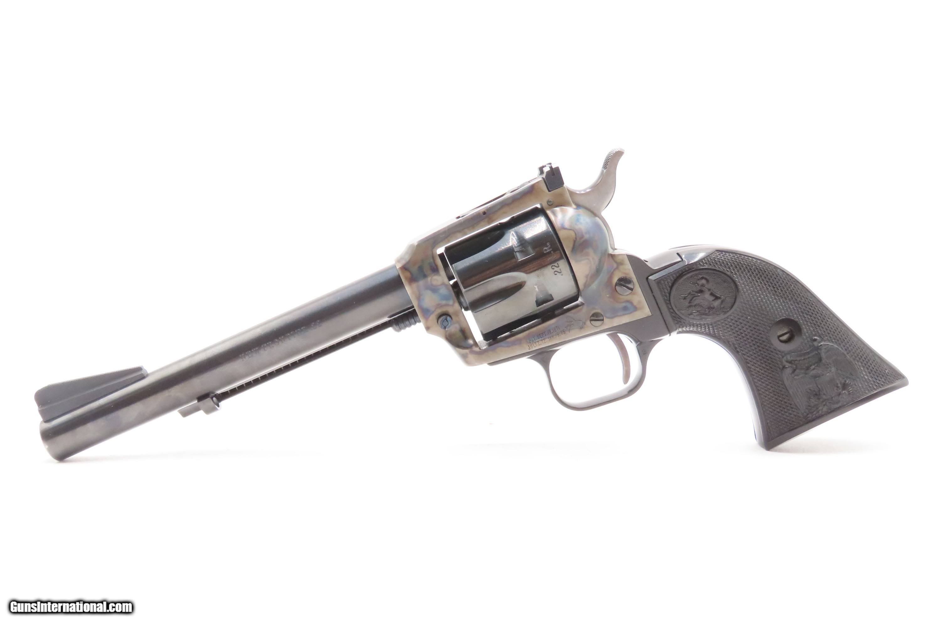 Description: 1971 mfr. COLT Single Action “NEW FRONTIER” .22 RF C&R Revolver 8-ShotTarget Shooter w/ EXTRA .22 MAGNUM CYLINDER Here Ancestry Guns presents a C&R Colt New Frontier Single Action Revolver, made circa 1971 by the Colt Manufacturing Company. The G series Peacemaker .22 and New Frontier .22 revolvers were introduced in 1970, and the first production serial number was G10001. These guns were a major change in Colt's .22 single action revolver line. They more resembled the full-size Single Action Army revolvers because the receivers and loading gates were made of steel and were case hardened in colors. The Peacemaker .22 had fixed sights like the previous Frontier Scouts, but the New Frontier .22 used a ramped front sight and the same adjustable Accro rear sight that was used on many other Colt handguns at the time. All revolvers were marked “.22” on the barrels but were shipped either with the .22 LR cylinder alone or as combinations with .22 LR and .22 Magnum cylinders, as is this example. There were no .22 Magnum-only G series revolvers produced. The overall condition is excellent. Original finishes and case colors. Excellent action. Bright, shiny bore with crisp rifling. Very fine grips. Markings are sharp. The included .22 Mag. Cylinder is excellent. The box is fine. Own the original! This firearm is classified as a Curio & Relic. Barrel is 6 inches. Caliber: .22 Long Rifle Rimfire and .22 Magnum Rimfire Overall condition as seen in photos. Very Fast. Very Safe. FREE SHIPPING. Will need to be sent to your local FFL or C&R licensee. This firearm is classified as a Curio & Relic. Guaranteed AUTHENTIC & Includes CERTIFICATE OF AUTHENTICITY. $1500 #259773 Curio/Relic: Yes Price: $1,500.00 Buy Now Pay with