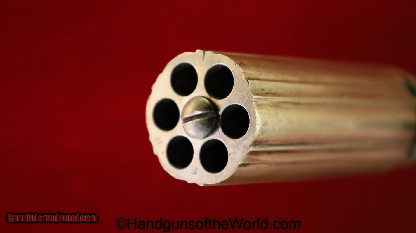 Description: Blunt & Syms Under Hammer Pepperbox, 31 caliber percussion. Unmarked but for the serial number. This sports the long bag type grip with smooth walnut panels, and 3 1/2″ barrels. The frame has some engraving. Overall VG and works properly. Antique. Antique: Yes Manufacturer: Blunt & Syms Model: Under Hammer Pepperbox Price: $975.00 Shipping: $35.00 Contact Seller |
