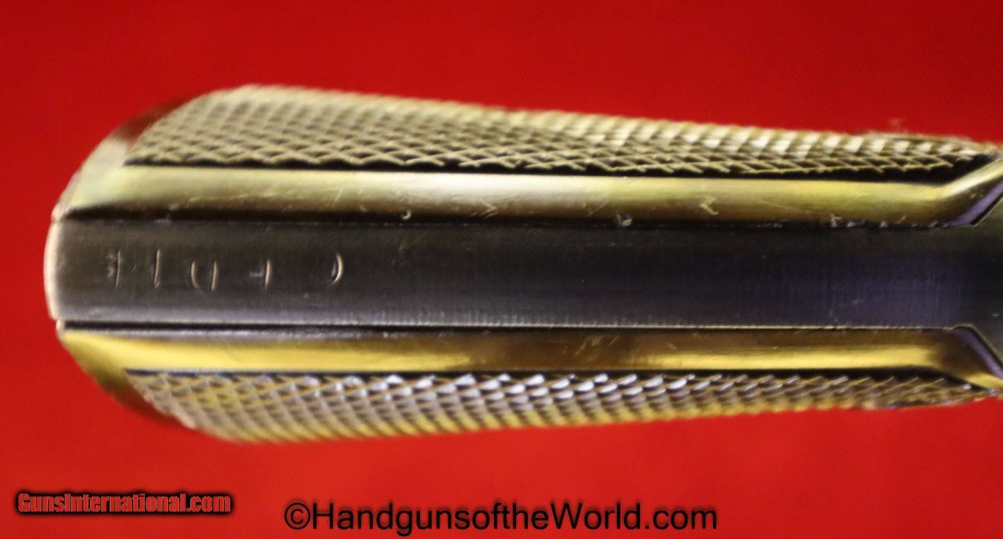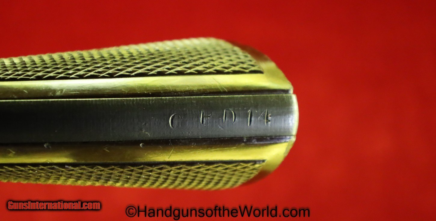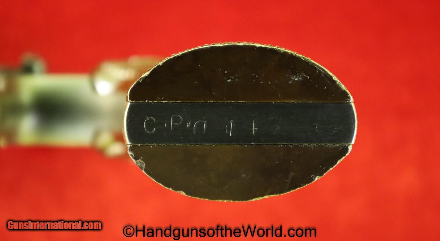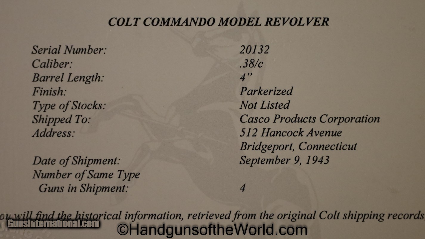 Description: Colt Commando, .38 special. Built in 1943 with the 4″ barrel and brown Coltwood grips. This has the US military inspection Flaming bomb proof on the left side of the frame. The back strap and the butt is non factory stamped CPD-14. The Colt factory archive letter indicates that this was shipped to Casco Products Corp, manufacturer of armor piercing bullets for the US Military. The finish rates about 98% and the bore is excellent. Curio/Relic: Yes Handgun Caliber: .38 Special Manufacturer: Colt Model: Commando Price: $1,975.00 Shipping: $35.00 Contact Seller |