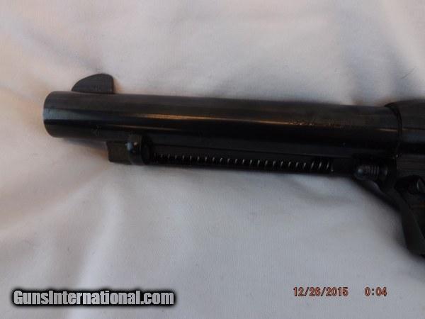 Description: Beautiful and hard to find Great Western in .357 Atomic caliber. 5 1/2" barrel and in it's original box. Serial number 14947 was produced in 1957 in Southgate, California. Condition is very good with a light turn ring on the cylinder. I would rate it at 98%. This is the gun used in many of the TV Westerns of the 50's and 60's. SOLD Curio/Relic: Yes |