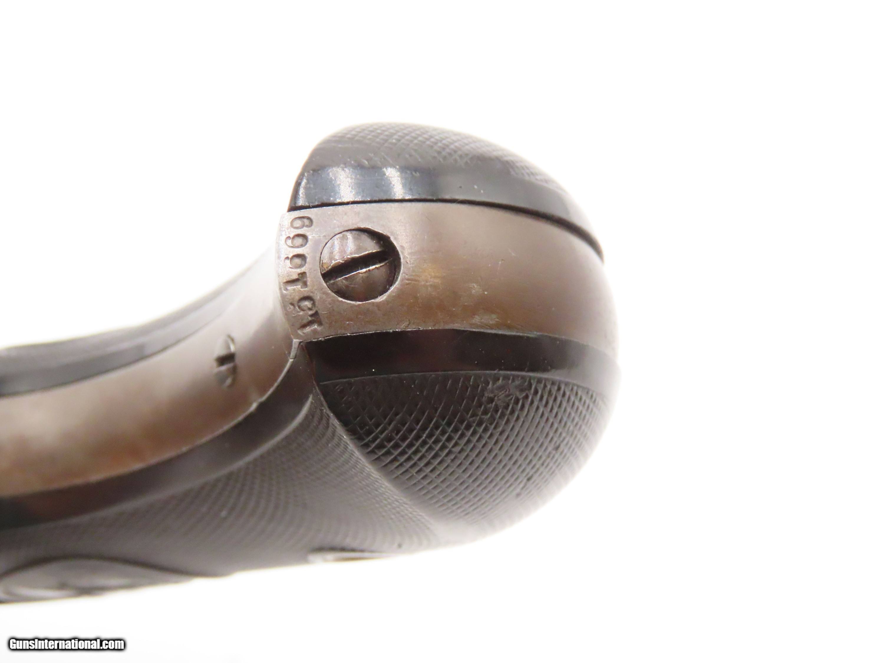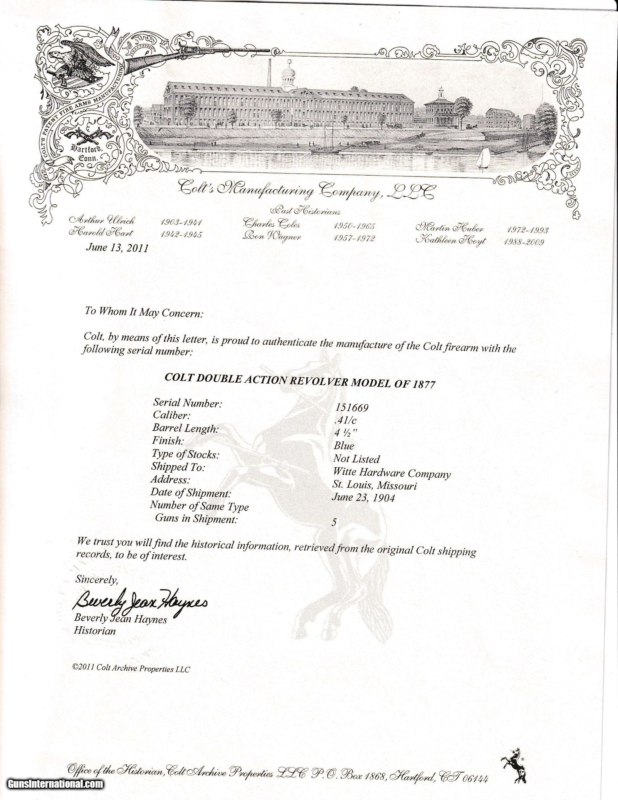 Description: LETTERED COLT M1877 THUNDERER .41 Colt DOUBLE ACTION Revolver C&R Shipped to WITTE HARDWARE in STL, MO in 1904 During the World’s Fair Here we present a C&R Colt Model 1877 Thunderer Double Action Revolver, made in 1904 in Hartford, Connecticut. The Model 1877 was Colt’s first venture into double action revolvers. It was quite successful, selling 166,849 from 1877 through 1909. Nonetheless, there was some hesitation to move away from the single action mechanism, which had so proven itself. Famous adopters of the Lightning were William “Billy the Kid” Bonney and John Wesley Hardin, along with “Doc” Holliday. Doc’s weapon of choice early in his western career was an 1851 Colt Navy revolver. Later, Doc carried a nickel-plated .41 caliber Colt Thunderer or the .38 caliber Colt Lightning. The Model 1877 was designed in 1876 by William Mason and was offered in three different calibers with production beginning in January 1877, which led to the three unofficial names. None of the nicknames were ever used by the factory in any reference materials. The 1877 "Thunderer” in .41 caliber was the preferred weapon of Billy the Kid and was his weapon of choice when he was killed by Pat Garret in 1881. The included Factory Letter confirms the serial number, caliber, barrel length, finish, and its June 23, 1904, date of shipment to Witte Hardware Company of Saint Louis, Missouri. What a perfect moment to place an order for a new batch of revolvers — during the 1904 World’s Fair, officially the Louisiana Purchase Exposition! This extraordinary event featured the newest innovations, cultural exhibitions, and stunning architectural achievements from around the globe. It was at this fair that the ice cream cone was first introduced, and the hamburger and hot dog made their debut as popular foods. It’s easy to imagine that Witte Hardware was a busy little shop bustling with activity during this exciting time! The overall condition is good. The original finish has matured to mixed brown and gray patina. The action only functions in double action. Bright bore with sharp rifling. Markings are legible. Numbers match. Both grips show light evidence of handling wear. Own the original! This firearm is classified as a Curio & Relic. Barrel is 4-1/2 inches. Caliber: .41 Colt Overall condition as seen in photos. Very Fast. Very Safe. FREE SHIPPING WORLDWIDE. Delivered directly to your door by express mail! Guaranteed AUTHENTIC & Includes CERTIFICATE OF AUTHENTICITY. ancestryguns $2100 #250589 Curio/Relic: Yes Price: $2,100.00 Buy Now Pay with