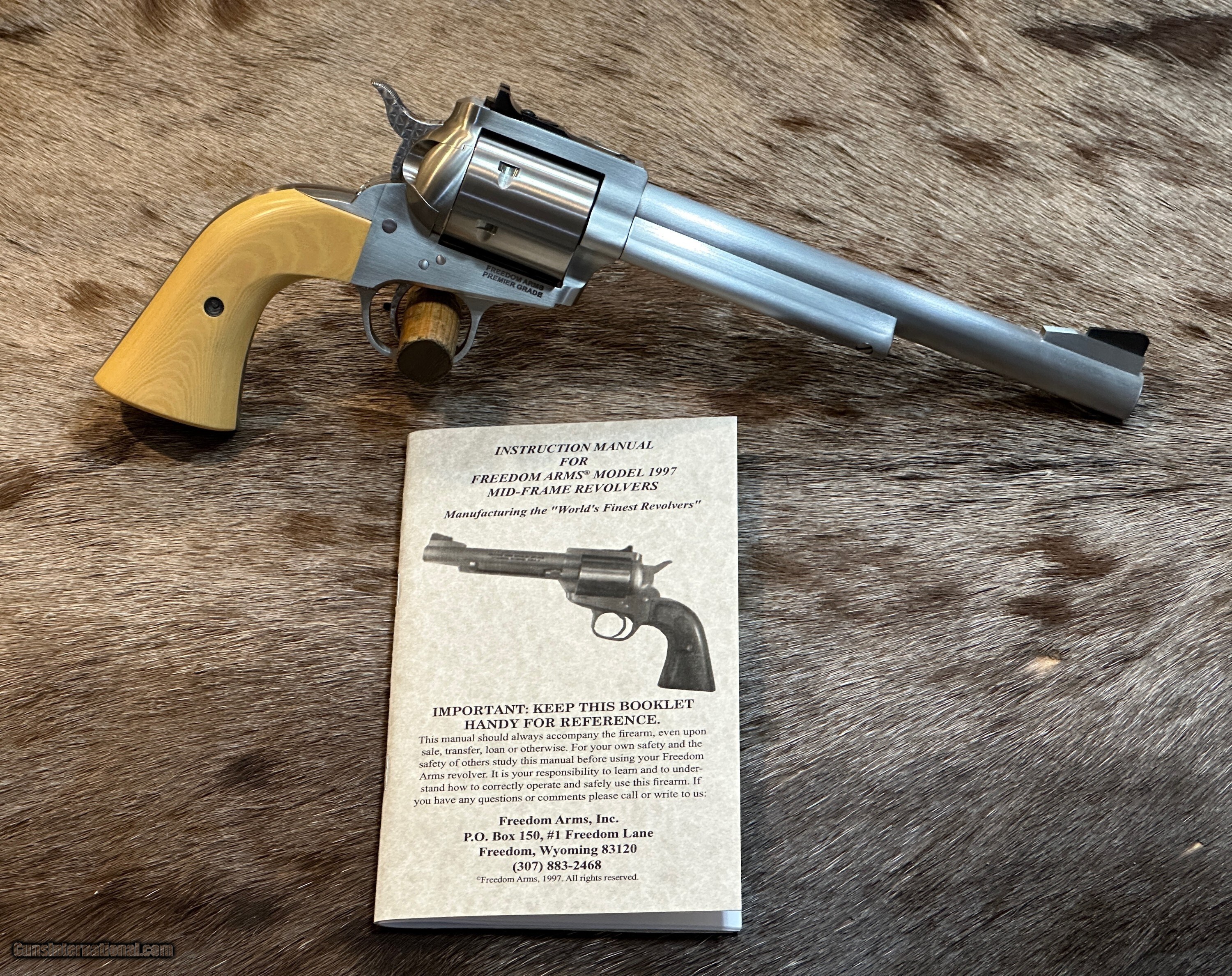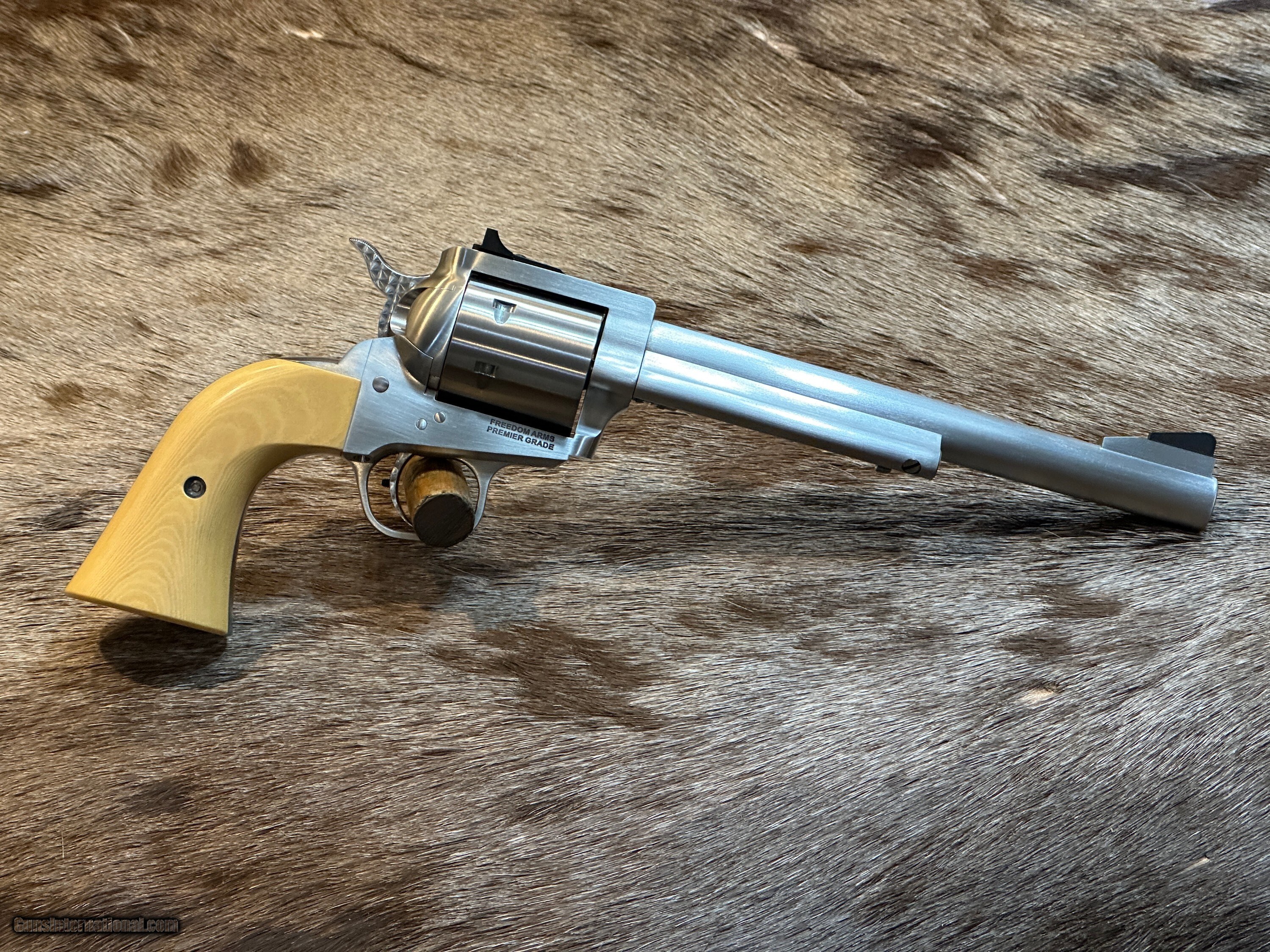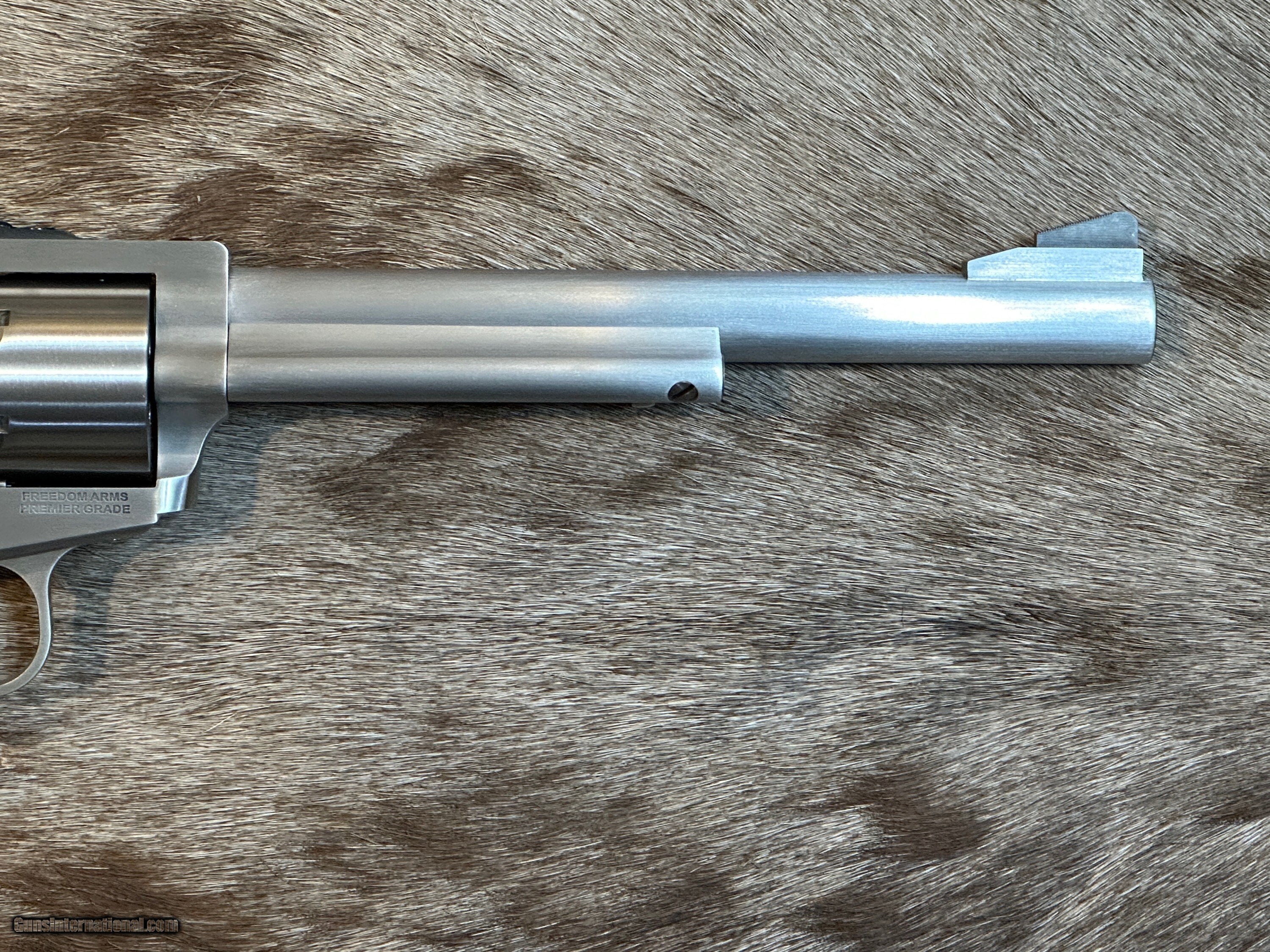 Description: NEW FREEDOM ARMS MODEL 97 PREMIER GRADE 17HMR 7.5" BARREL WITH MANY UPGRADES - LAYAWAY AVAILABLE FREE AFRICAN SAFARI WITH KUCHE SAFARIS (: KUCHE.CO.ZA) INCLUDED WITH THIS RIFLE! SAFARI IS FOR 1-HUNTER / 5-DAYS / 3-ANIMALS (IMPALA, BLESBUCK, WARTHOG). SAFARI IS CUSTOMIZABLE WITH AS MANY ADDITIONAL DAYS AND ANIMALS AS YOU WANT. THE CERTIFICATE IS GOOD FOR 3-YEARS FROM DATE OF PURCHASE AND WILL BE EMAILED TO YOU. NOTE: THE SAFARI IS FREE AND DOES NOT ADD ANY COST TO THE FIREARM. The Premier Grade has a bright, brushed finish with more attention to cosmetic details. Premier Grade rear sights are screw adjustable for elevation and windage. Premier Grades have a limited lifetime warranty to the original owner. All Model 97’s have a transfer bar safety. FEATURES OF THIS GREAT AMERICAN-MADE REVOLVER INCLUDE: